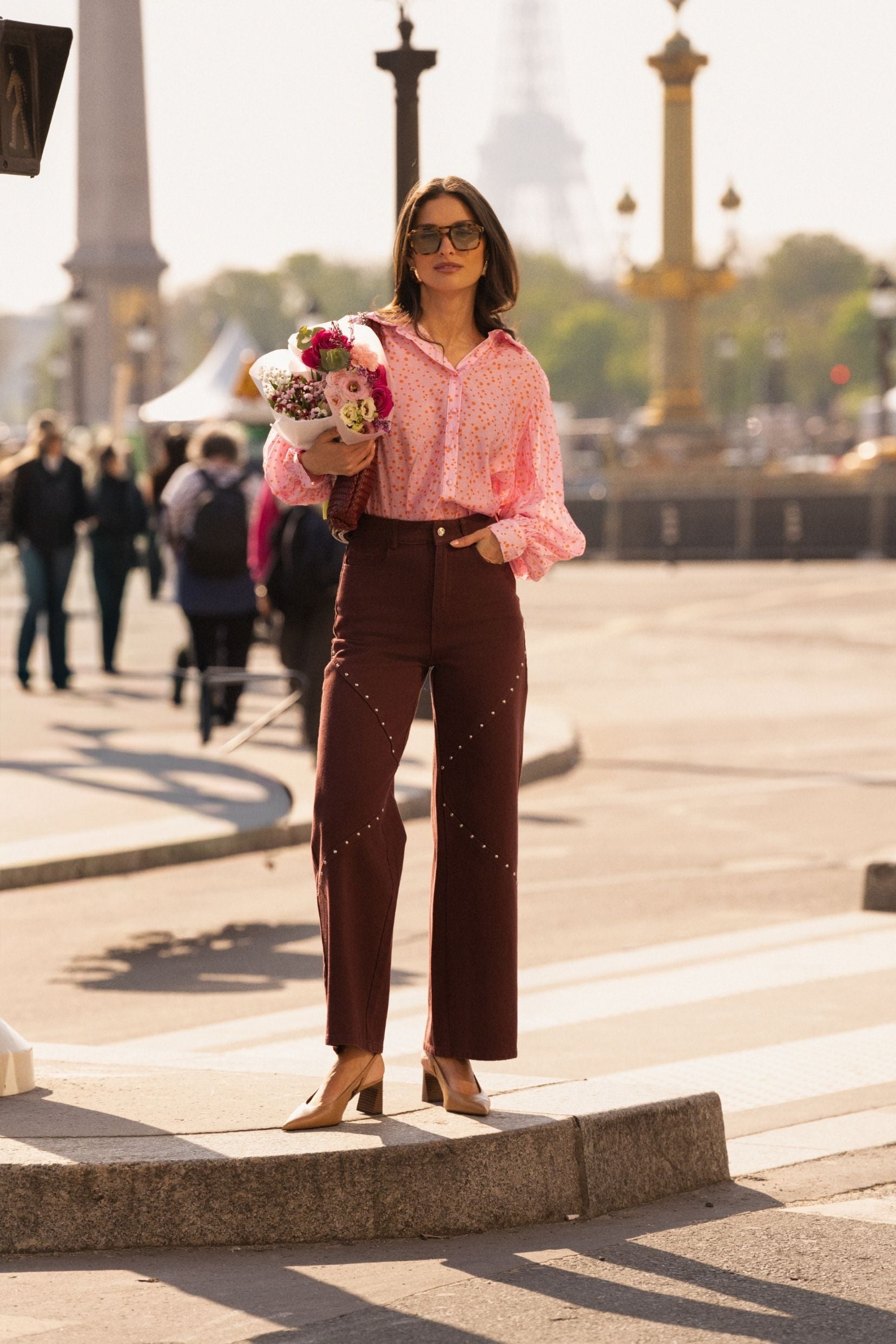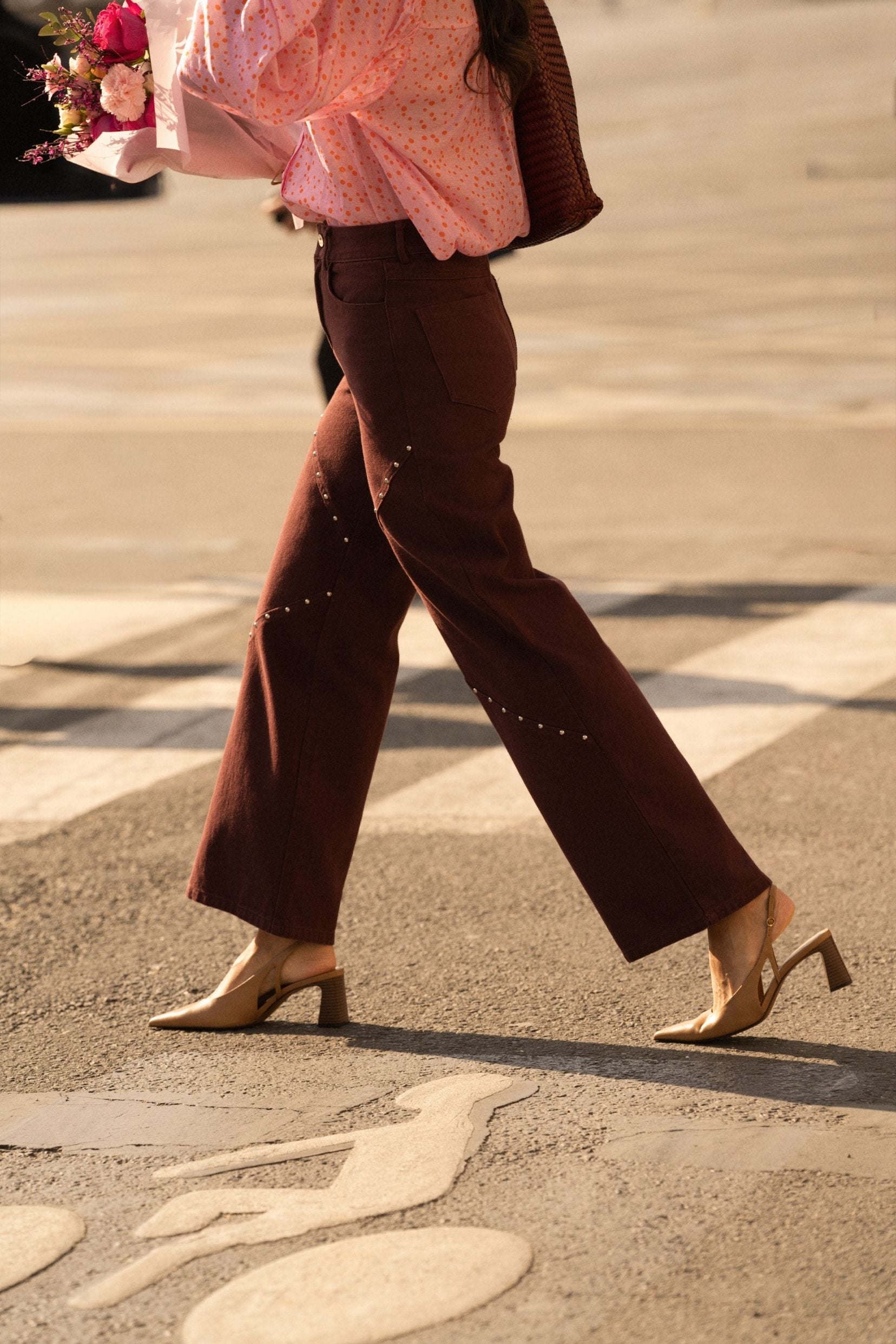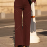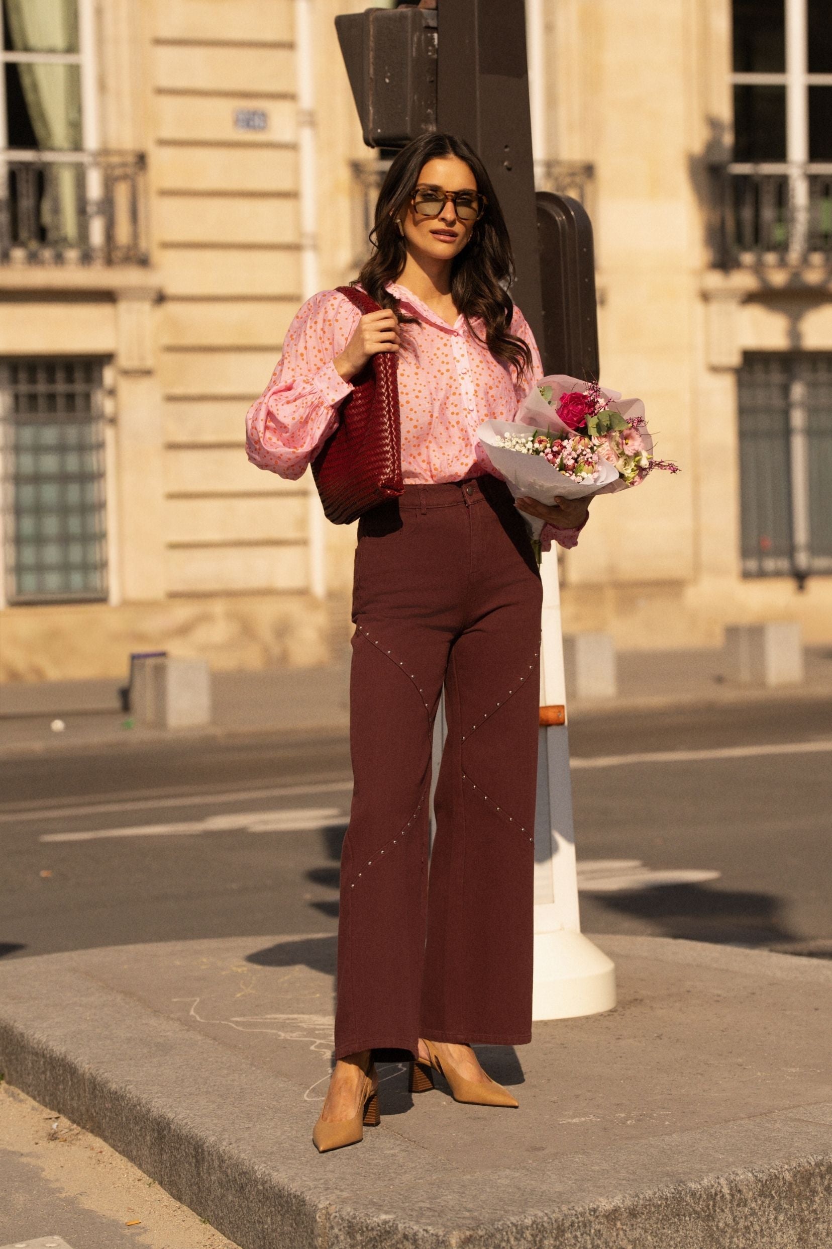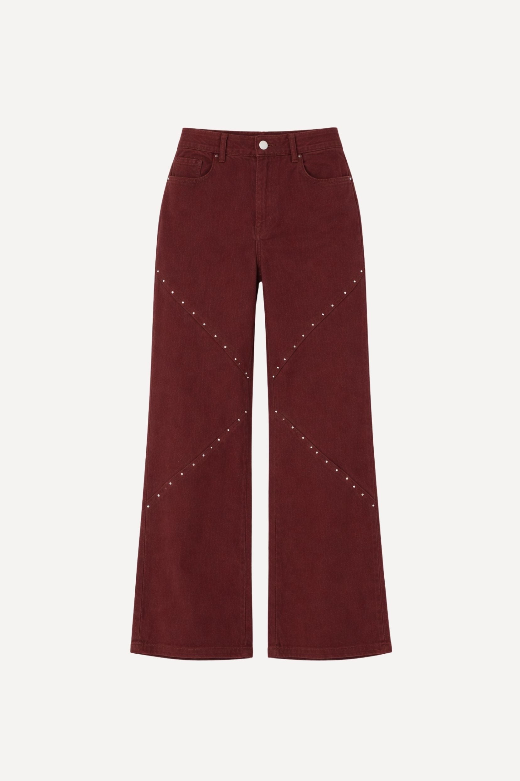 Sa teinte bordeaux profonde donne du caractère au jean et change des essentiels habituels. Les découpes graphiques, soulignées de rivets délicats, dessinent la ligne et attirent subtilement le regard, comme une signature discrète.