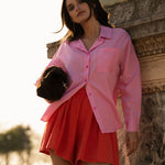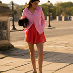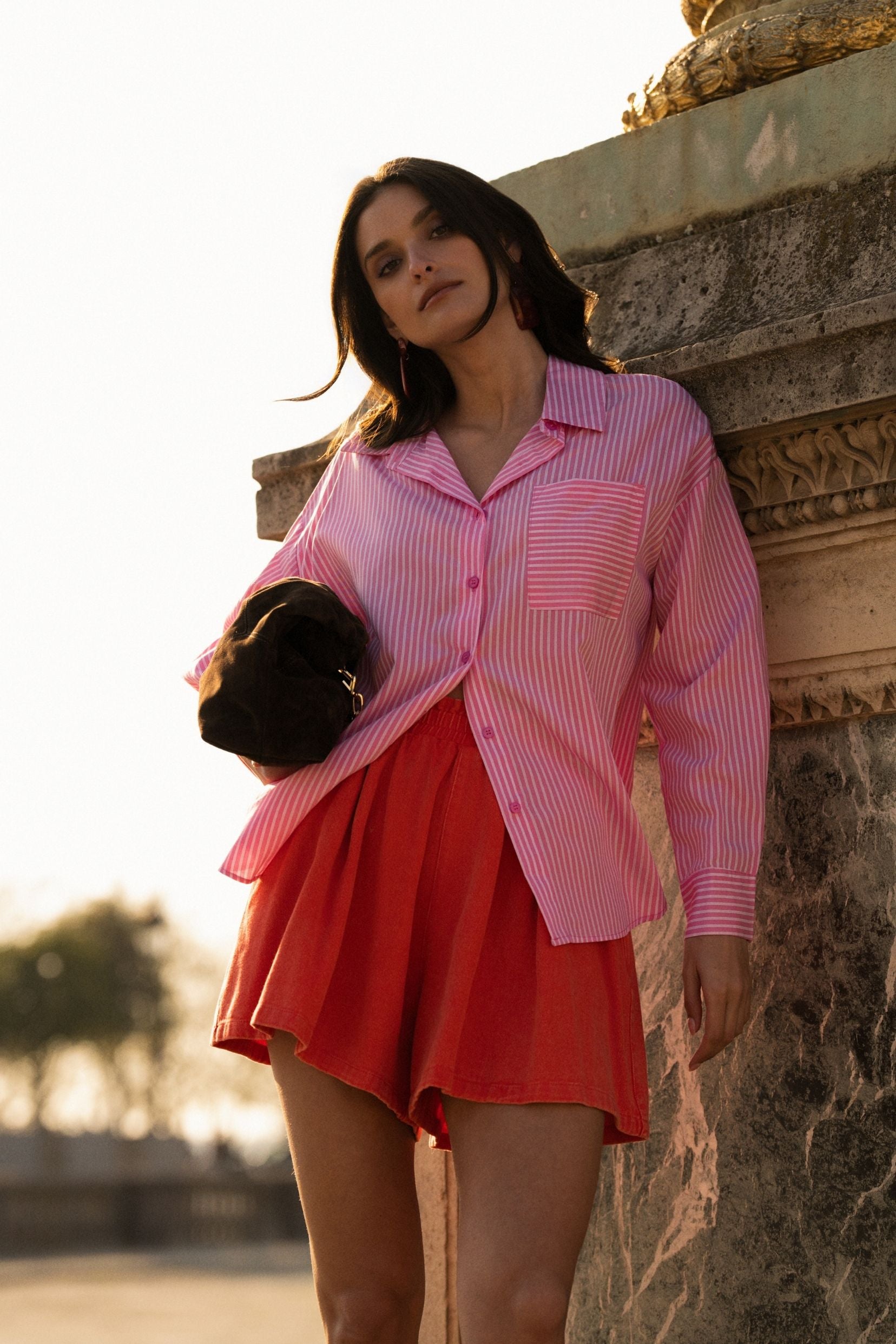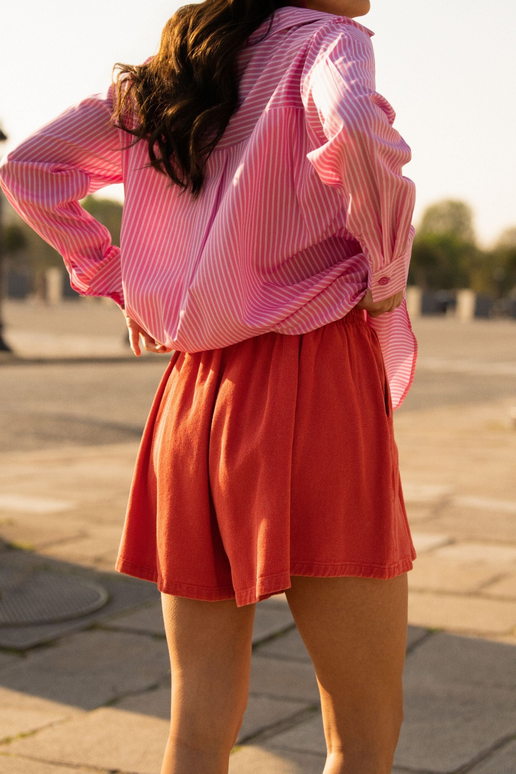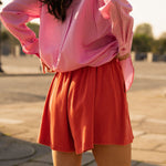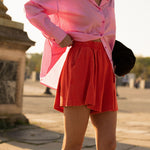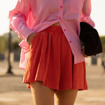 Ce short en teinte corail capte la lumière et apporte immédiatement une touche ensoleillée à la silhouette.