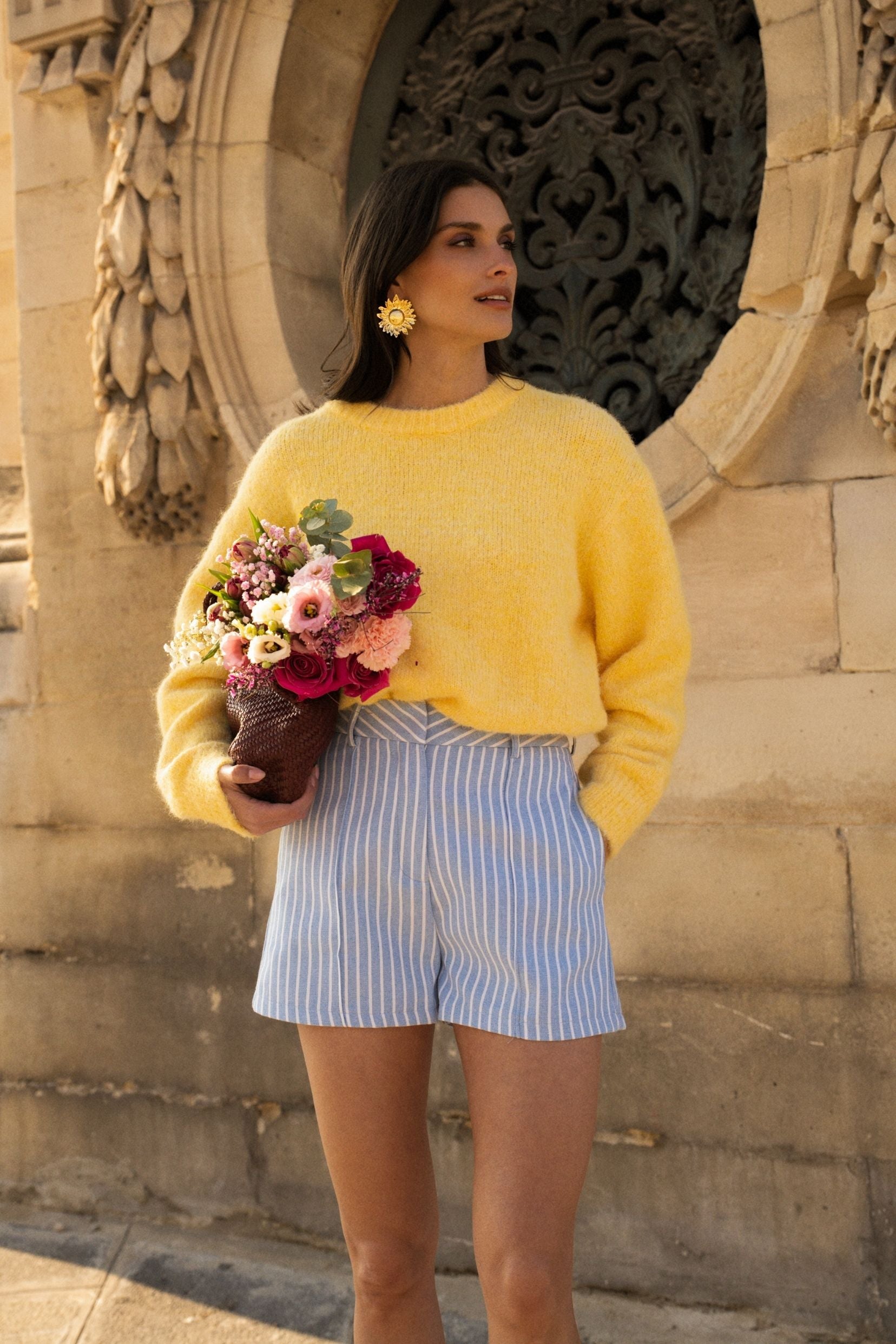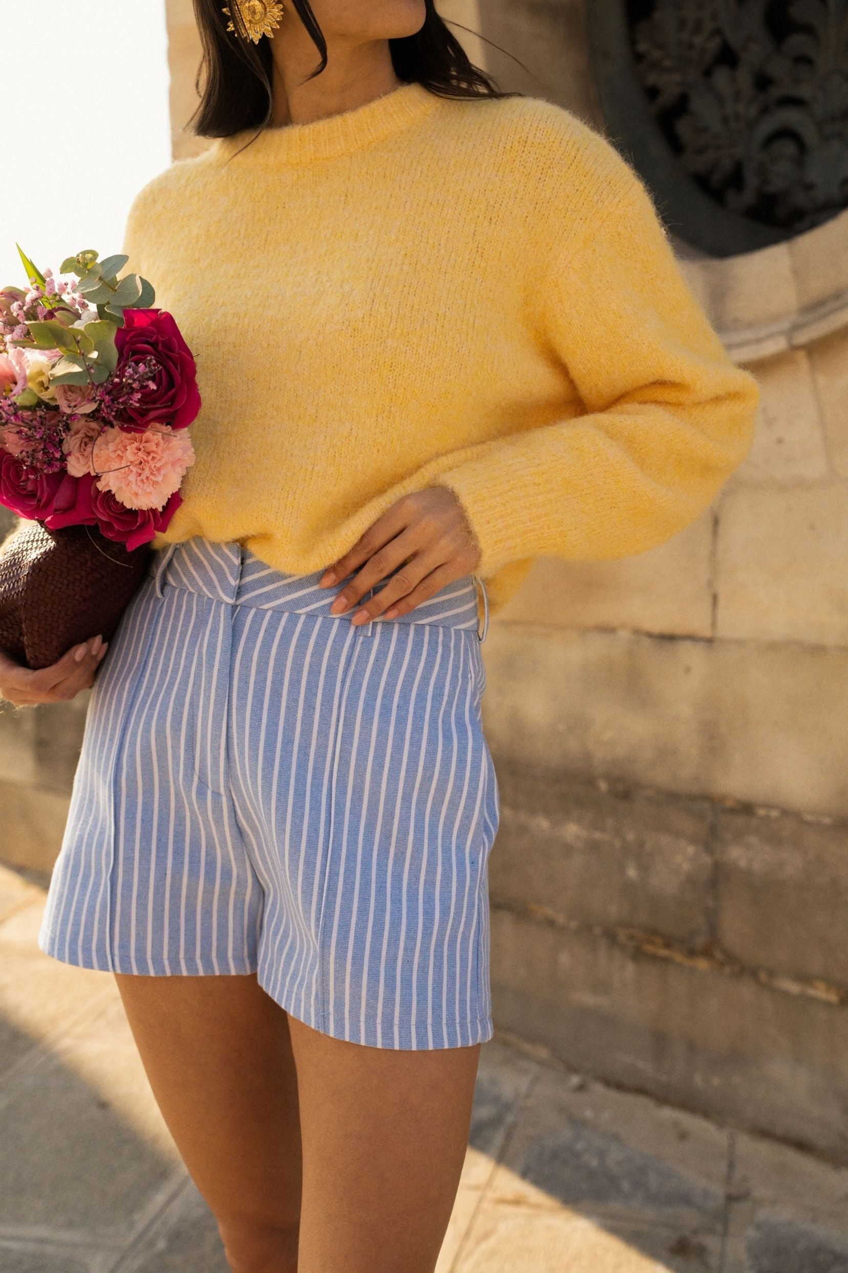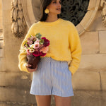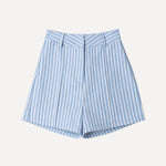Son bleu ciel, rehaussé de fines rayures blanches, apporte fraîcheur et légèreté à la silhouette. Une pièce lumineuse, pensée pour accompagner les beaux jours avec simplicité.