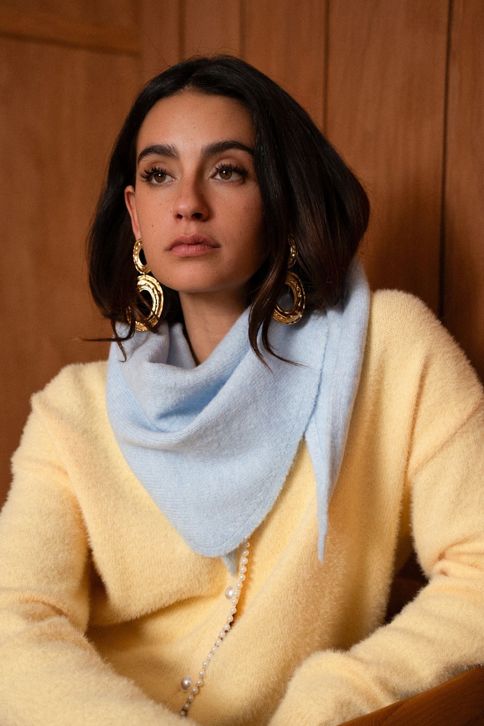 Une nuance douce, presque aérienne, qui éclaire les tenues et adoucit les silhouettes. C’est un foulard que l’on choisit pour sa couleur fraîche et que l’on garde pour son confort enveloppant.