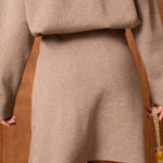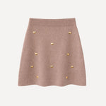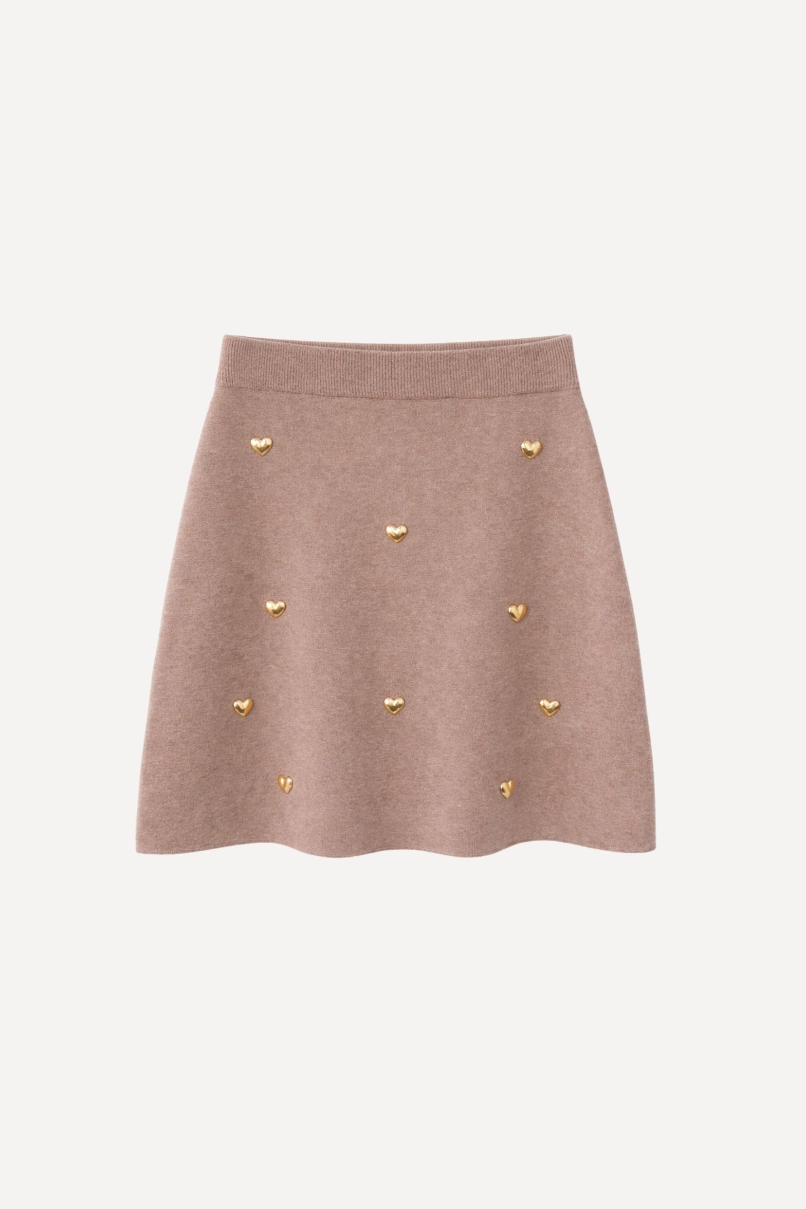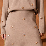 Sa maille taupe, chaleureuse et intemporelle, est délicatement parsemée de petits cœurs dorés qui captent la lumière avec subtilité. Une jupe qui mêle simplicité et raffinement, parfaite pour accompagner les journées comme les moments plus habillés.