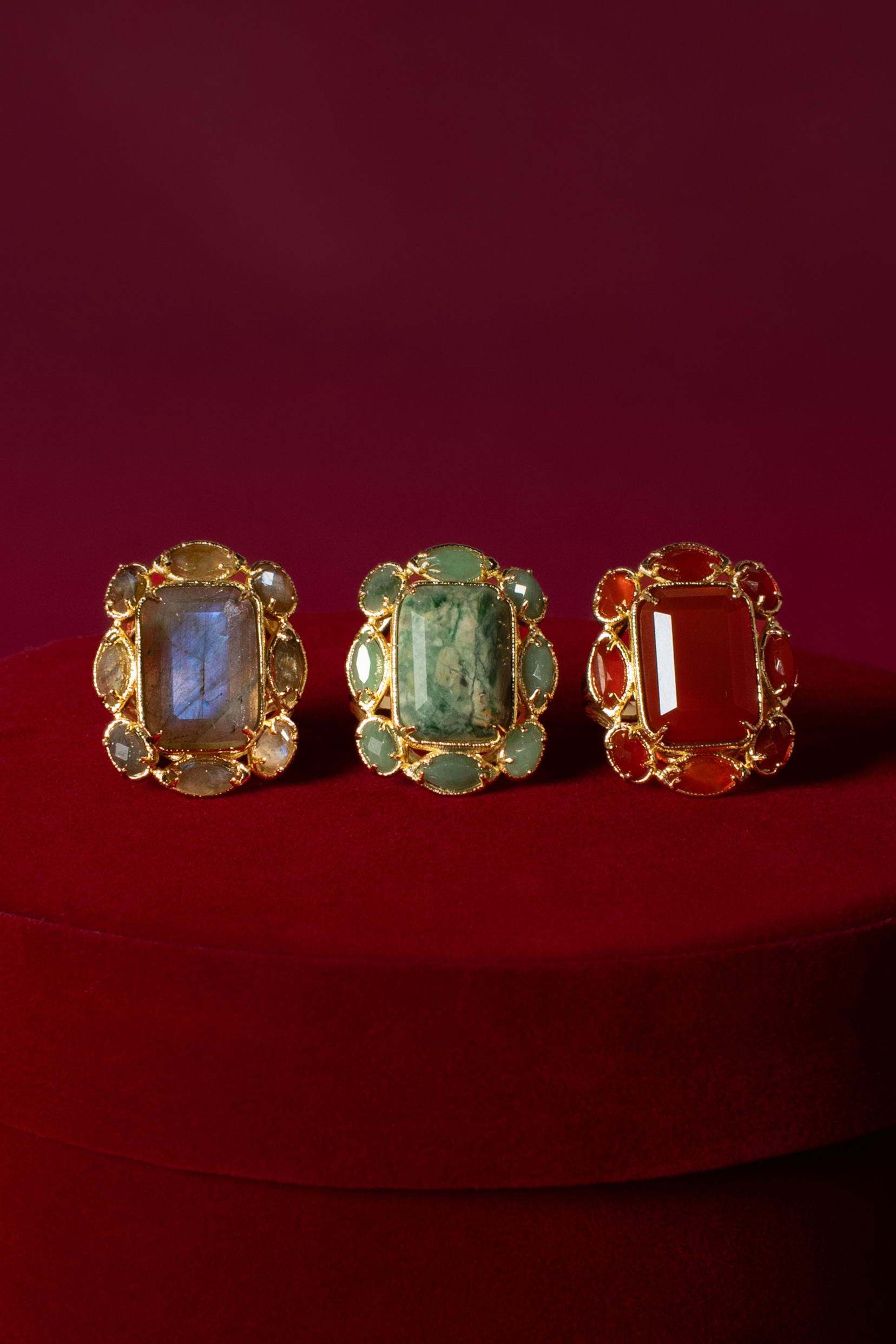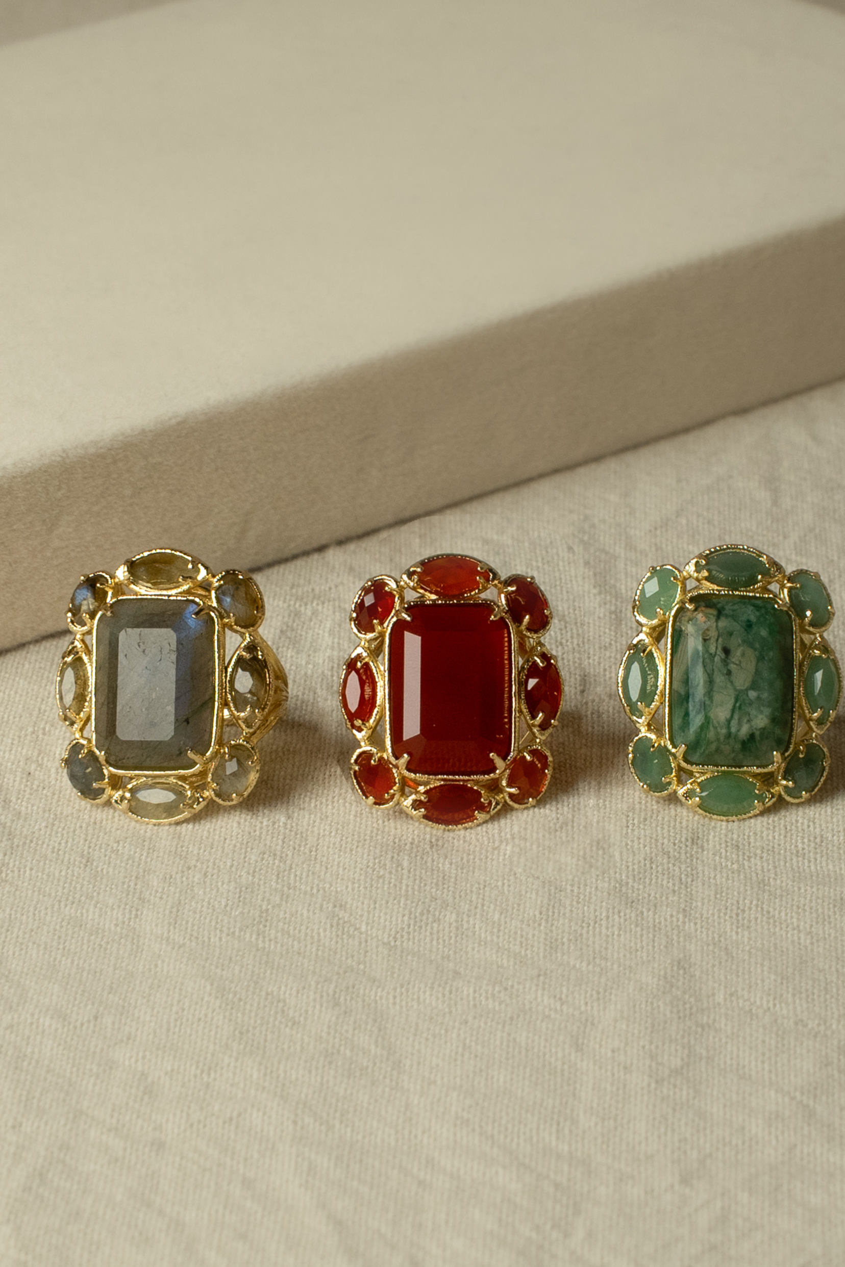 Amalia est réalisée en monture dorée et sertie de pierres naturelles (agate verte, agate rouge ou labradorite), toutes uniques par leurs nuances et leurs veines naturelles.