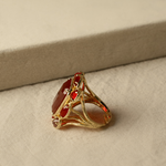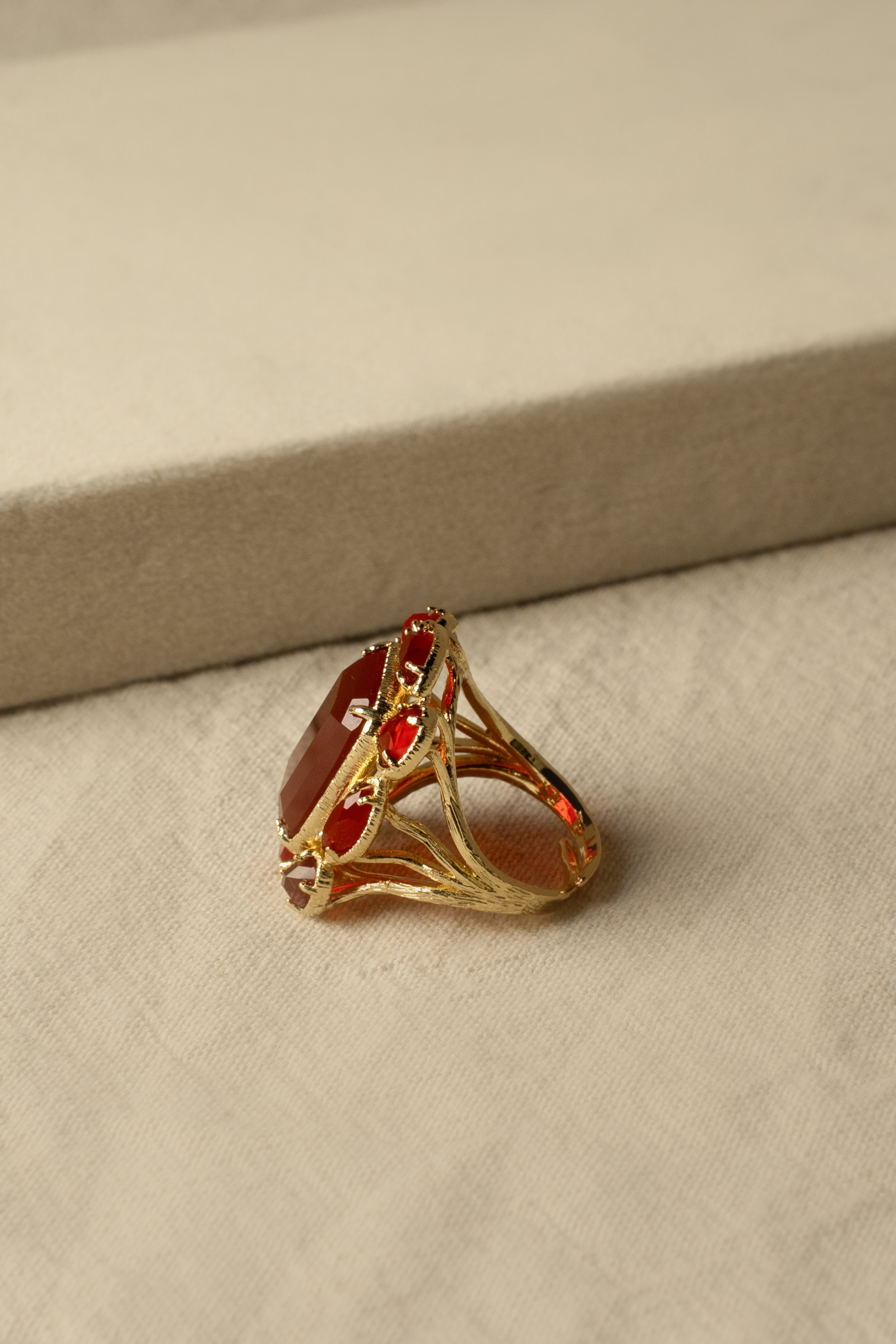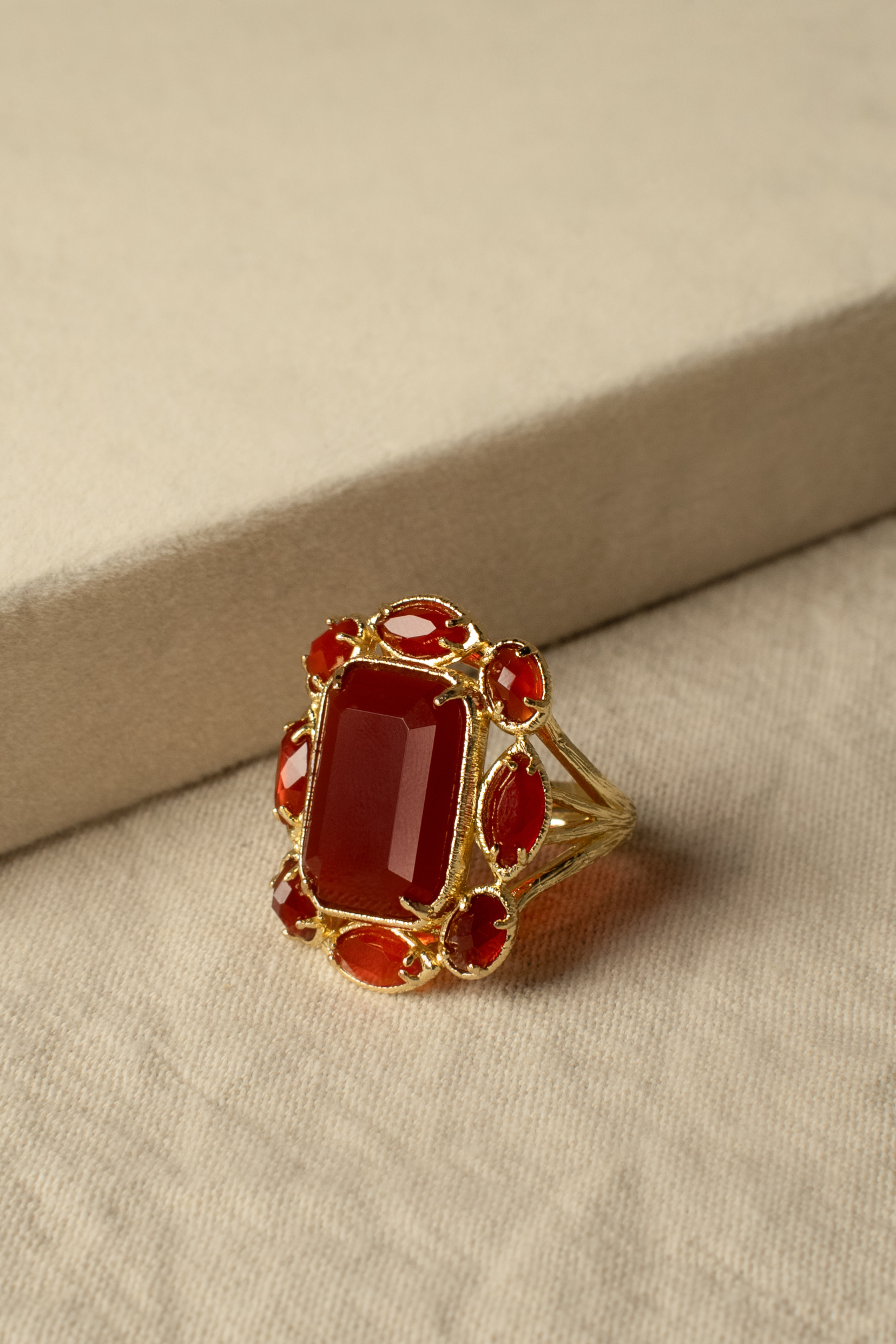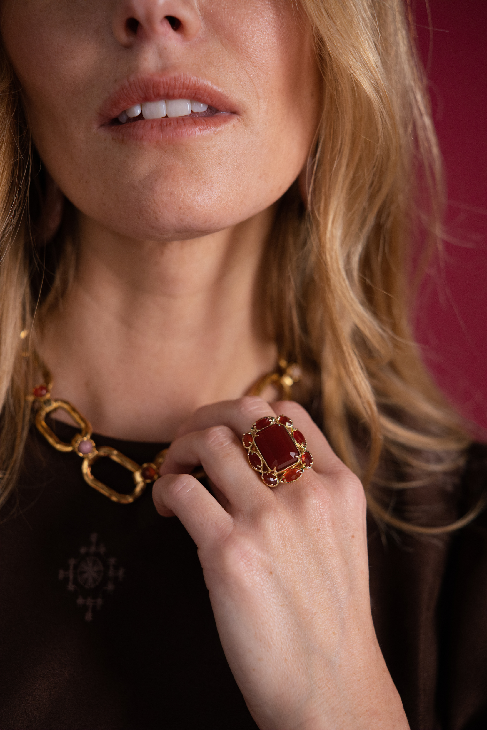 Sa pierre centrale, entourée d’ovales délicatement sertis d'agate rouge