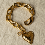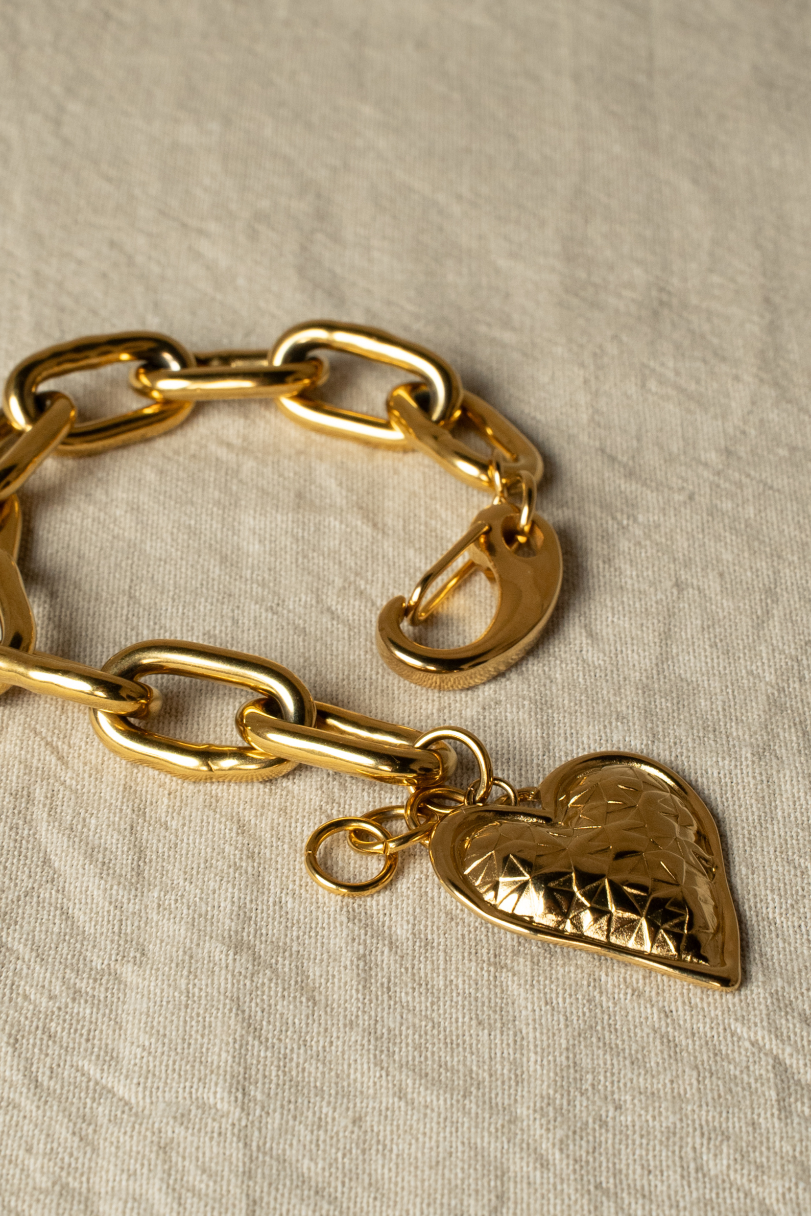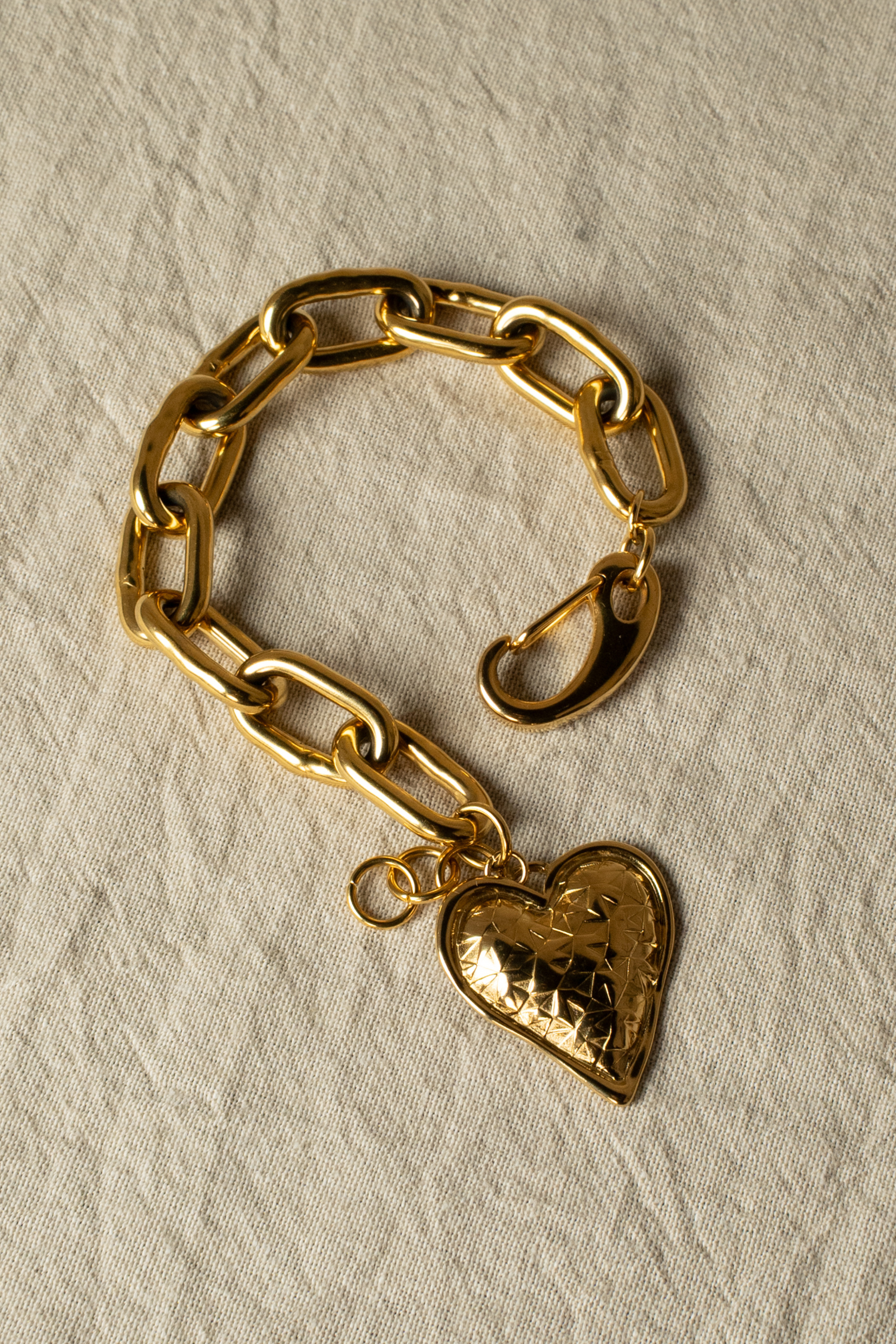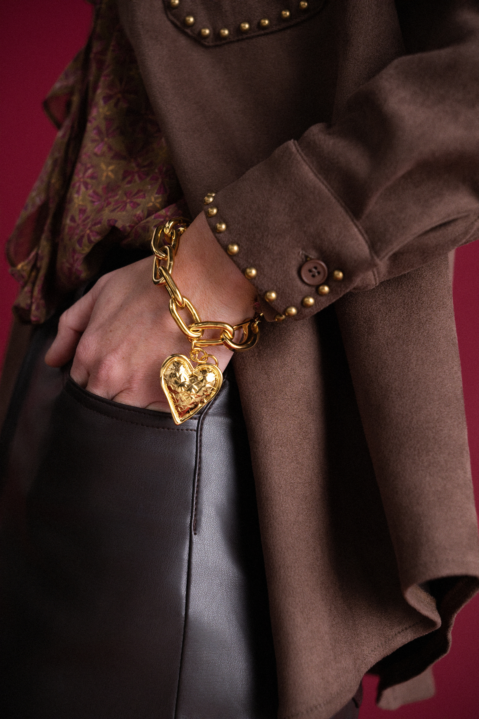 Ses maillons dorés racontent une allure pleine de caractère, tandis que son cœur martelé se pose sur la peau comme un petit talisman lumineux.