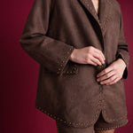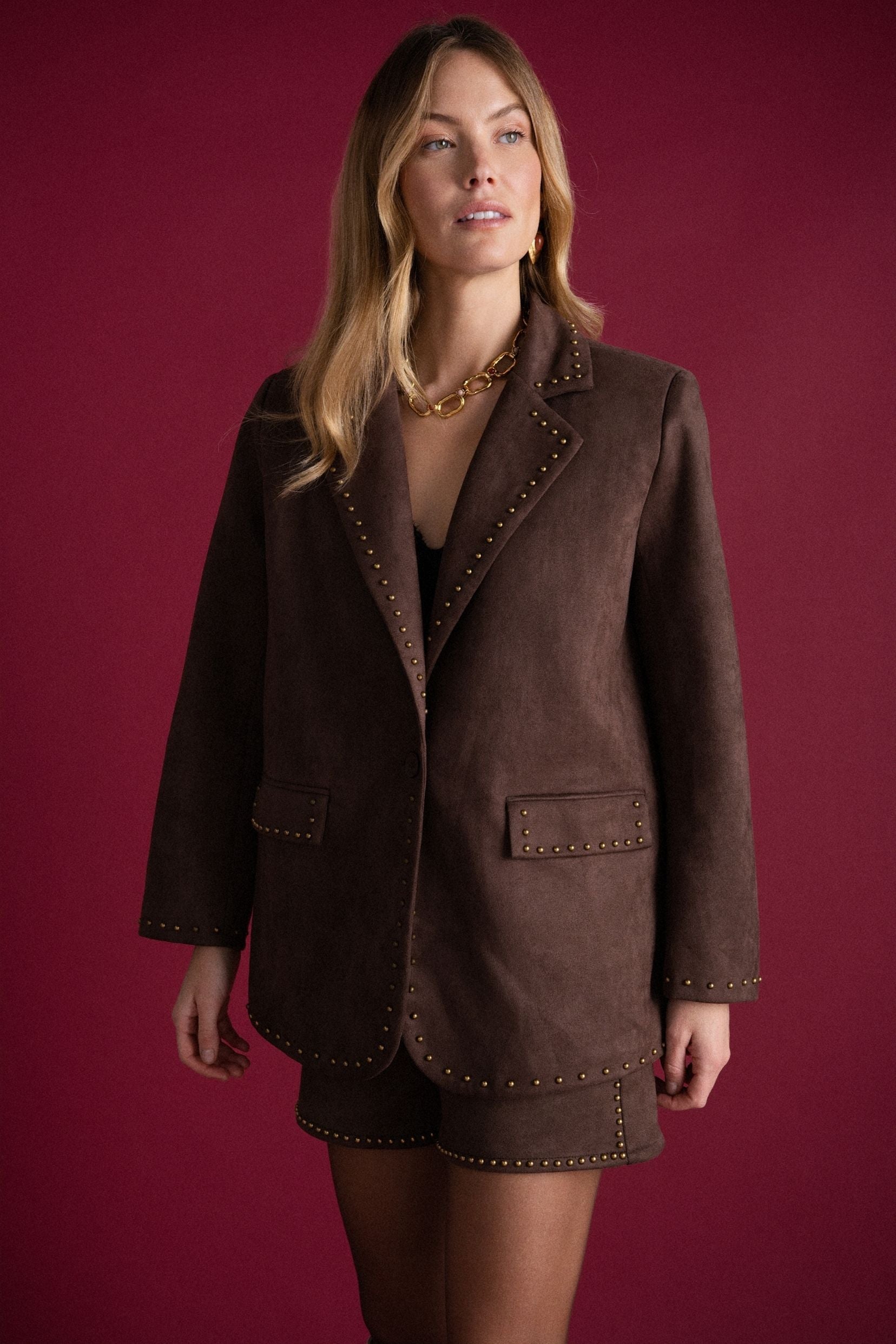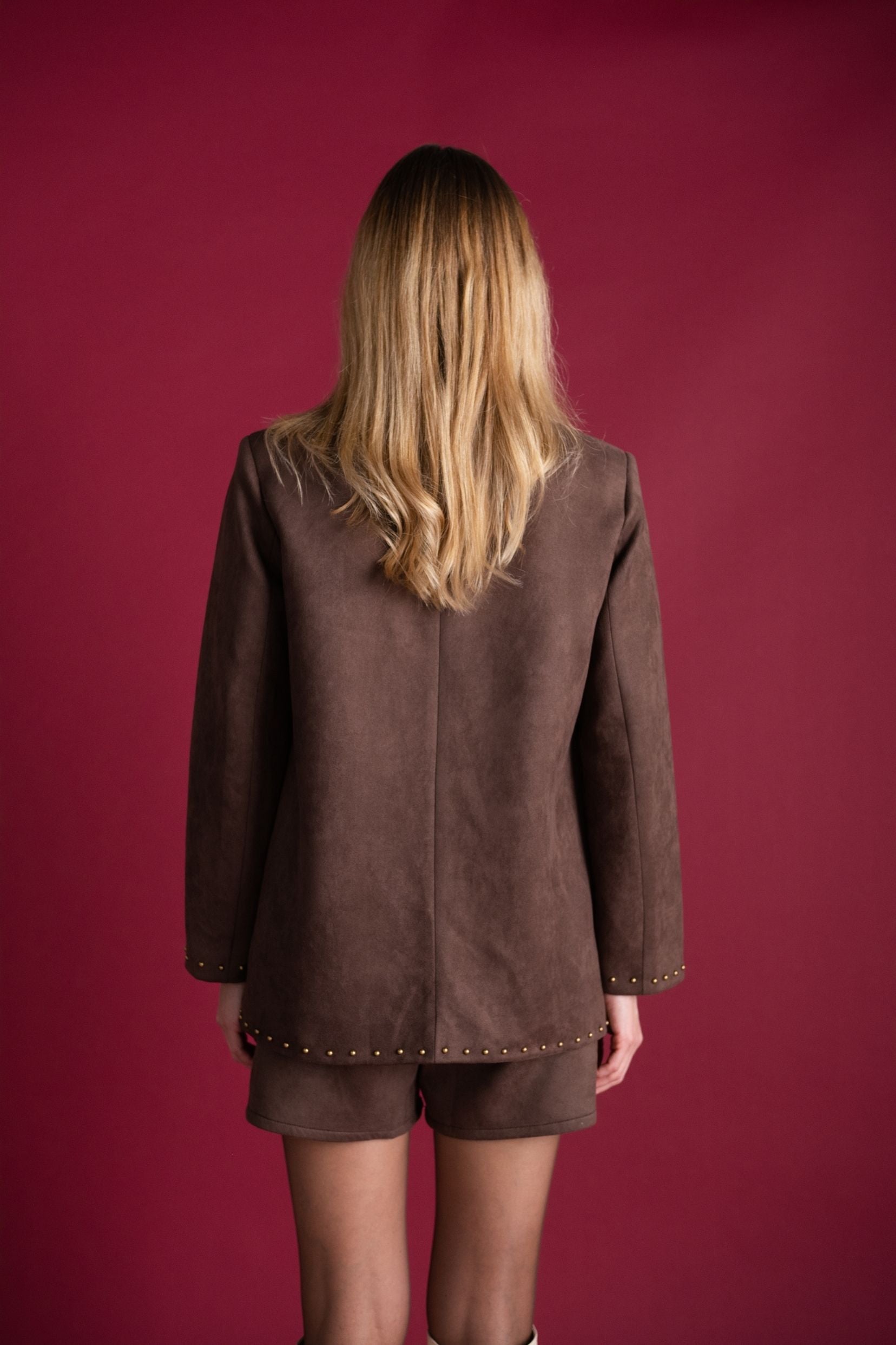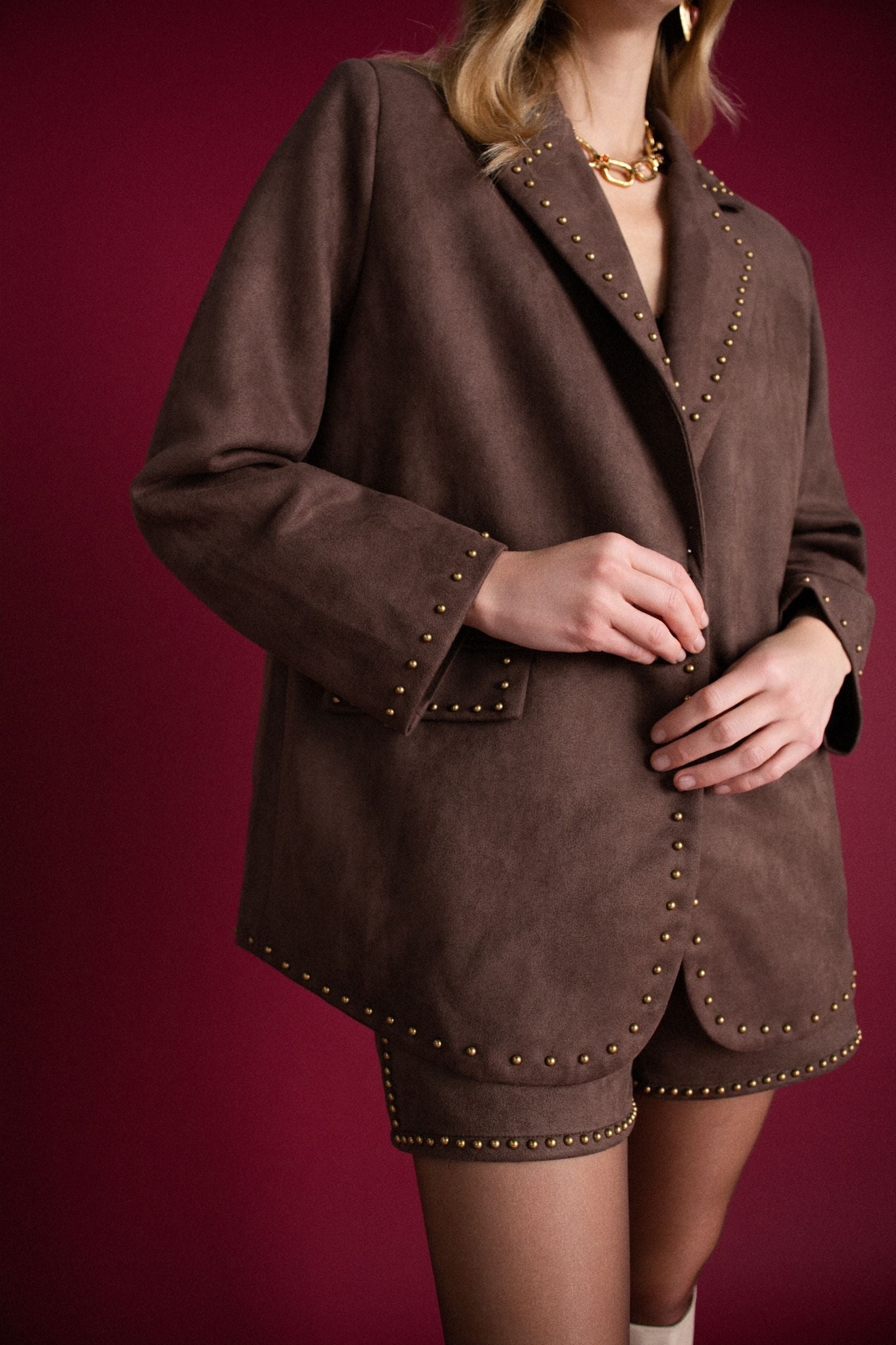 Son fini suédé couleur café lui apporte une douceur irrésistible, tandis que les petits clous dorés qui soulignent les contours ajoutent une touche affirmée, presque couture. Une pièce chaleureuse, moderne, qui donne immédiatement du relief à la silhouette.
