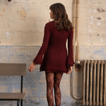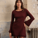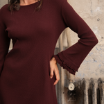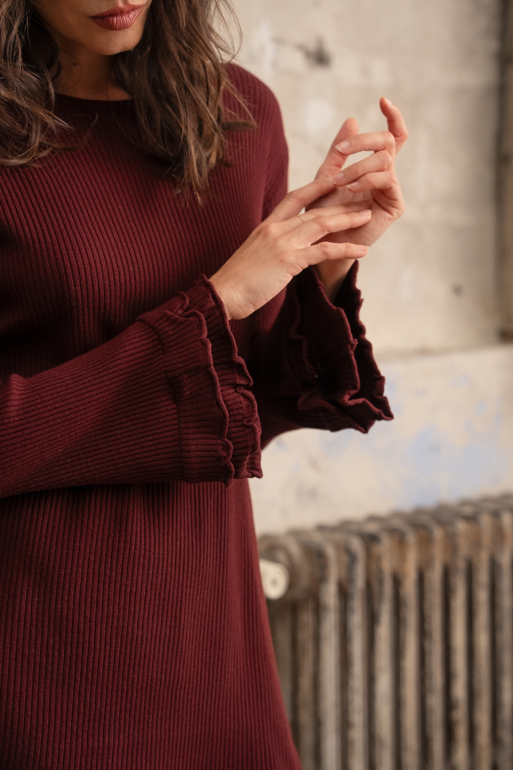 Son tricot doux épouse les formes sans les contraindre, tandis que ses volants discrets au bas des manches et de la jupe ajoutent cette touche féminine qu’on aime tant.