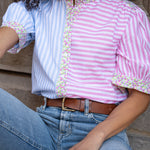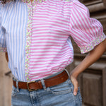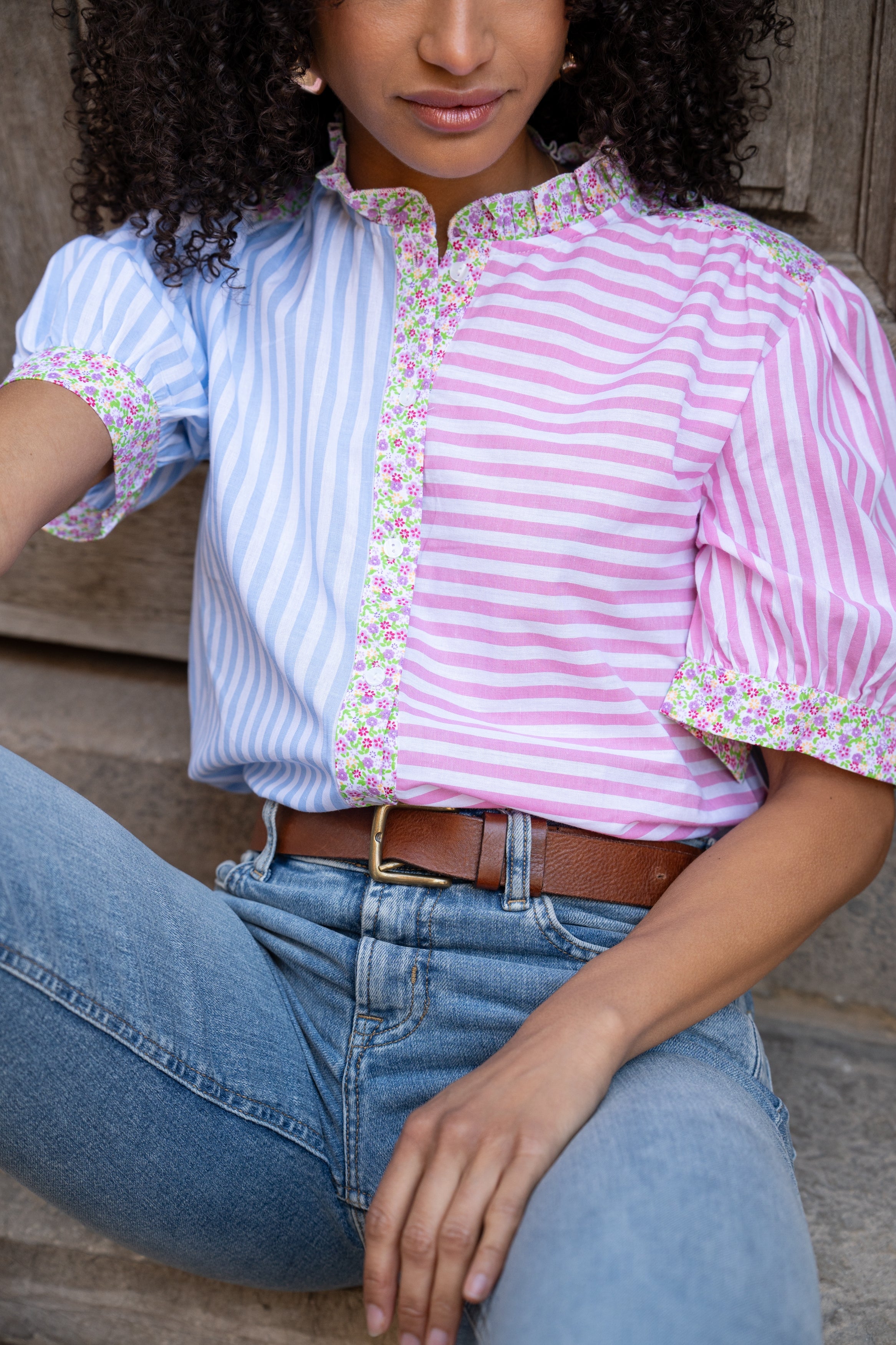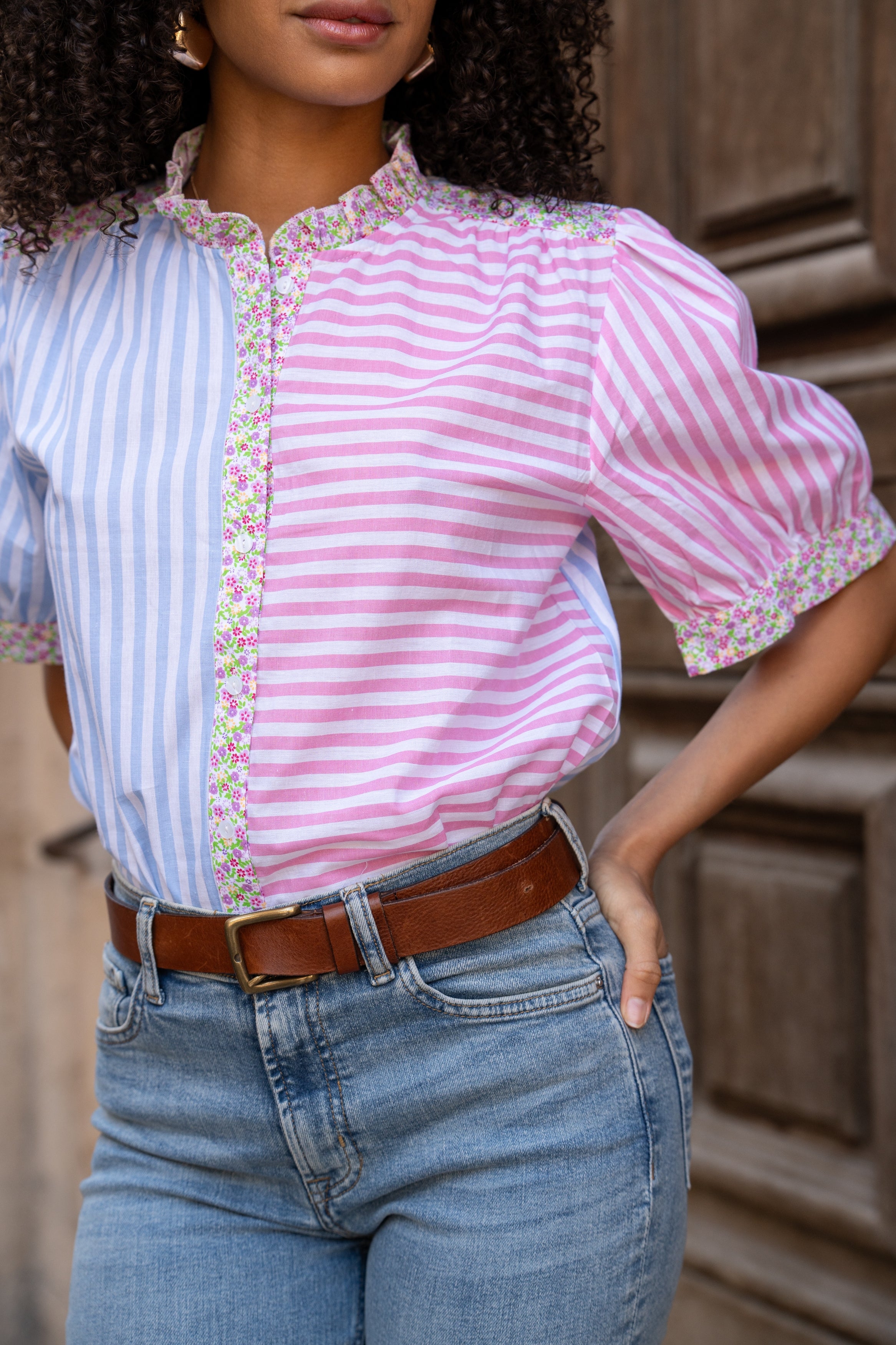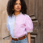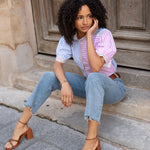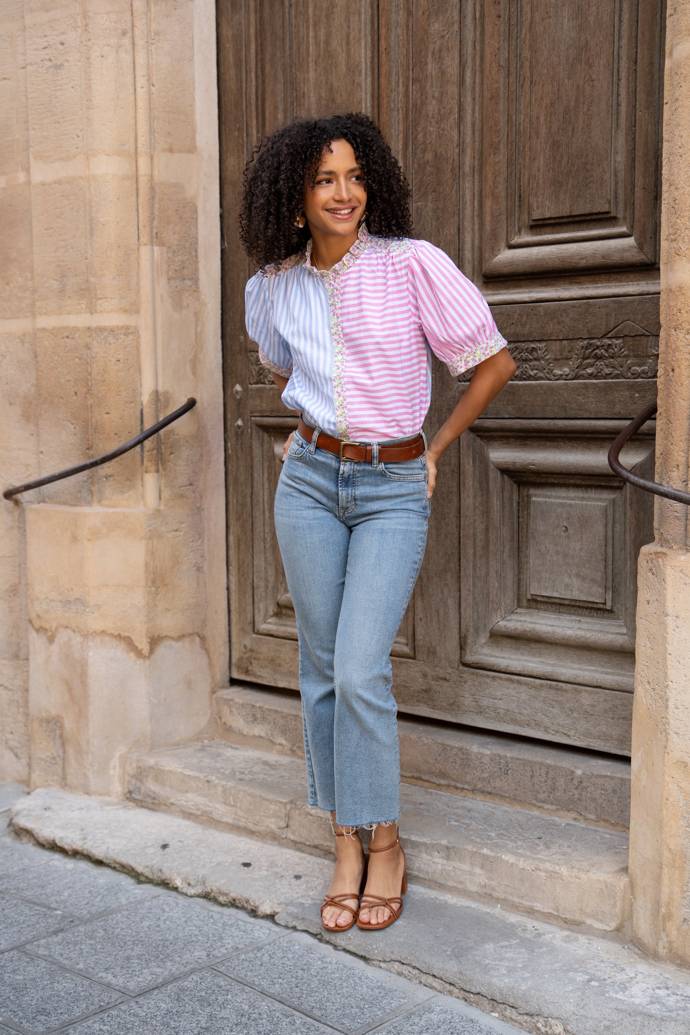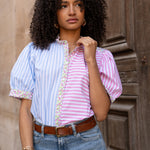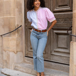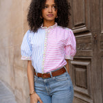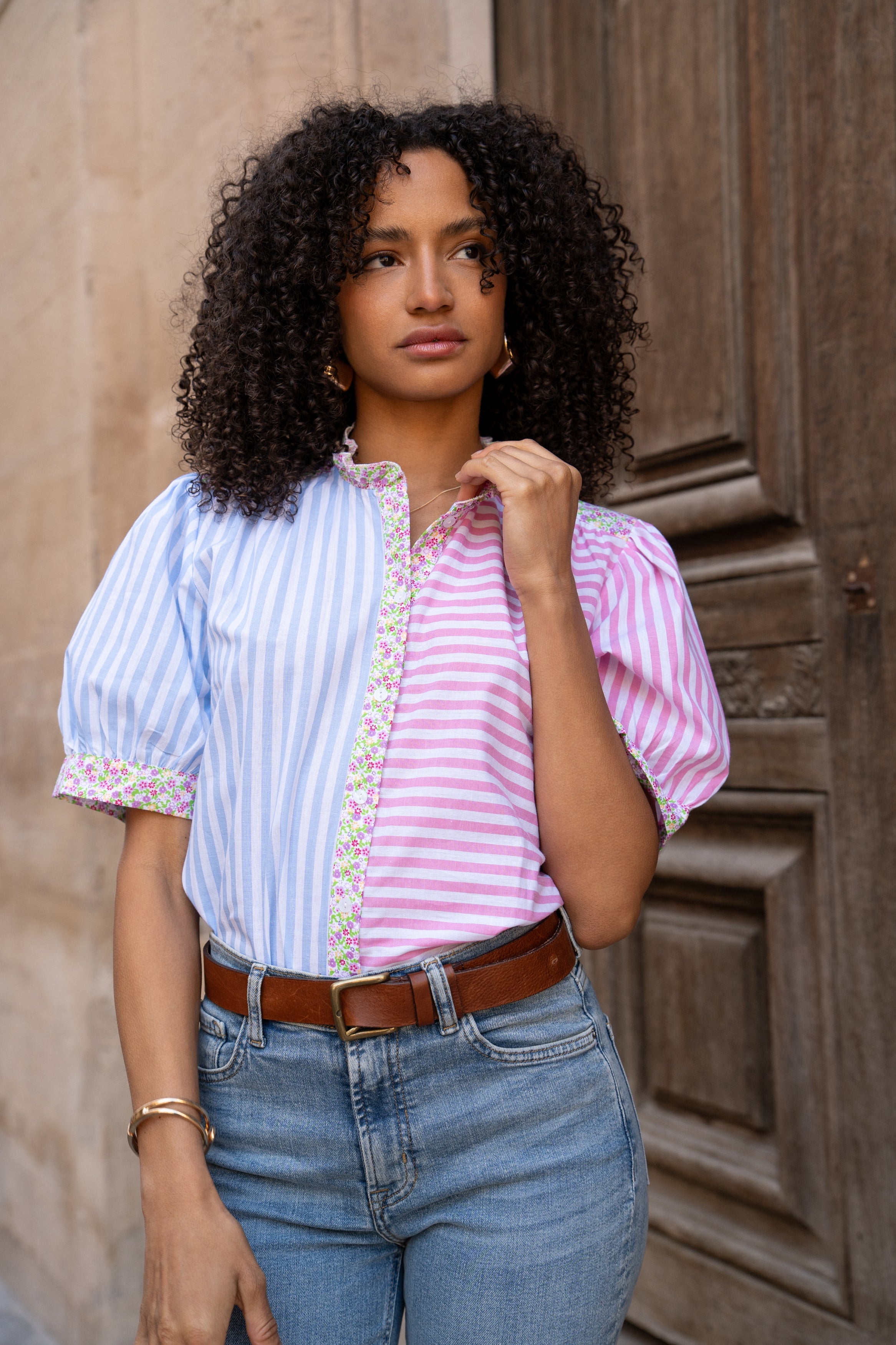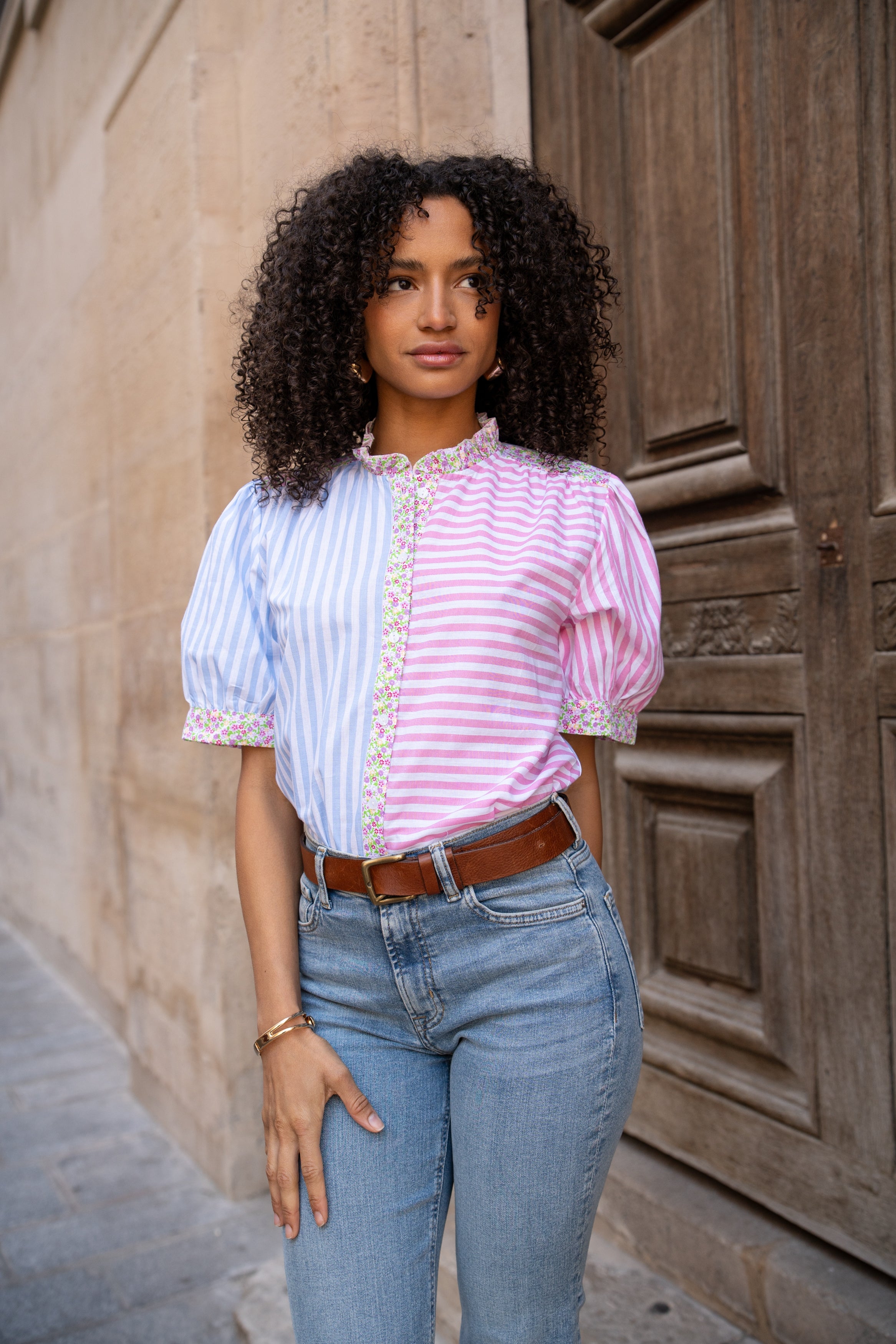 La chemise Janine ose le mélange des genres avec audace et délicatesse. Bicolore et rayée, elle joue sur les contrastes tout en élégance. Ses manches bouffantes lui apportent du volume et une touche de romantisme, tandis que son col haut à froufrous signe une silhouette affirmée et raffinée. Une pièce forte, pensée pour celles qui aiment allier caractère et féminité, à porter aussi bien rentrée dans un pantalon taille haute qu’ouverte sur un débardeur fin.