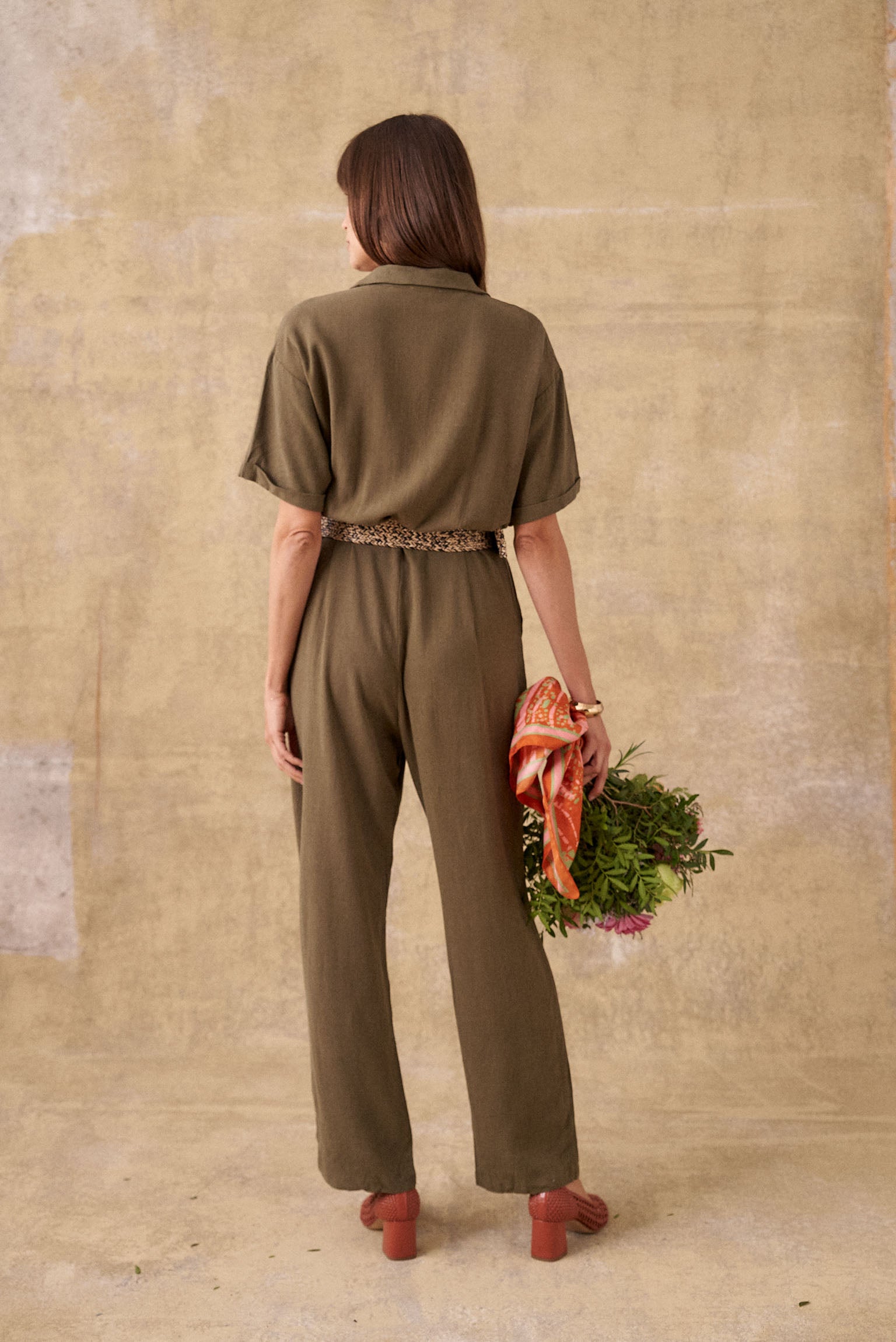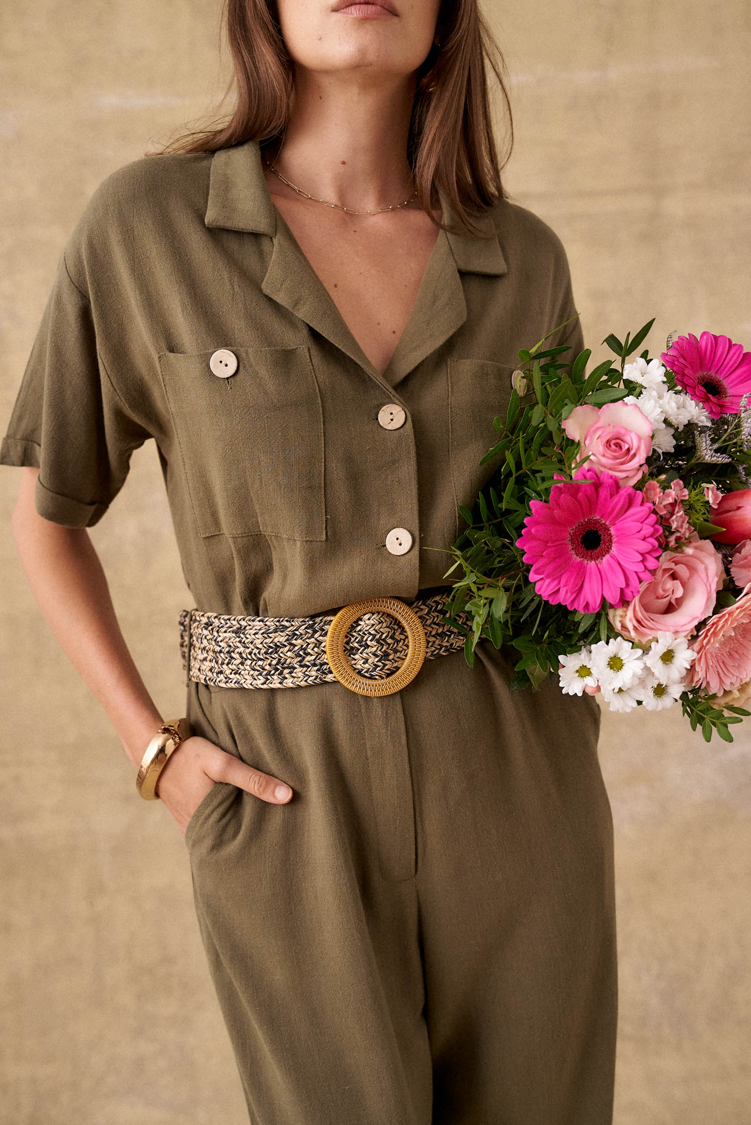 Optez pour notre magnifique combinaison fluide kaki Baya, un choix parfait pour une tenue élégante et décontractée. Dotée d'une ceinture à la taille pour une silhouette flatteuse, cette combinaison présente un col chemise classique qui ajoute une touche de sophistication. Polyvalente et élégante, cette combinaison sera votre alliée idéale pour toutes les occasions, que ce soit pour une journée au bureau ou une sortie entre amis. Ajoutez simplement vos accessoires préférés pour compléter votre look avec style.