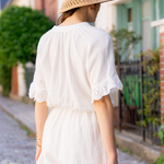 La combinaison Milla allie fraîcheur et confort pour un look féminin et moderne. Son short fluide est ceintré à la taille pour souligner la silhouette avec douceur. Le col en V boutonné ajoute une touche classique et raffinée, tandis que ses manches évasées courtes se terminent par une délicate broderie anglaise, qui apporte légèreté et charme à l’ensemble.