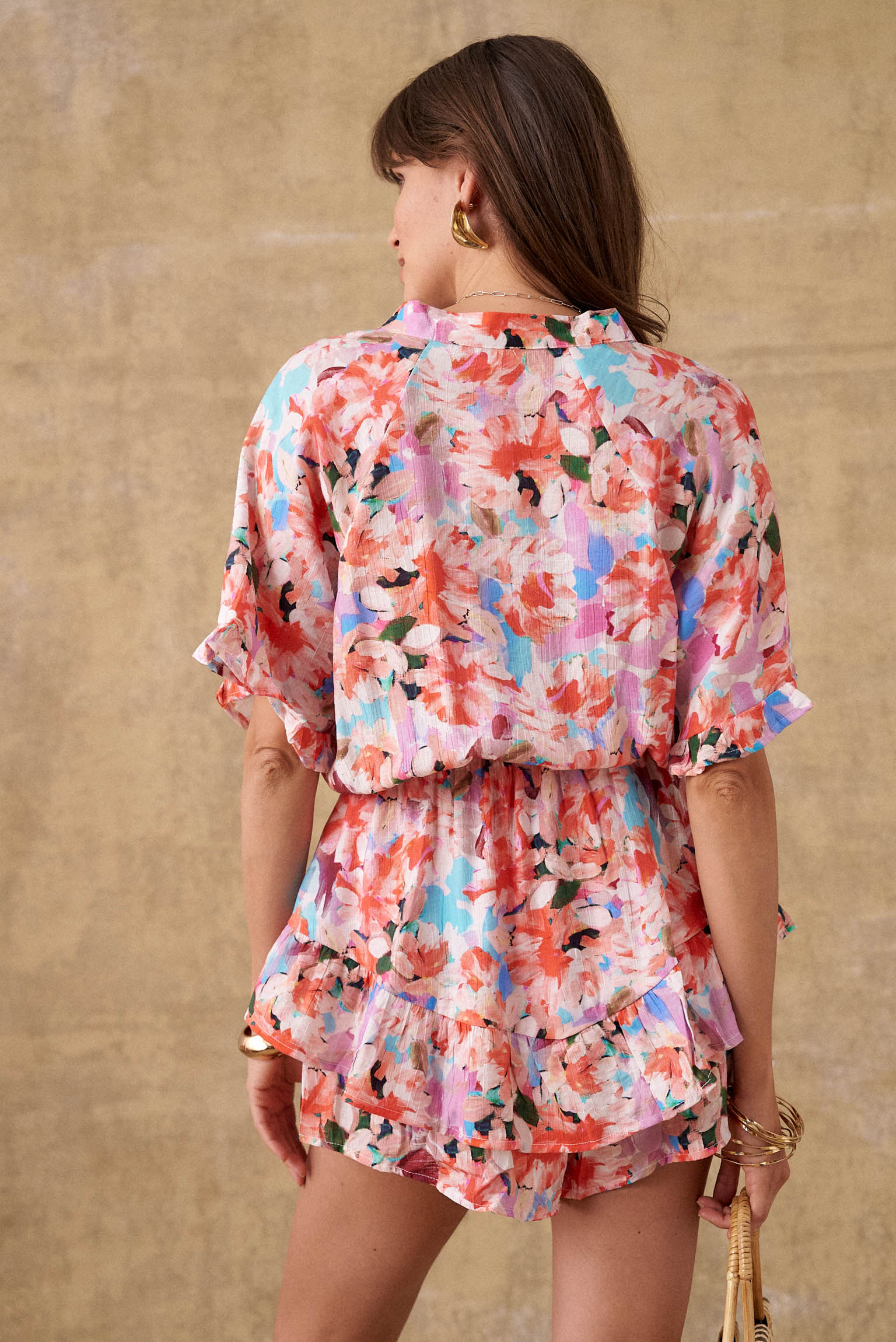 Découvrez notre combinaison short Fara, un choix idéal pour les journées ensoleillées et les moments de détente estivaux. Fara est animé par un motif floral vivifiant qui insuffle une note de fraîcheur à votre style. Son short possède une coupe qui ajoutera une touche de féminité et de légèreté à votre silhouette, vous garantissant un confort optimal tout au long de la journée. Polyvalent et facile à assortir, cet ensemble est parfait pour flâner en ville ou vous détendre en bord de mer.