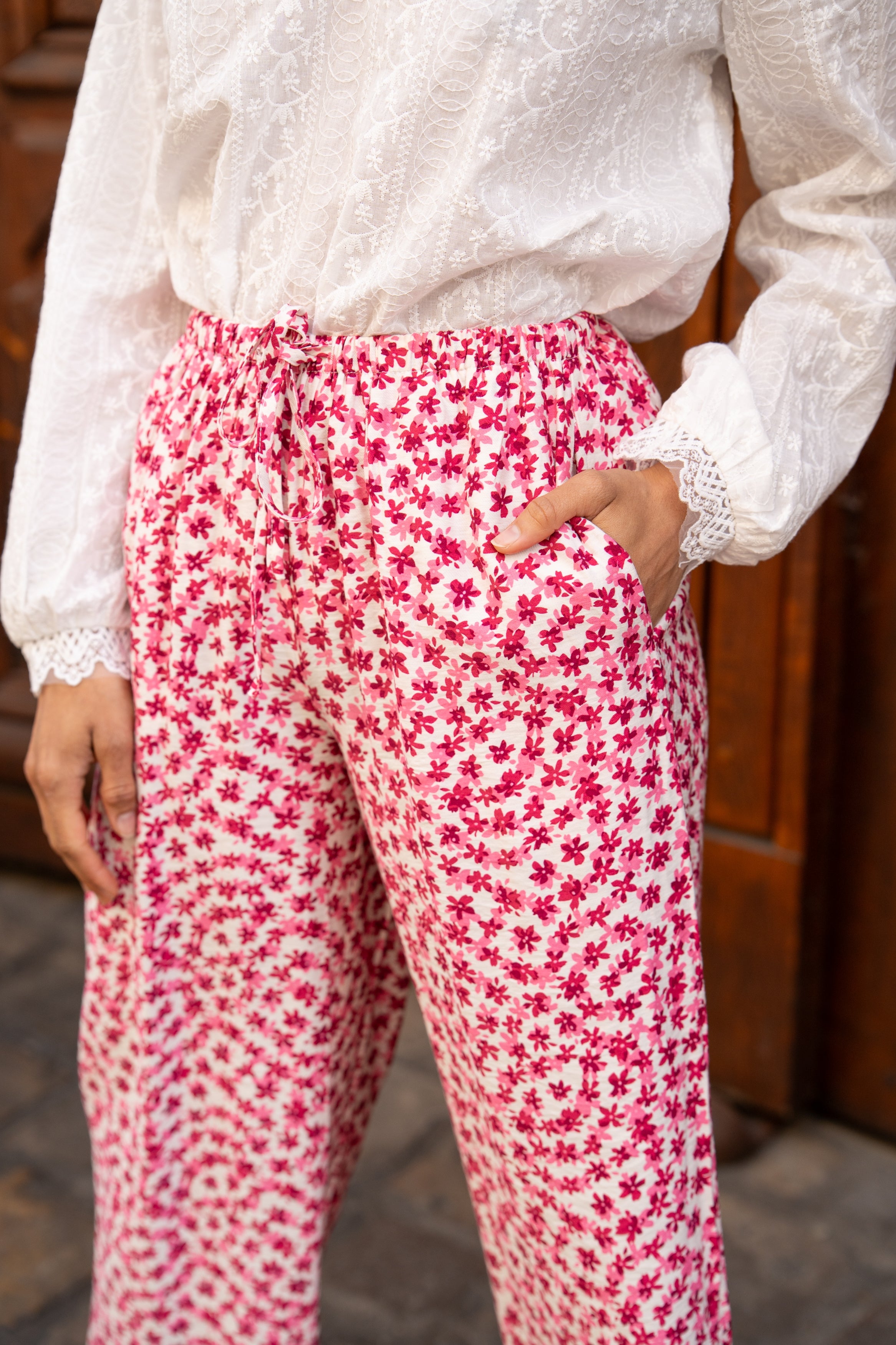 Le pantalon Noura allie confort et poésie dans une coupe résolument fluide. Ample et léger, il accompagne chaque mouvement avec grâce, tandis que son imprimé fleuri insuffle une touche bucolique et féminine. Sa taille élastiquée, ajustée par un cordon à nouer, assure un porté décontracté tout en soulignant la silhouette. Doté de poches sur les côtés, il conjugue style et praticité. À porter avec un top uni pour laisser parler l’imprimé.
