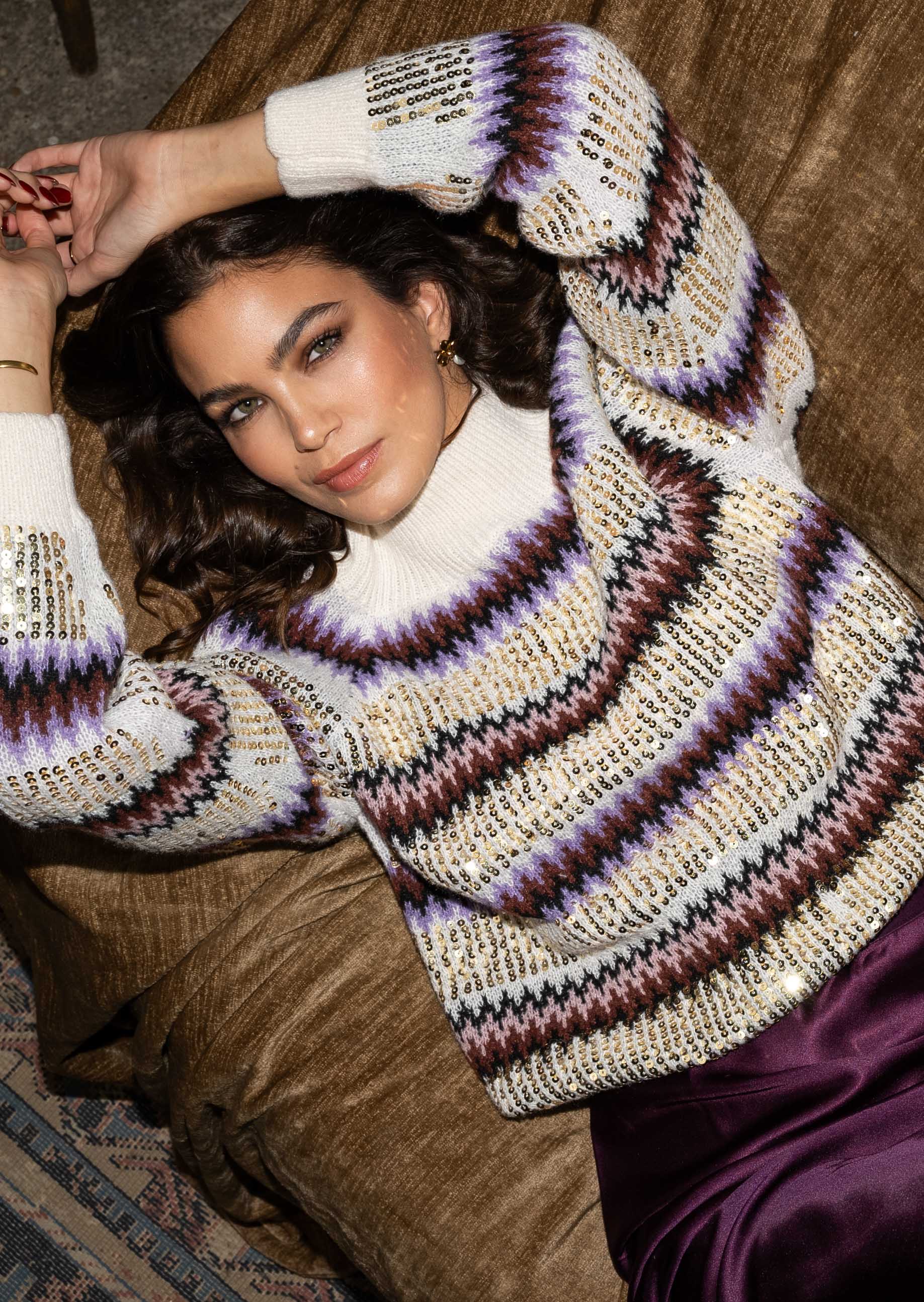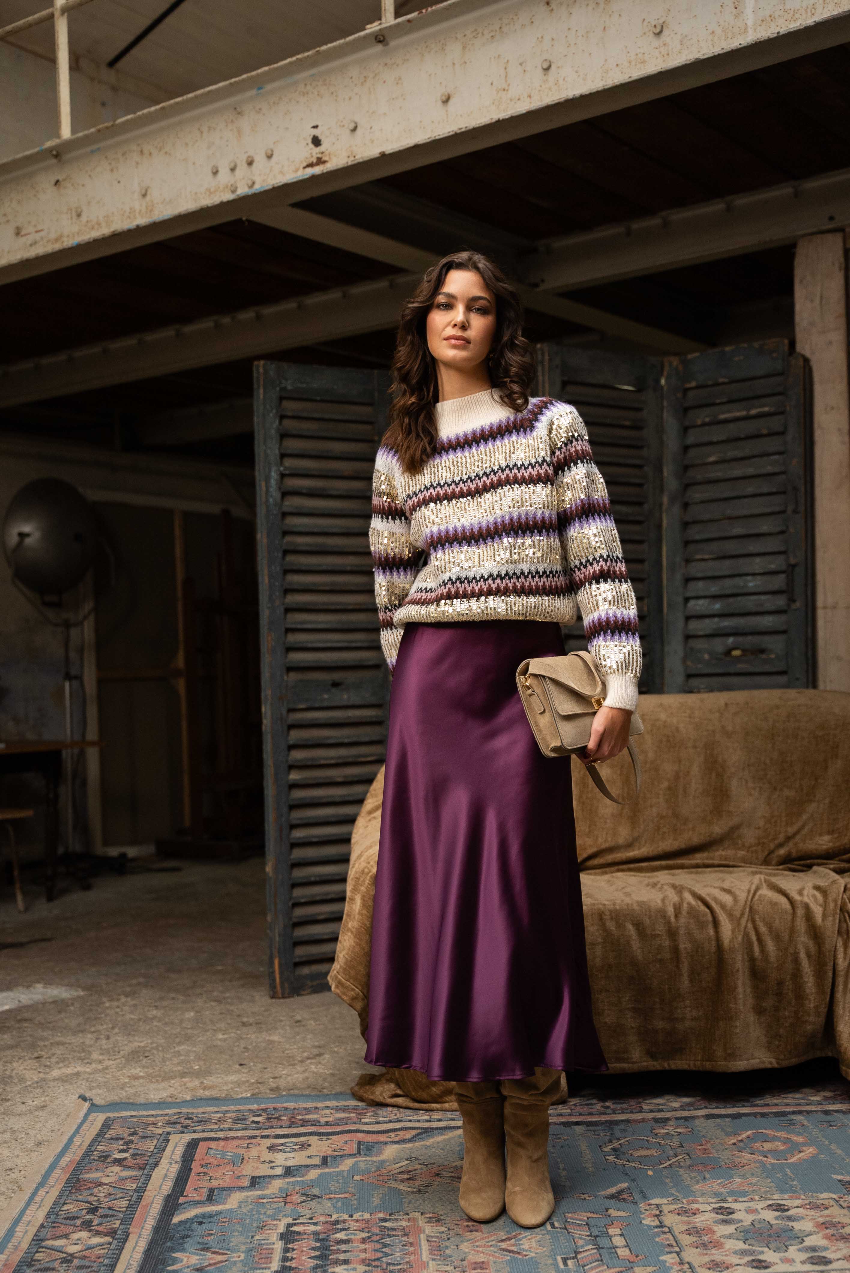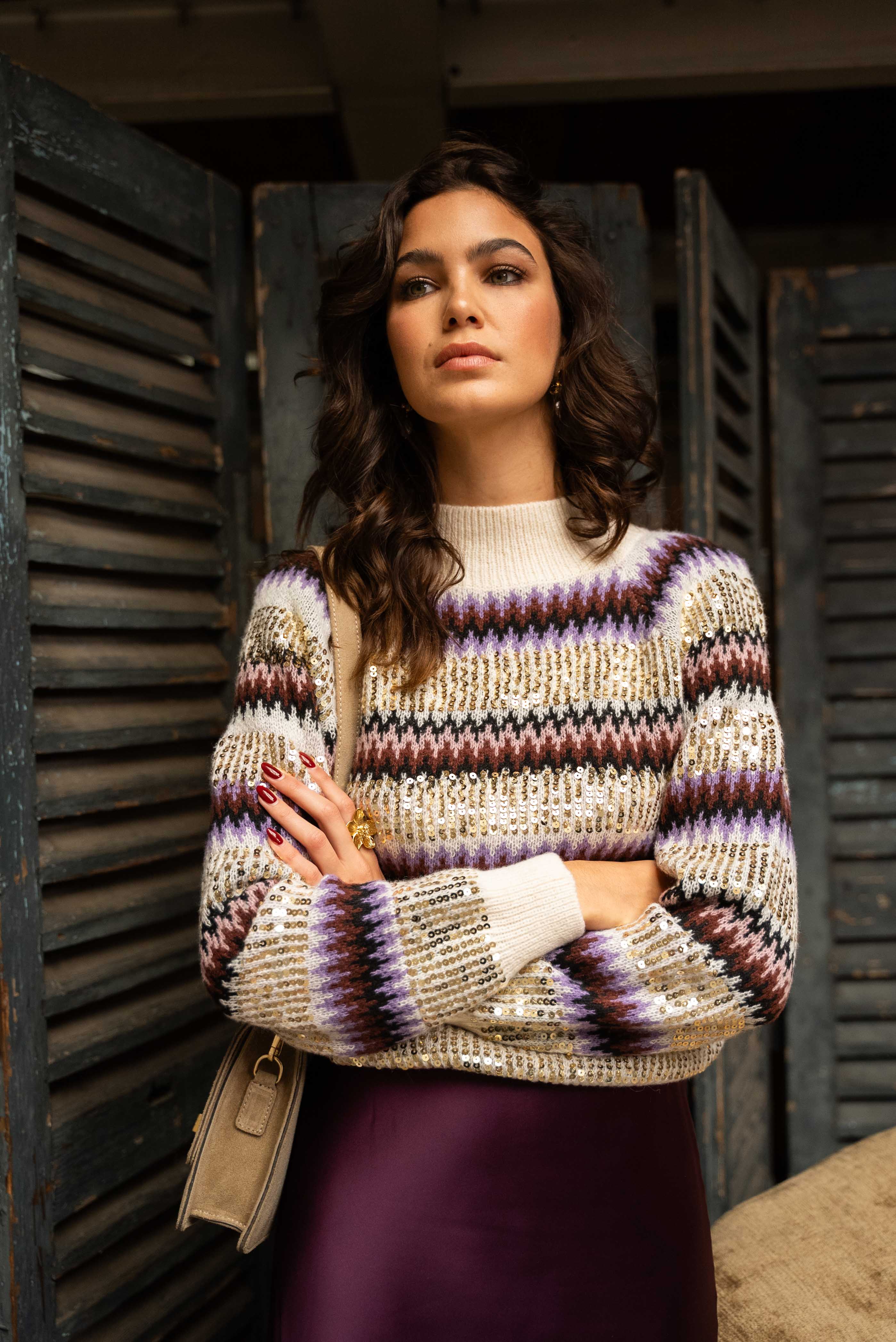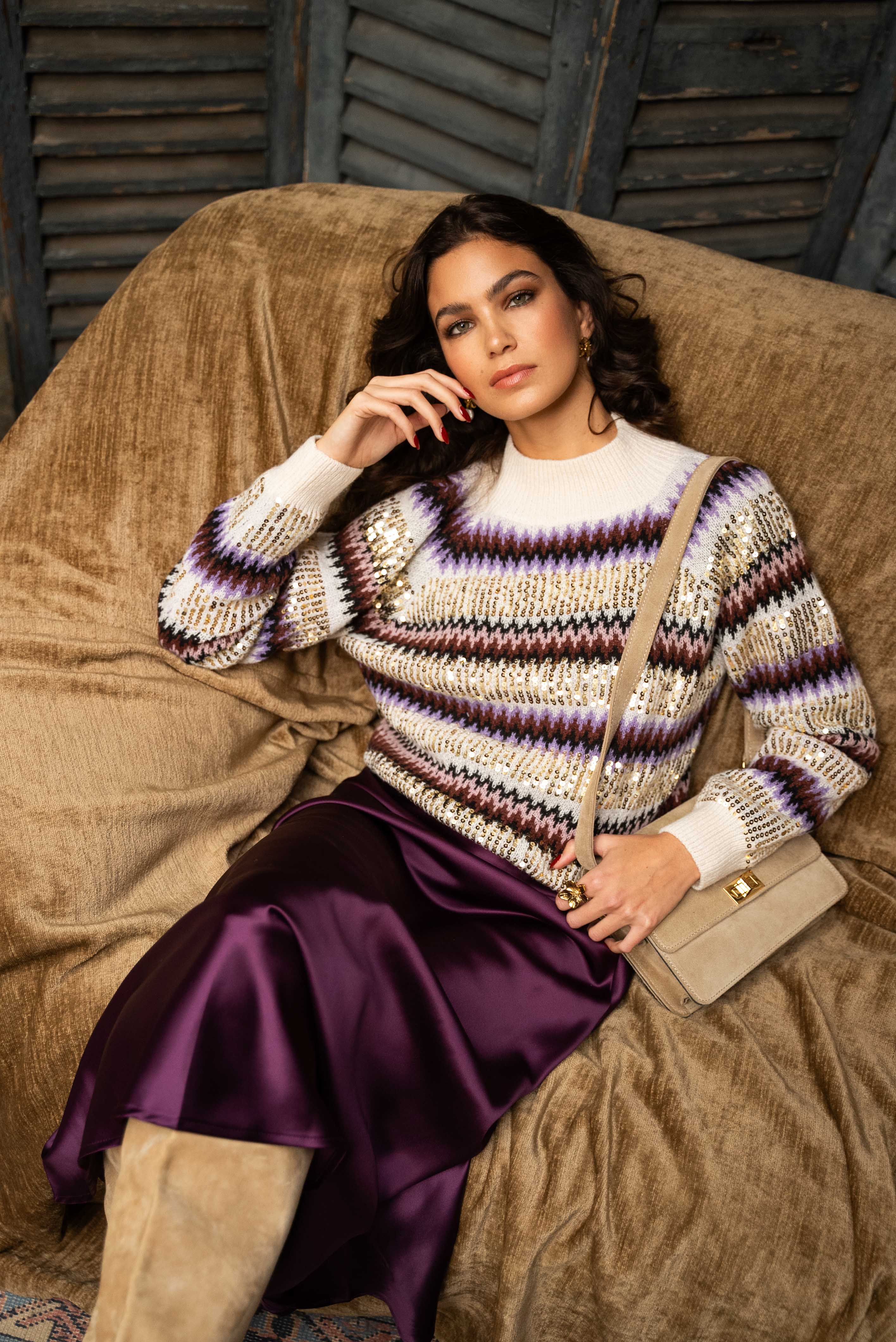 Le pull en maille Azura marie avec harmonie le confort et une esthétique captivante. Arborant une teinte taupe apaisante, ses motifs artistiques intègrent subtilement des touches vibrantes de violet, doré et noir. La texture douce de la maille offre une sensation délicate, tandis que les détails tricotés ajoutent une touche créative à cette pièce distinctive. Affirmez votre style avec le pull Azura, une création qui allie subtilement l'audace et la sophistication.