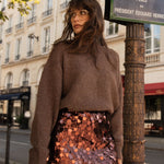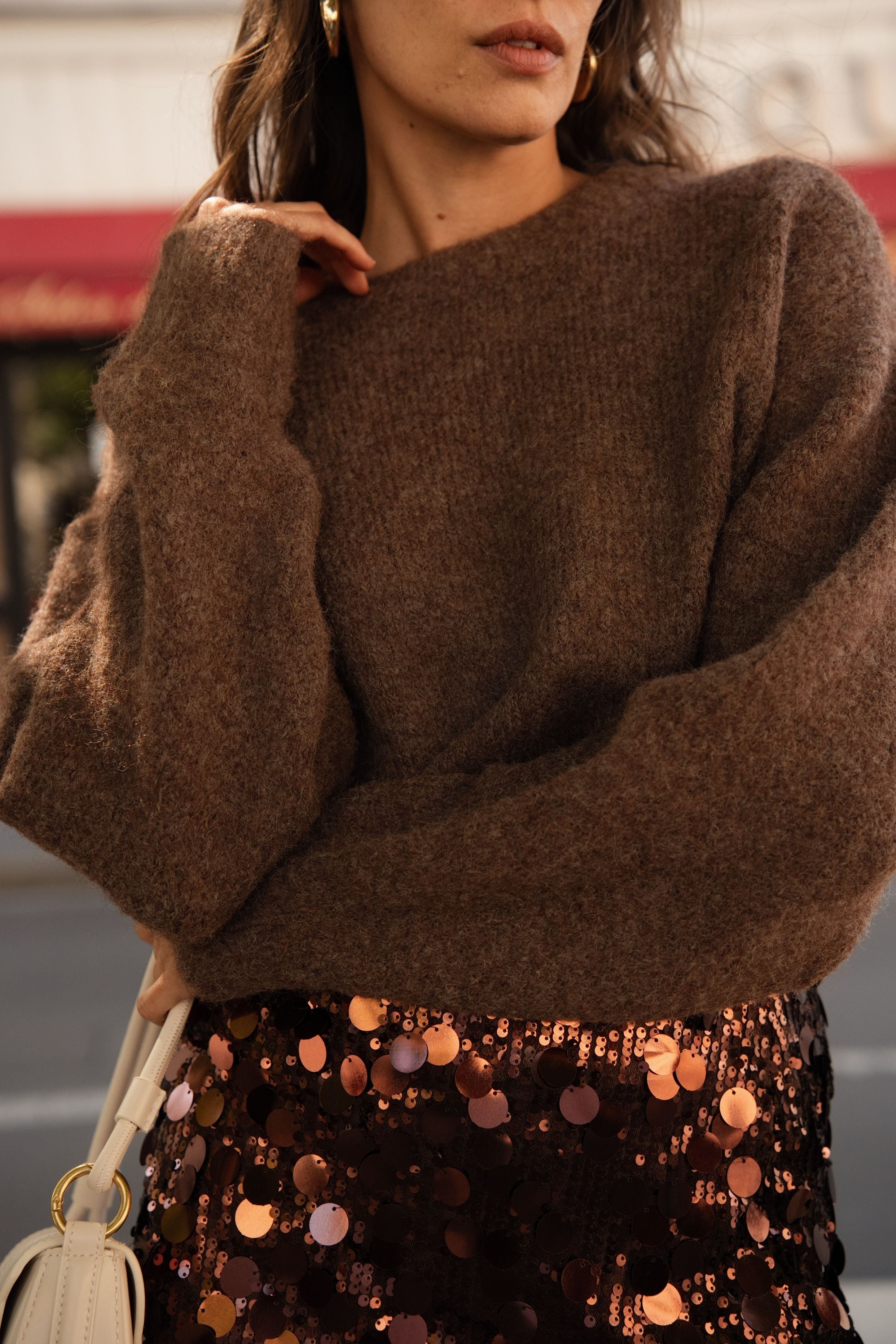 On pourrait aussi le porter sur une robe fluide pour réchauffer une silhouette tout en délicatesse, ou l’associer à un pantalon élégant pour un contraste parfait entre confort et sophistication.