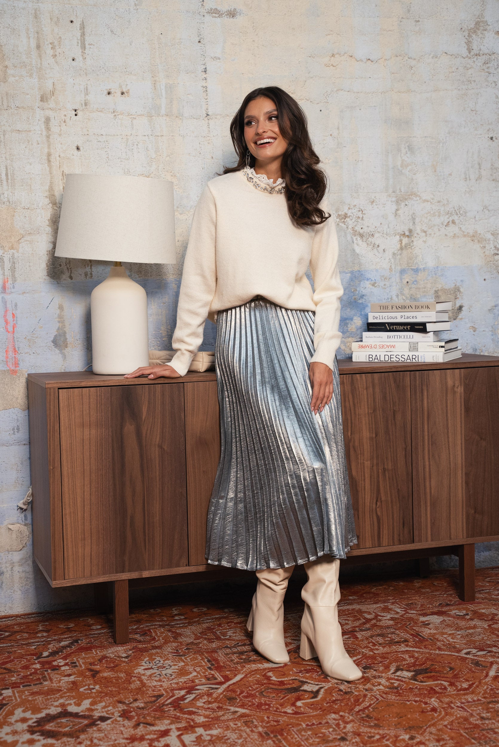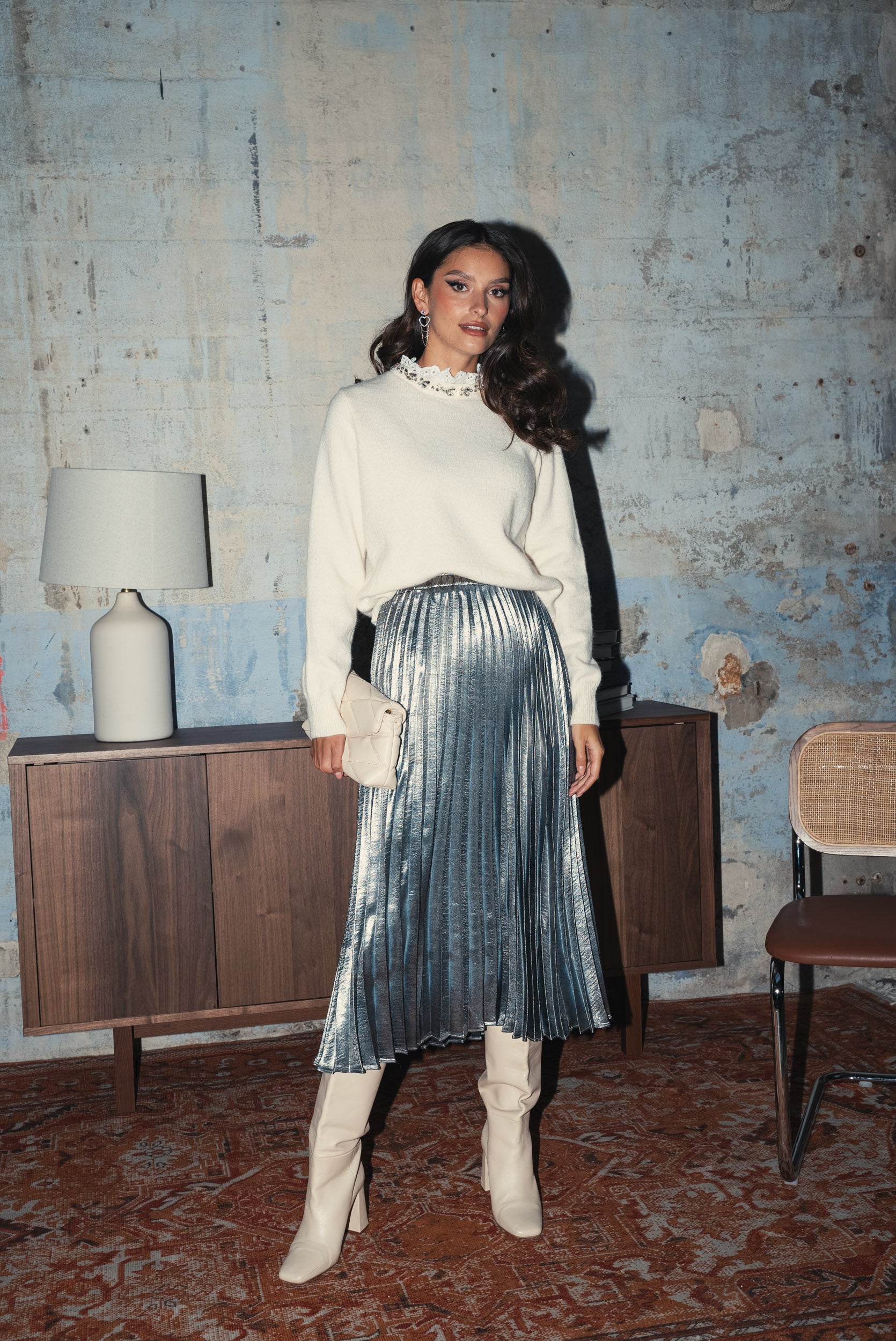 Chic et doux, notre pull Sirius avec sa teinte beige clair présente un col froufrou et des strass élégants. Un ajout raffiné à notre collection, offrant un style décontracté et sophistiqué en toute simplicité.