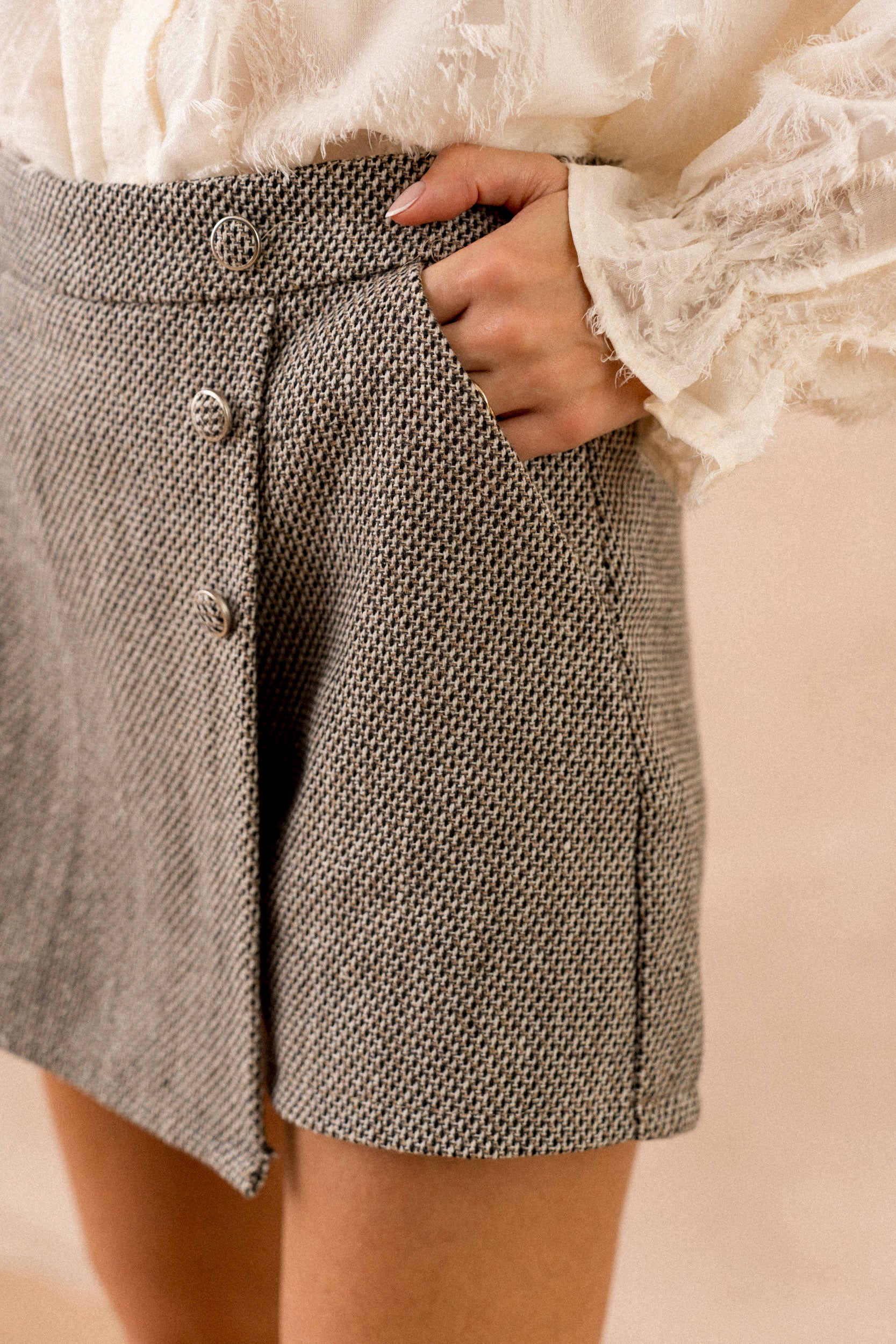 La jupe-short Suzanne est une pièce élégante et pratique, parfaite pour un style moderne et féminin. Avec sa coupe droite et ses poches latérales, elle allie confort et fonctionnalité. Les boutons décoratifs ajoutent une touche de sophistication, faisant de ce modèle un choix idéal pour toutes les occasions, du bureau aux sorties entre amis.