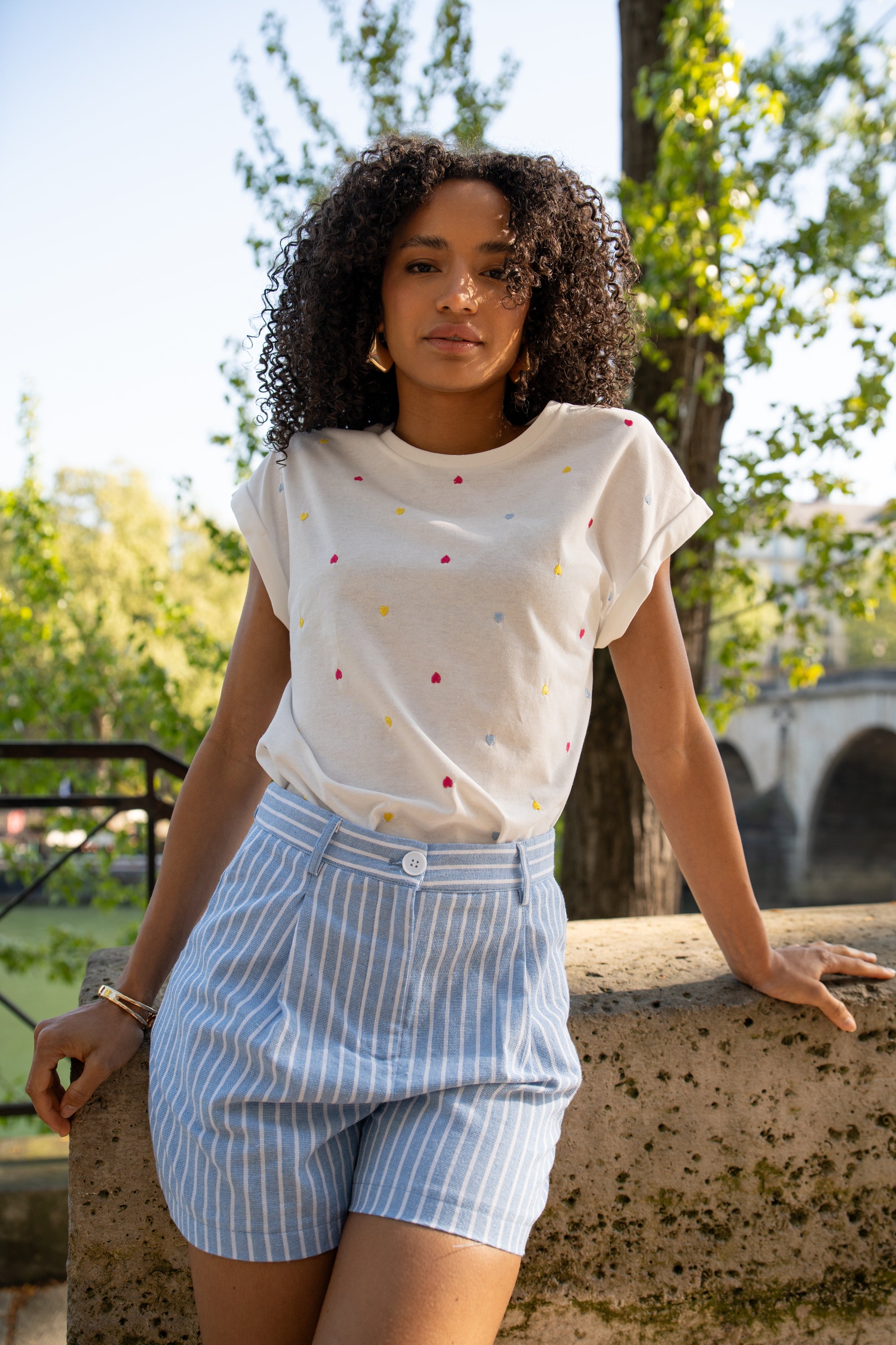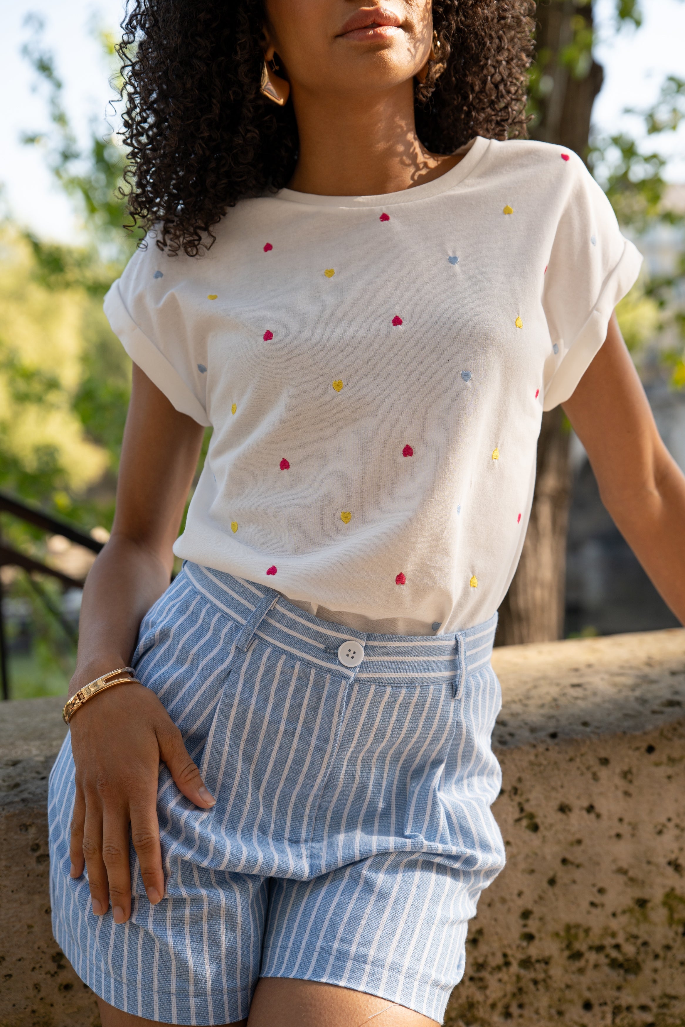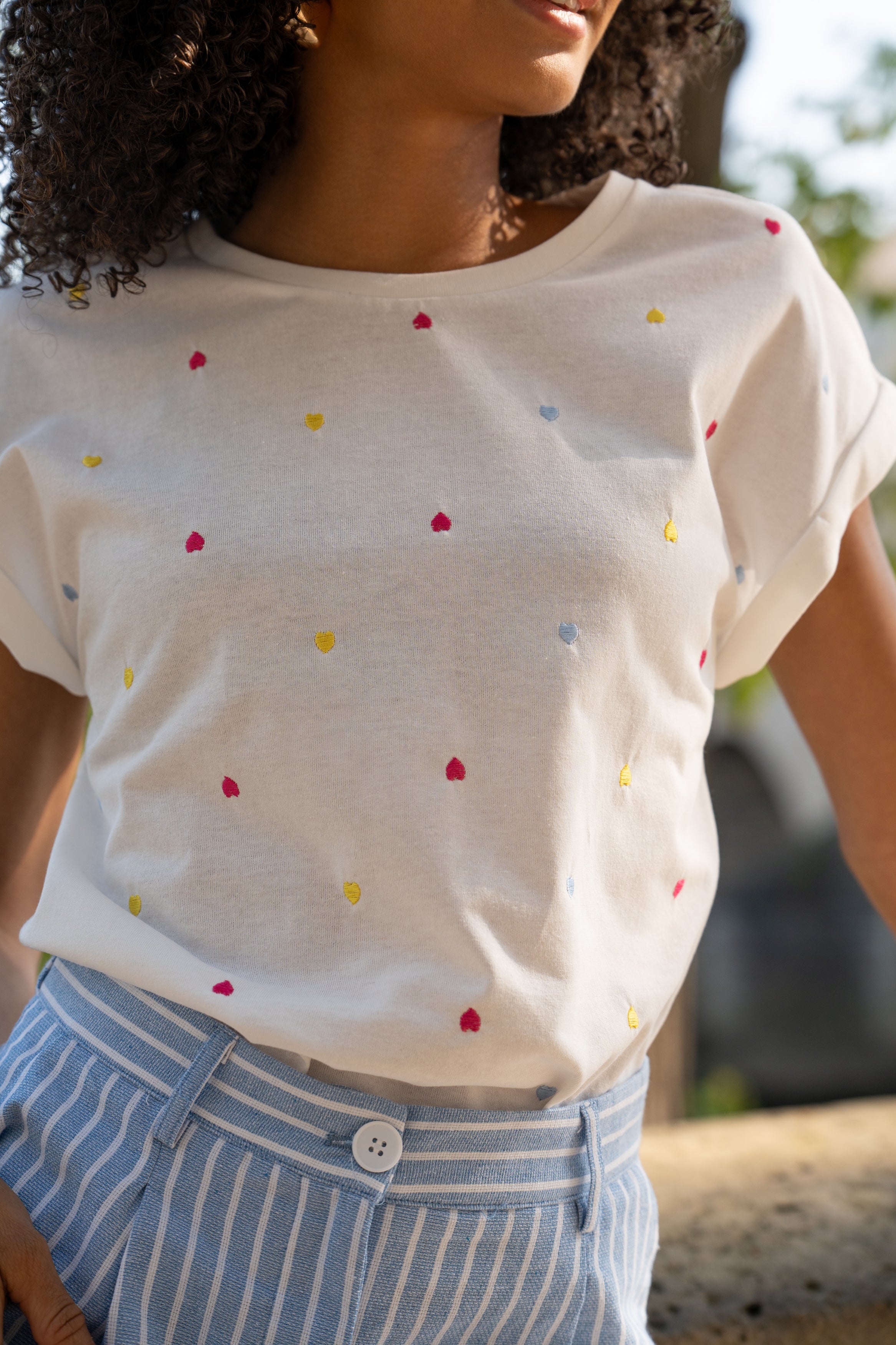 Le top Petit Cœur distille une tendresse discrète dans chaque détail. Avec son col rond tout en simplicité et ses manches courtes, il affiche une coupe douce et intemporelle. Ses motifs petits cœurs, légers et espiègles, ponctuent le tissu comme un souffle de légèreté. Un haut plein de charme, à porter près du cœur, qui accompagne les journées avec douceur et une touche de poésie.