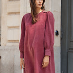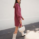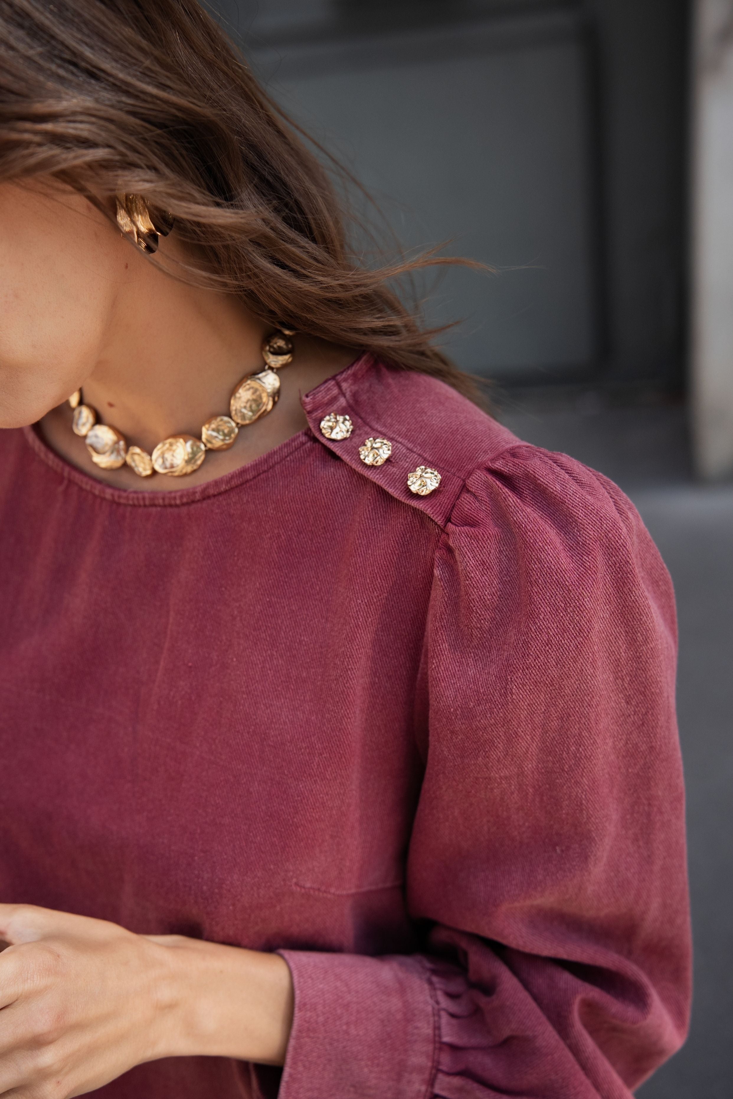 Our Jalie dress has been reinvented and renamed Célestine. This short denim dress combines the timeless simplicity of jeans with the freshness of a delicate blue. Its round neckline adds a touch of sophistication, while the gold button placket on the shoulder offers both practicality and an elegant detail.