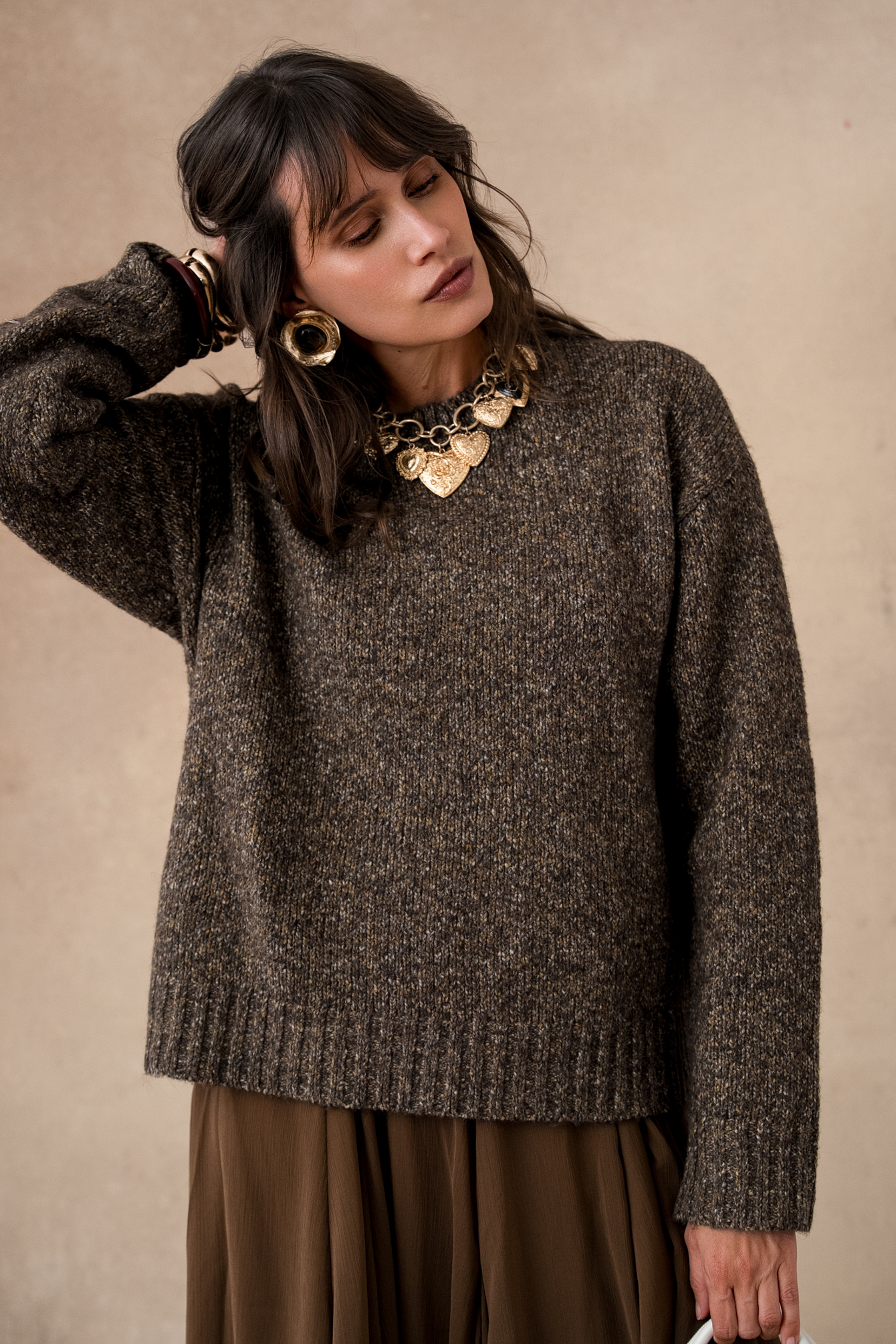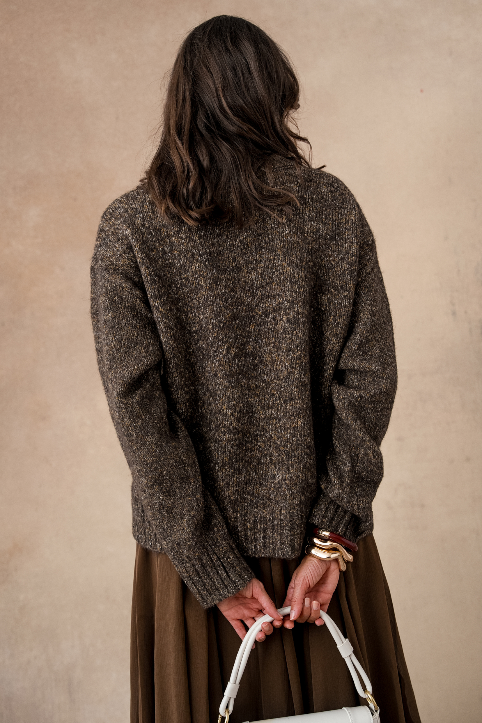 One could also imagine it worn over a flowing dress to subtly warm up the look, or paired with elegant trousers for a perfect contrast between comfort and sophistication.