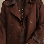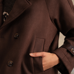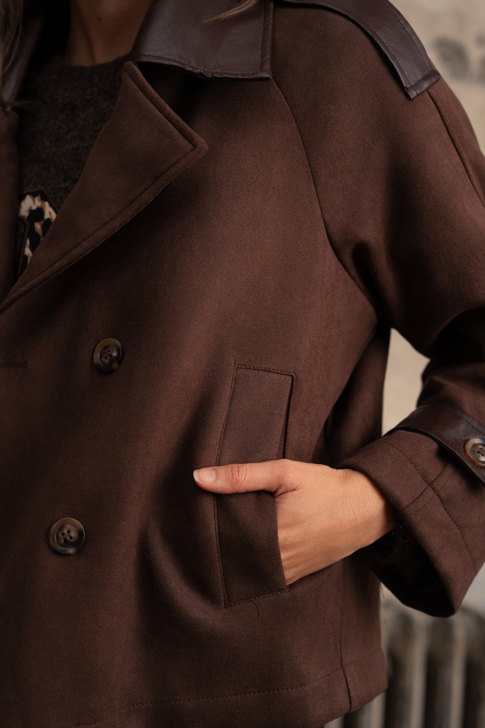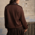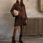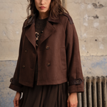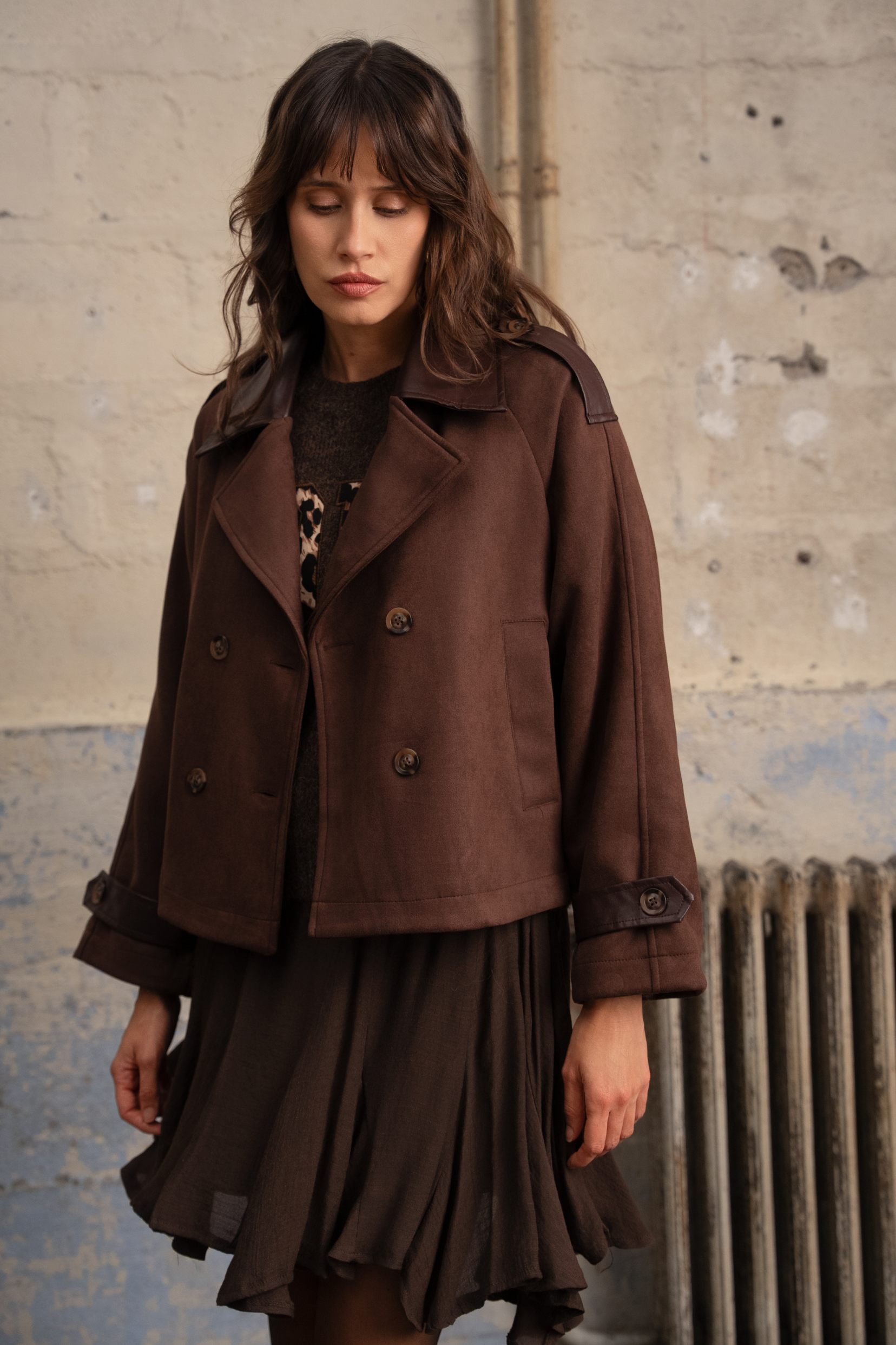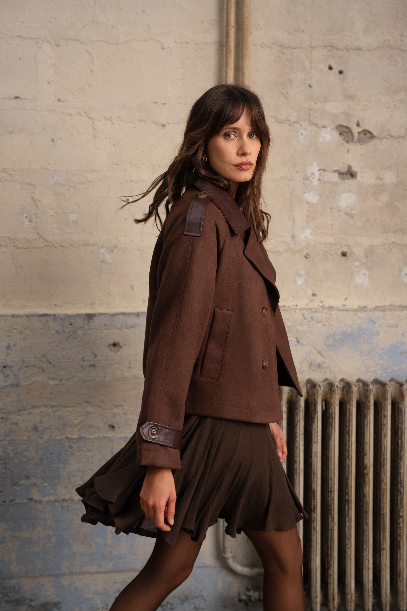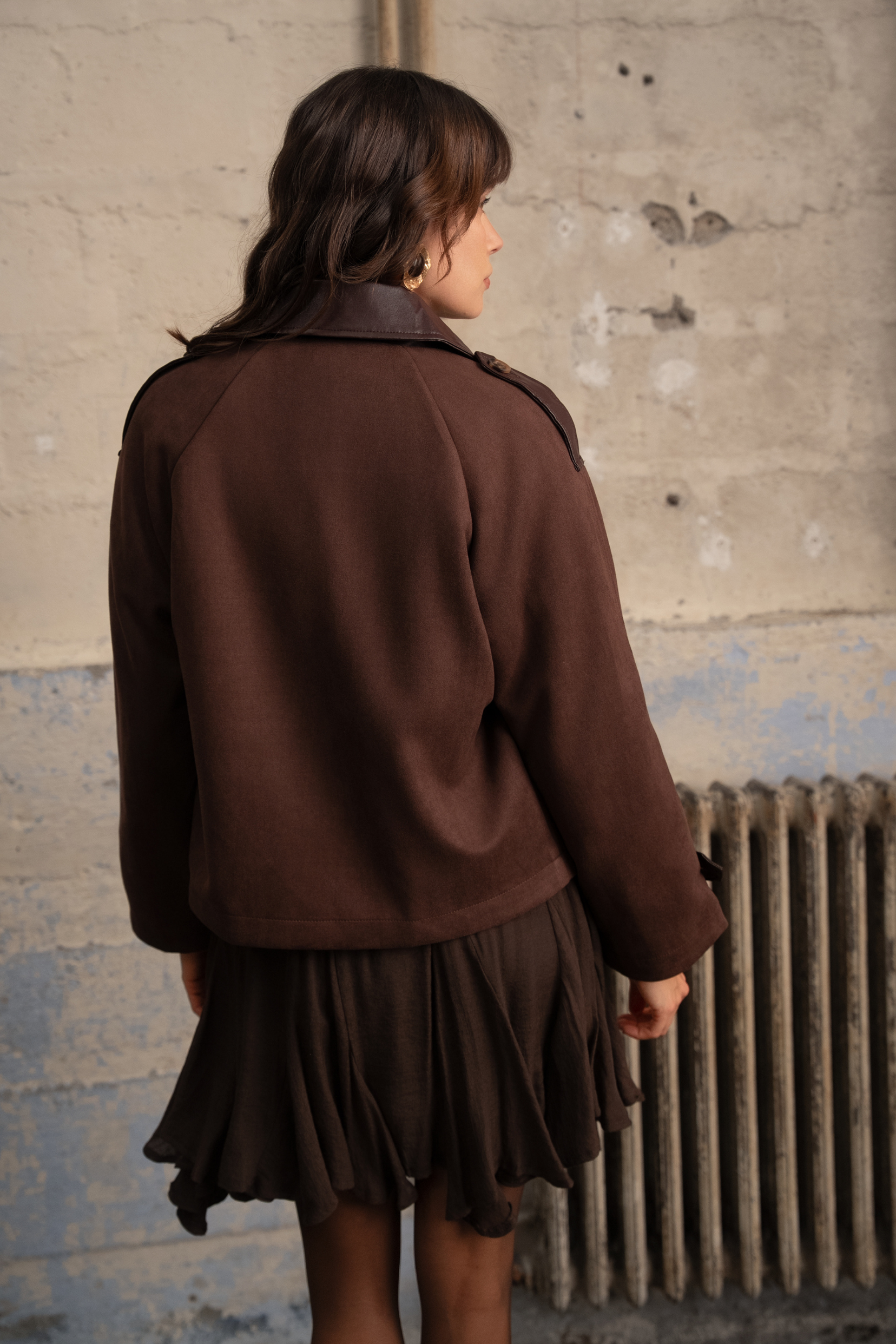 Inspired by the denim jacket, its slightly oversized cut and large patch pockets give it a casual and modern look. In its deep brown color, it becomes the ideal piece to layer: over a flowing dress to break the codes, or with printed trousers for a confident look.