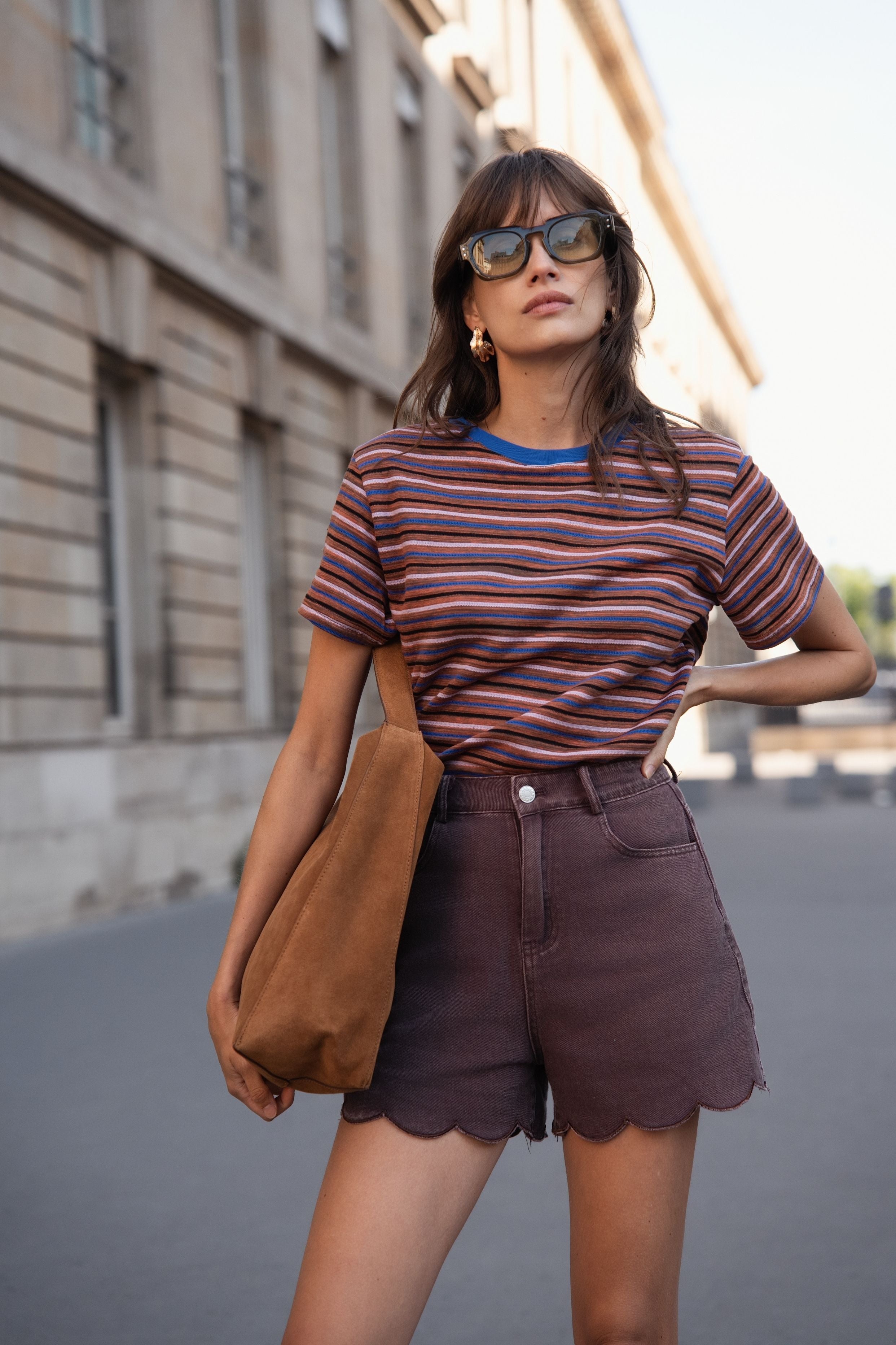 Its straight cut and short sleeves make it a casual yet elegant essential. We love its multicolored stripes that add a playful touch to your looks.