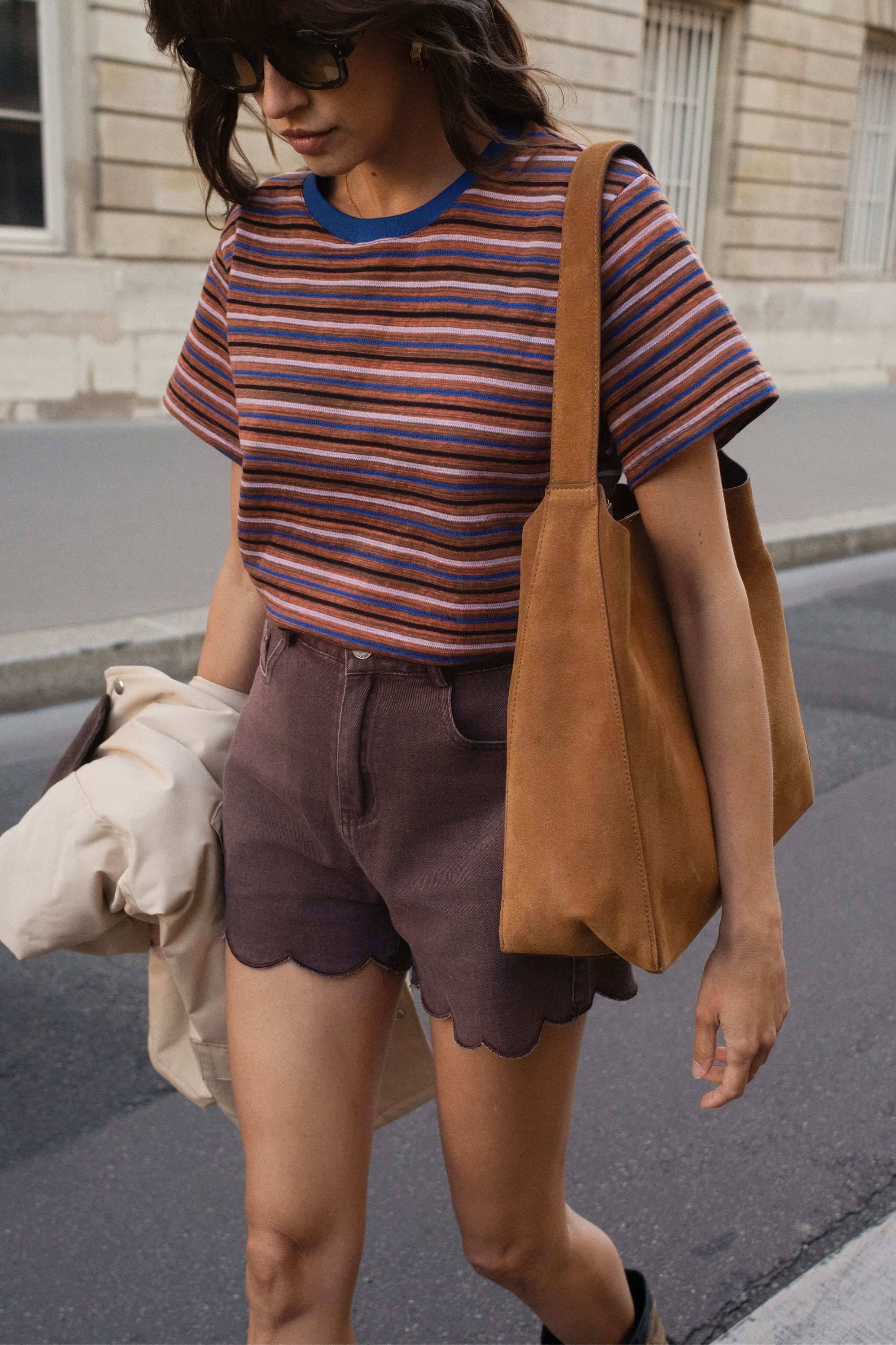 Wear it tucked into high-waisted shorts for a city look, or simply over denim for a more casual vibe.