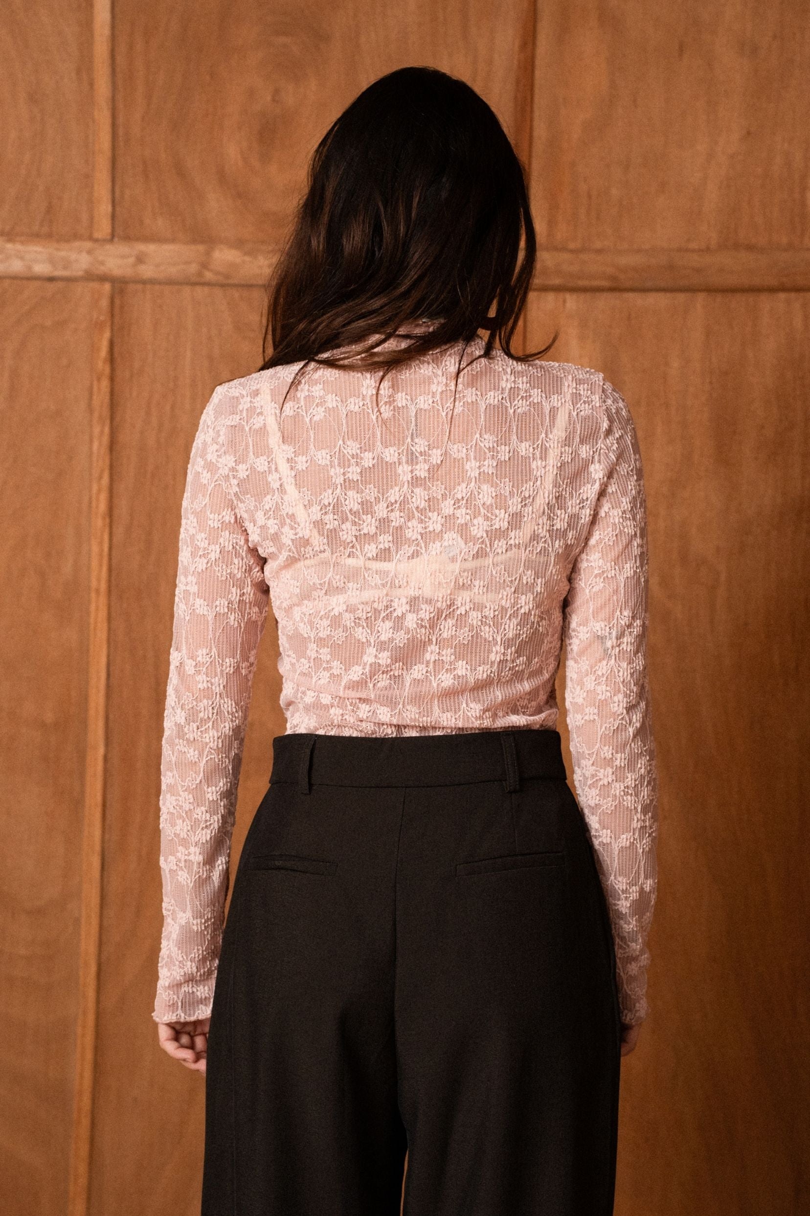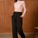 Its ribbed knit slims the silhouette while its turtleneck gently envelops, making it the ideal ally for cool days. In its deep chocolate color, it can be worn under a structured jacket for a city look, or worn alone with jeans for a minimalist and chic look.