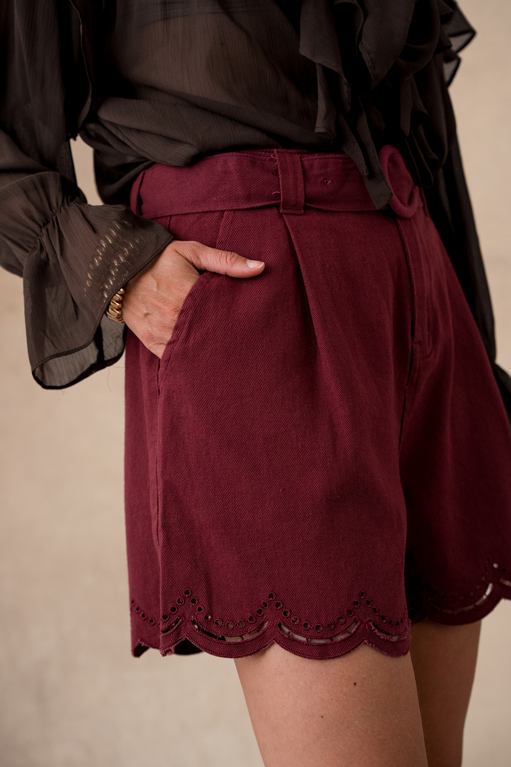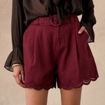 Its high-waisted cut lengthens the silhouette and emphasizes the waist thanks to its matching belt. The delicately openwork, scalloped hem adds a feminine and refined touch, which is the charm of this piece.