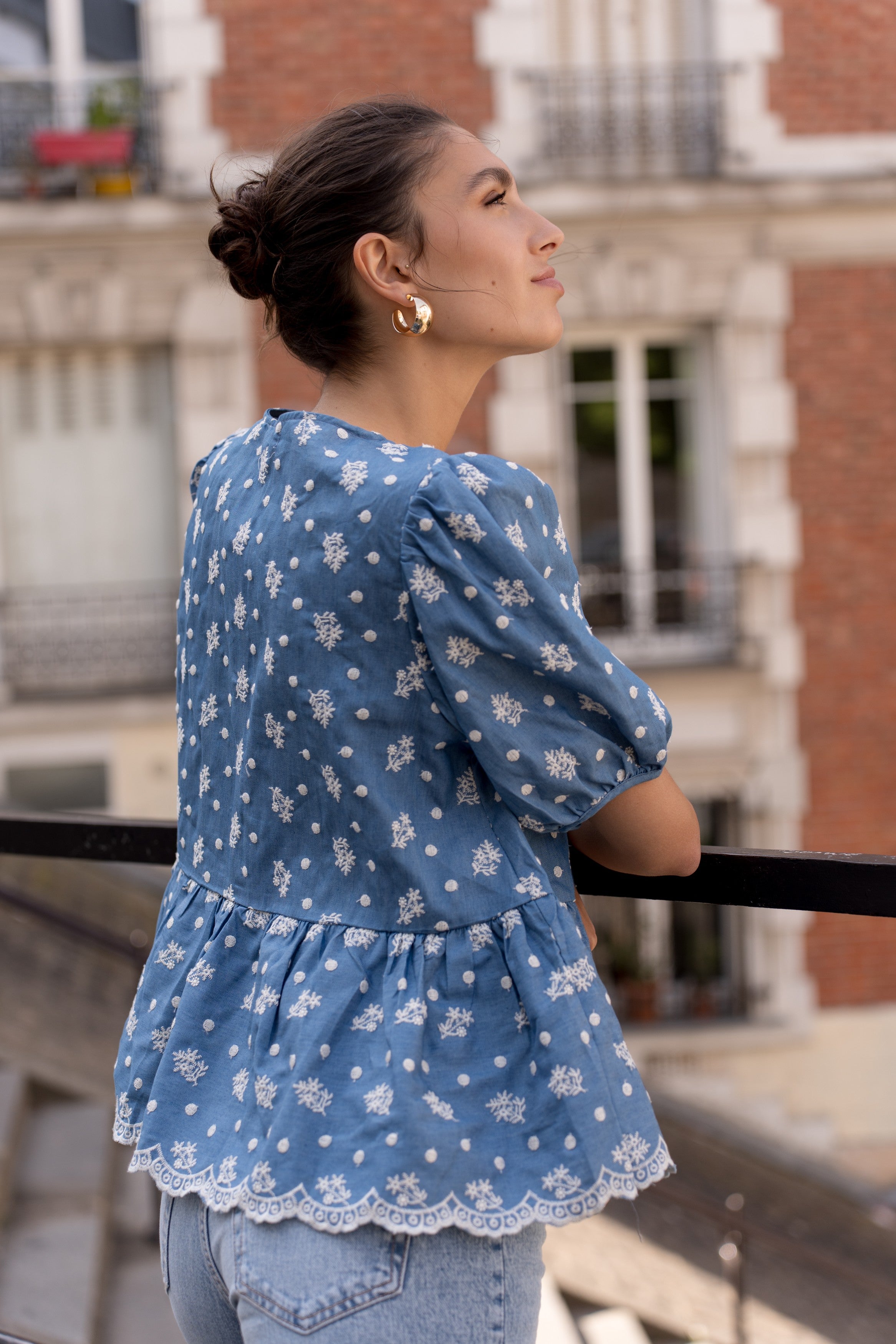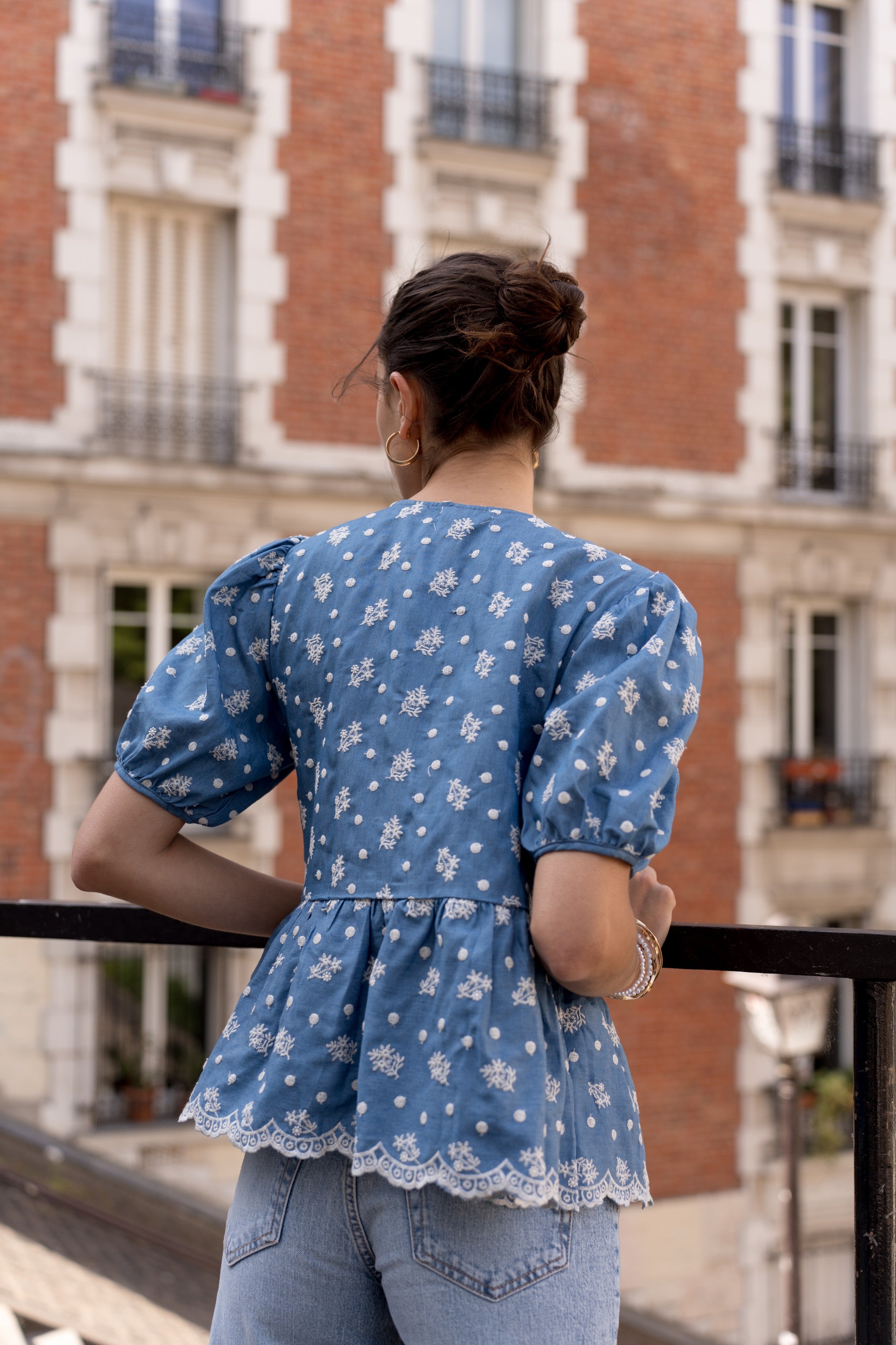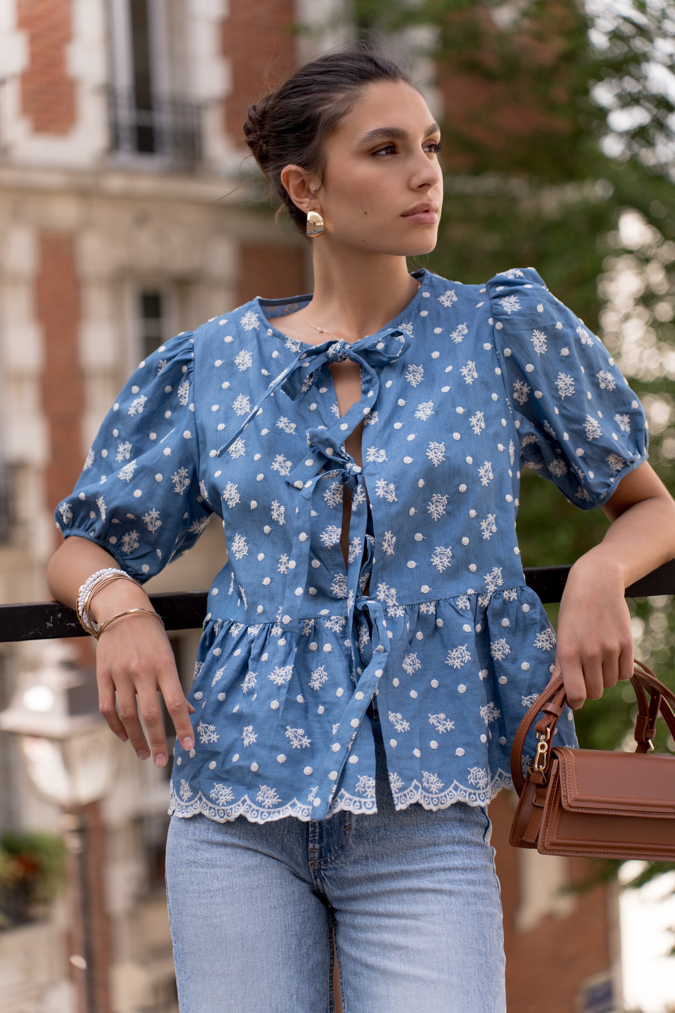 Treat yourself to a delicate and sophisticated look with our blue blouse decorated with floral embroidered details and small white dots on the front. Its balloon sleeves add a touch of elegance, while the bow fastening at the front provides a charming finish. Perfectly versatile, this blouse is ideal to complete your outfit both on a daily basis and on special occasions.