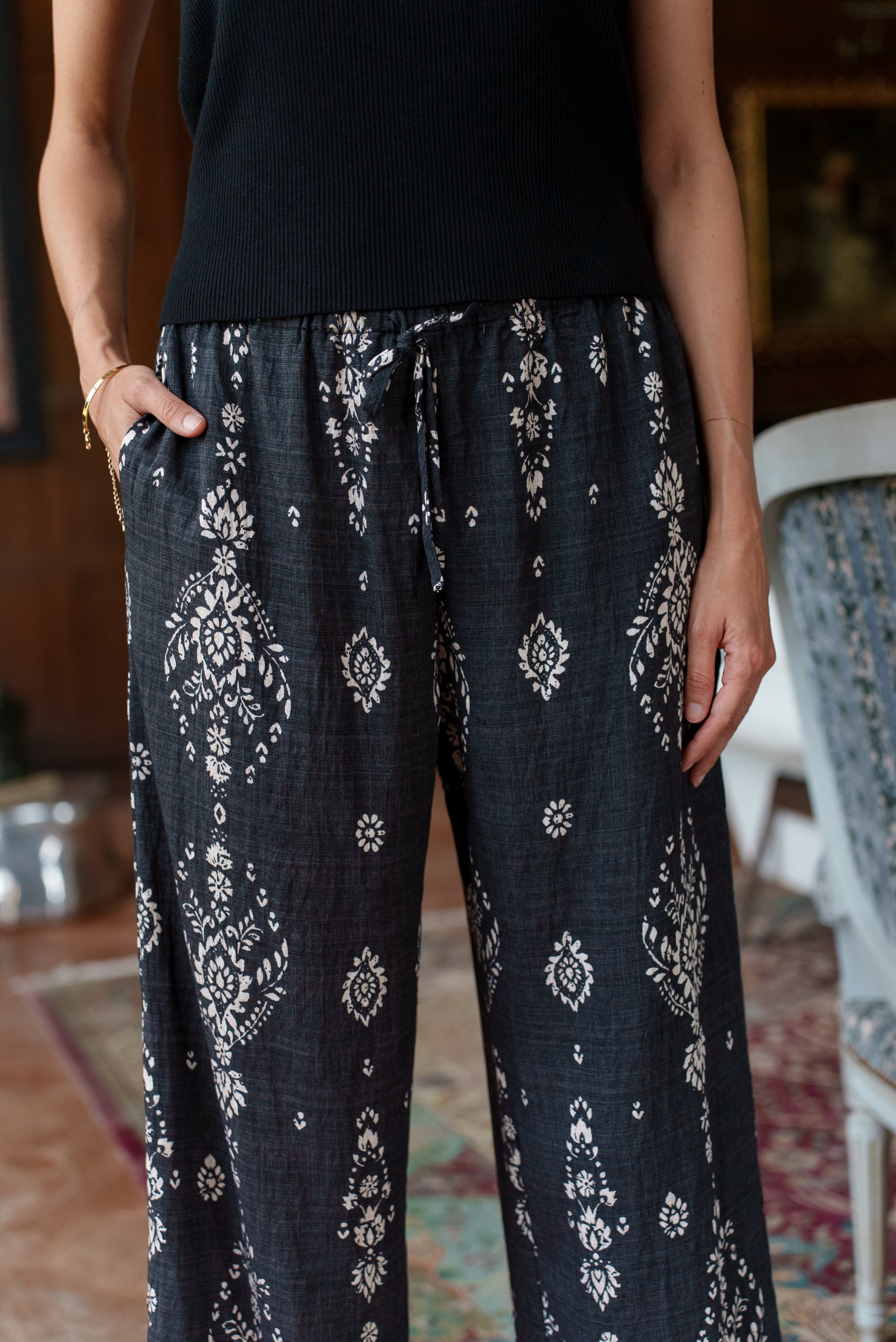 • Flowy pants with a bohemian chic print.