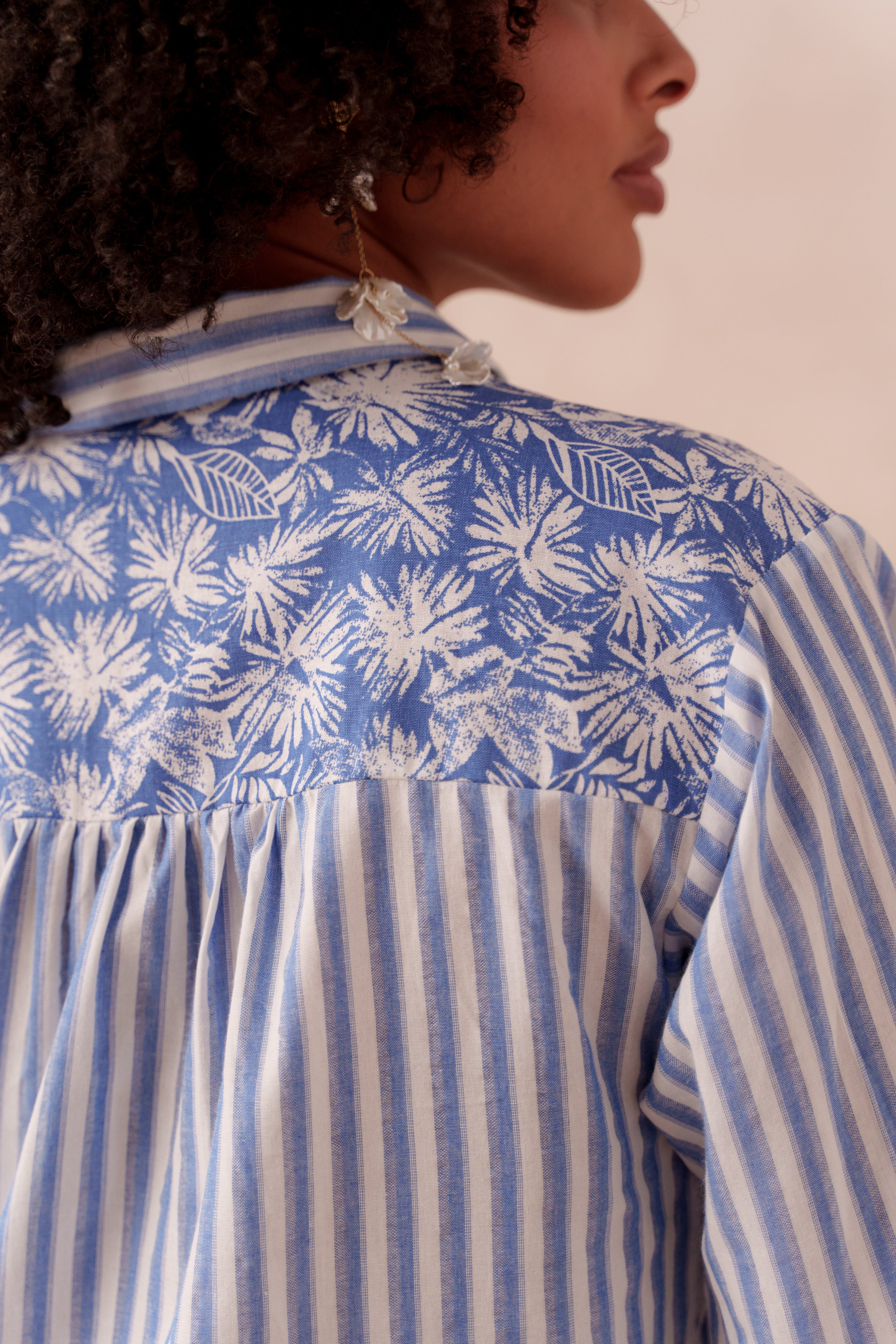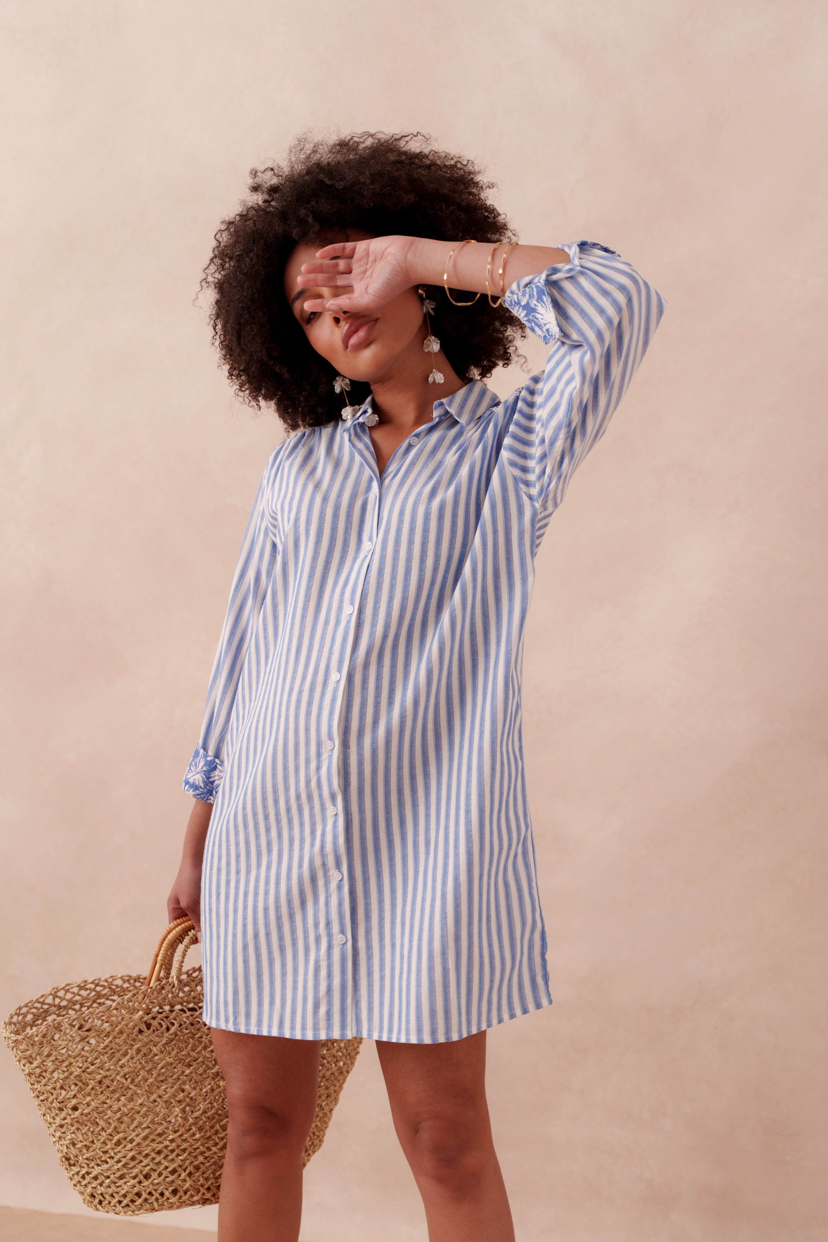 Opt for a casual yet sophisticated look with our short blue striped dress. Featuring long sleeves and a delicate floral pattern on the upper back, this dress offers a unique touch of charm. The buttoned cuffs add an elegant finish, while the straight cut and lapel collar provide a classic and chic look. Perfect for different occasions, this versatile dress ensures you have impeccable style in any season.