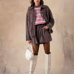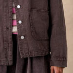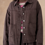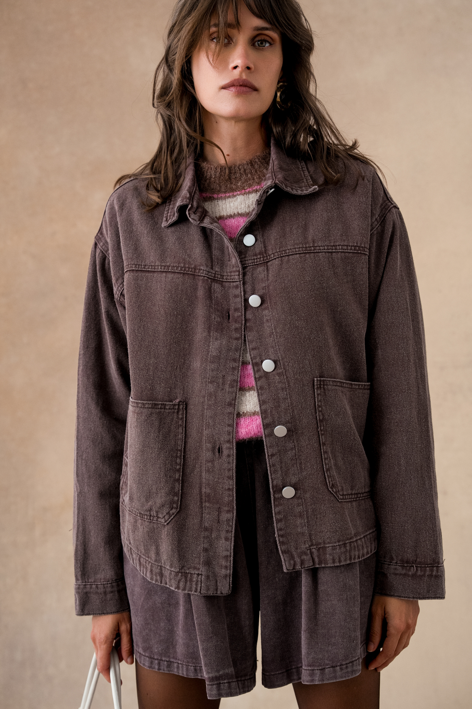 Inspired by the denim jacket, its slightly oversized cut and large patch pockets give it a casual and modern look. In its deep brown color, it becomes the ideal piece to layer: over a flowing dress to break the codes, or with printed trousers for a confident look.