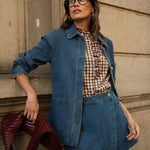 With its straight cut and soft denim, it can be worn just as well closed, like a shirt, as open over a top or a thin sweater. Its patch pockets and neat finishes make it a piece that is both practical and elegant.