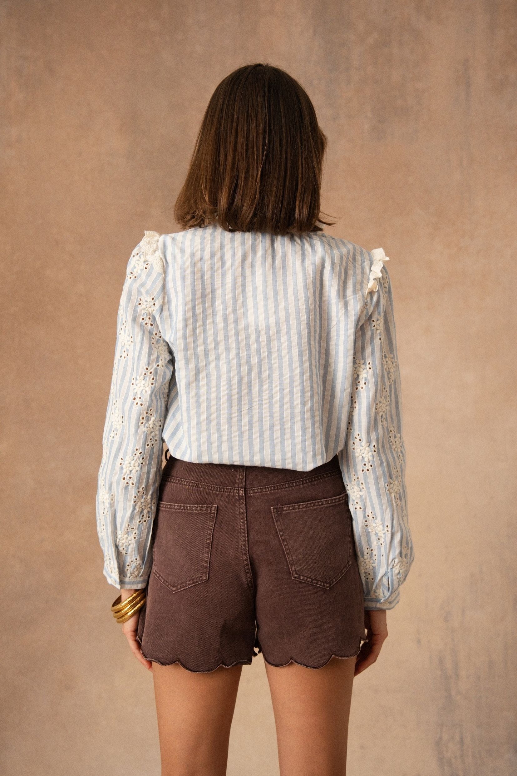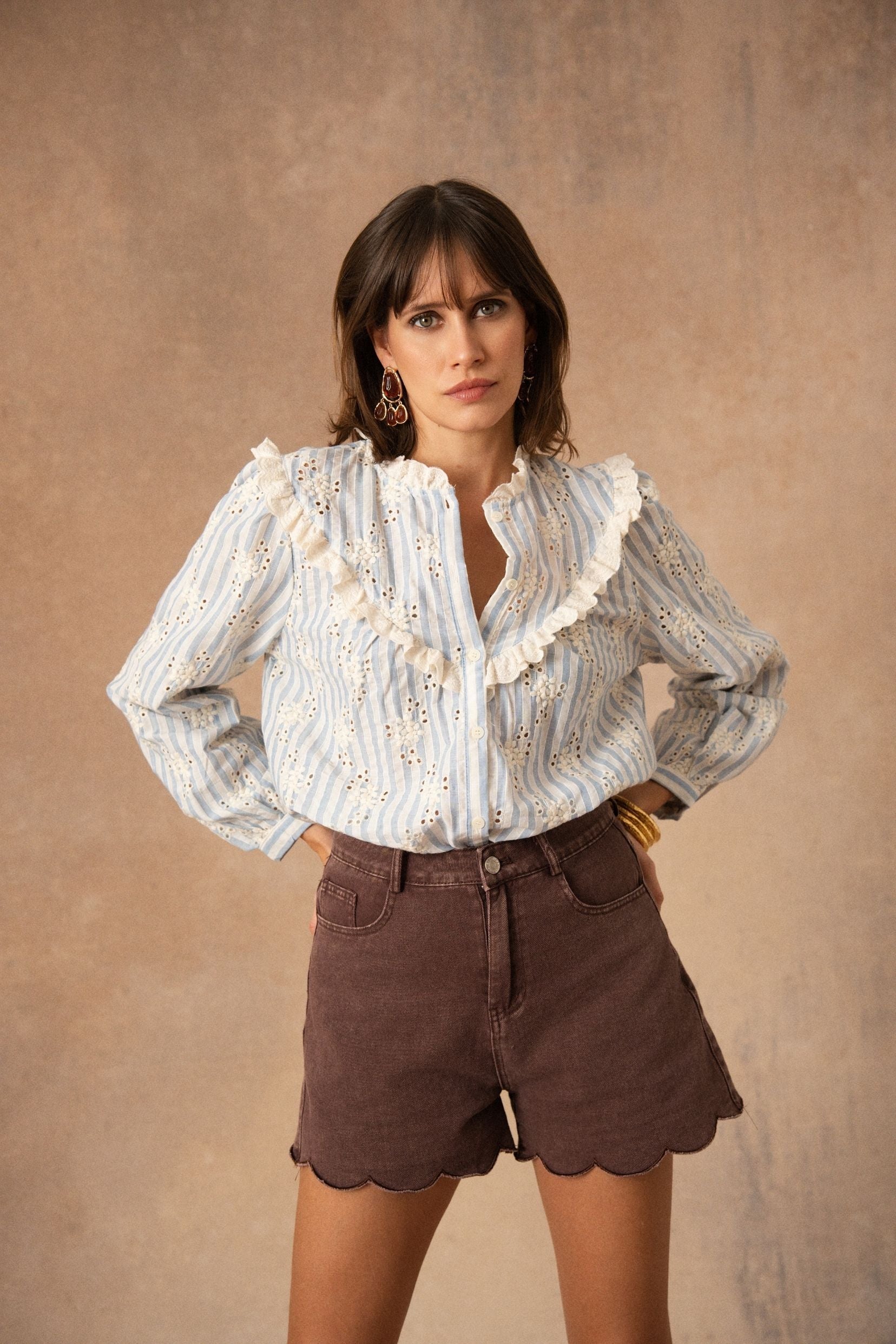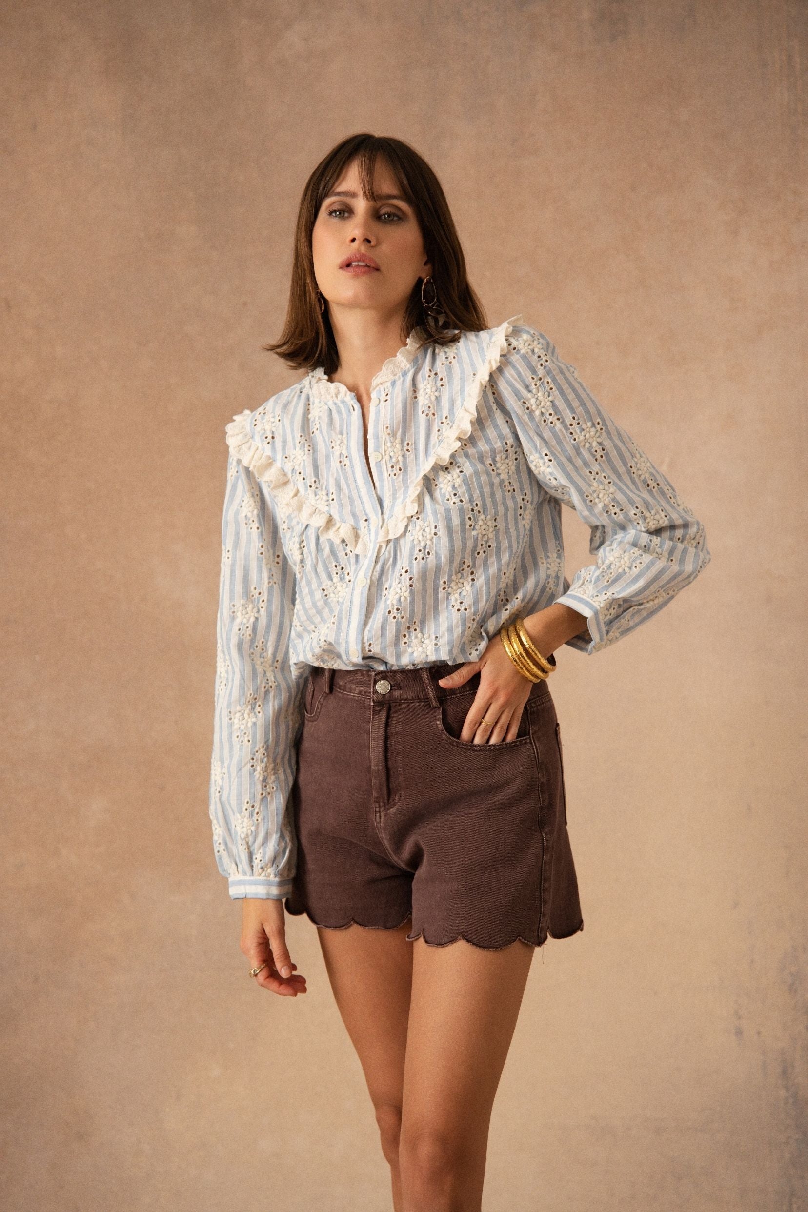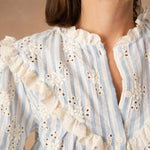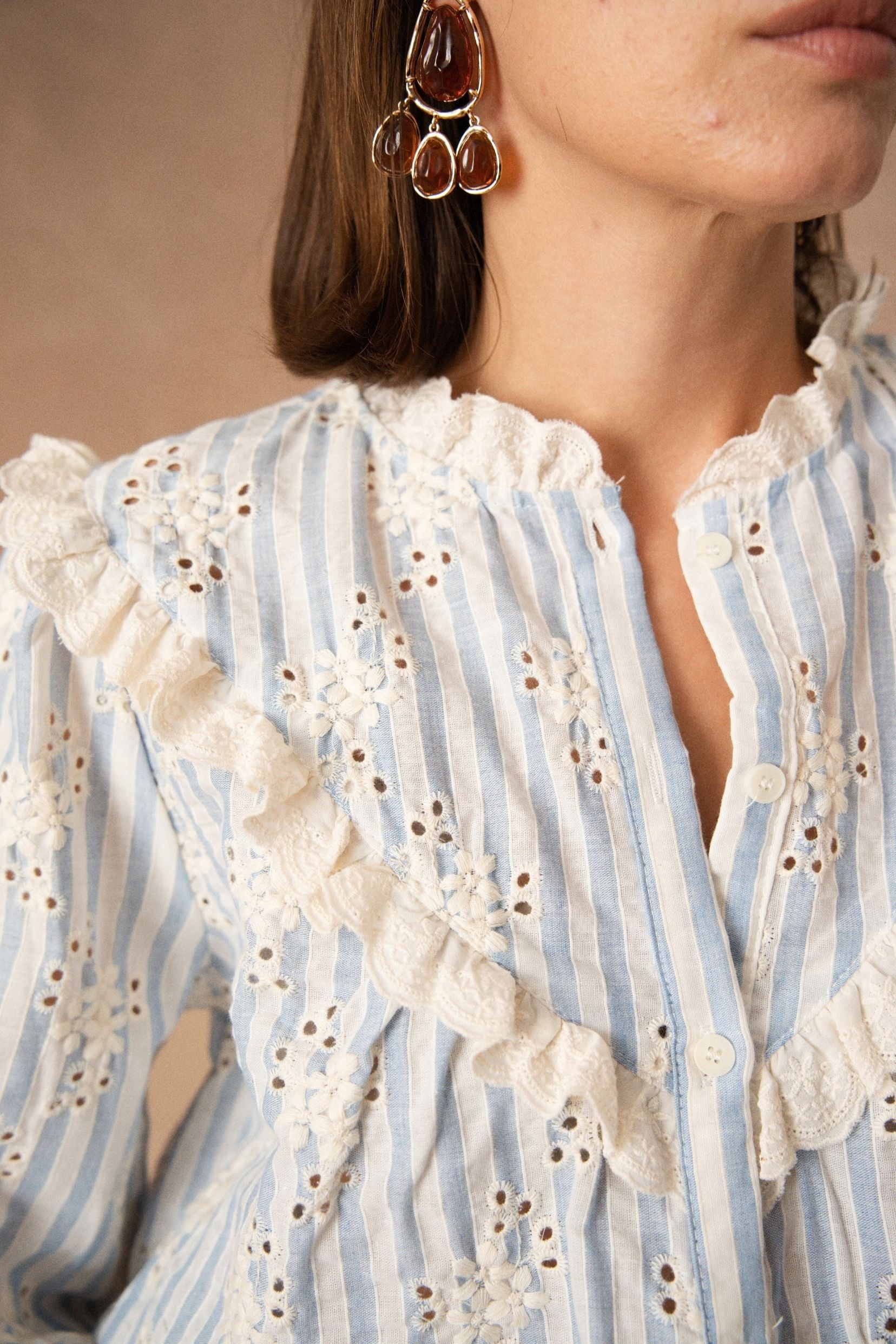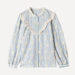 Rayures bleu ciel, petites fleurs posées en désordre, volants qui s'étagent en V sur le devant, Madeleine a ce quelque chose d'une chemise qu'on aurait trouvée au fond d'une armoire de famille et qu'on ne voudrait plus rendre.