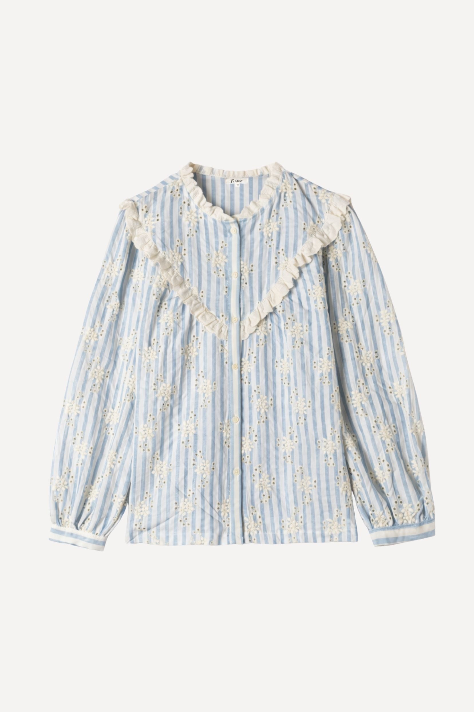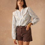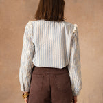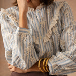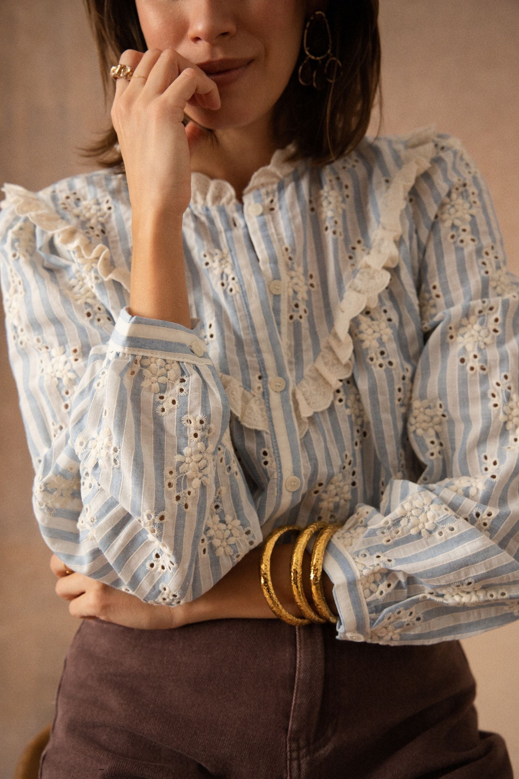 Son col montant froncé, son empiècement volanté et ses manches légèrement bouffantes composent une silhouette à la fois structurée et très douce. Une façon de s'habiller sans y penser, et pourtant.
