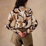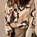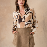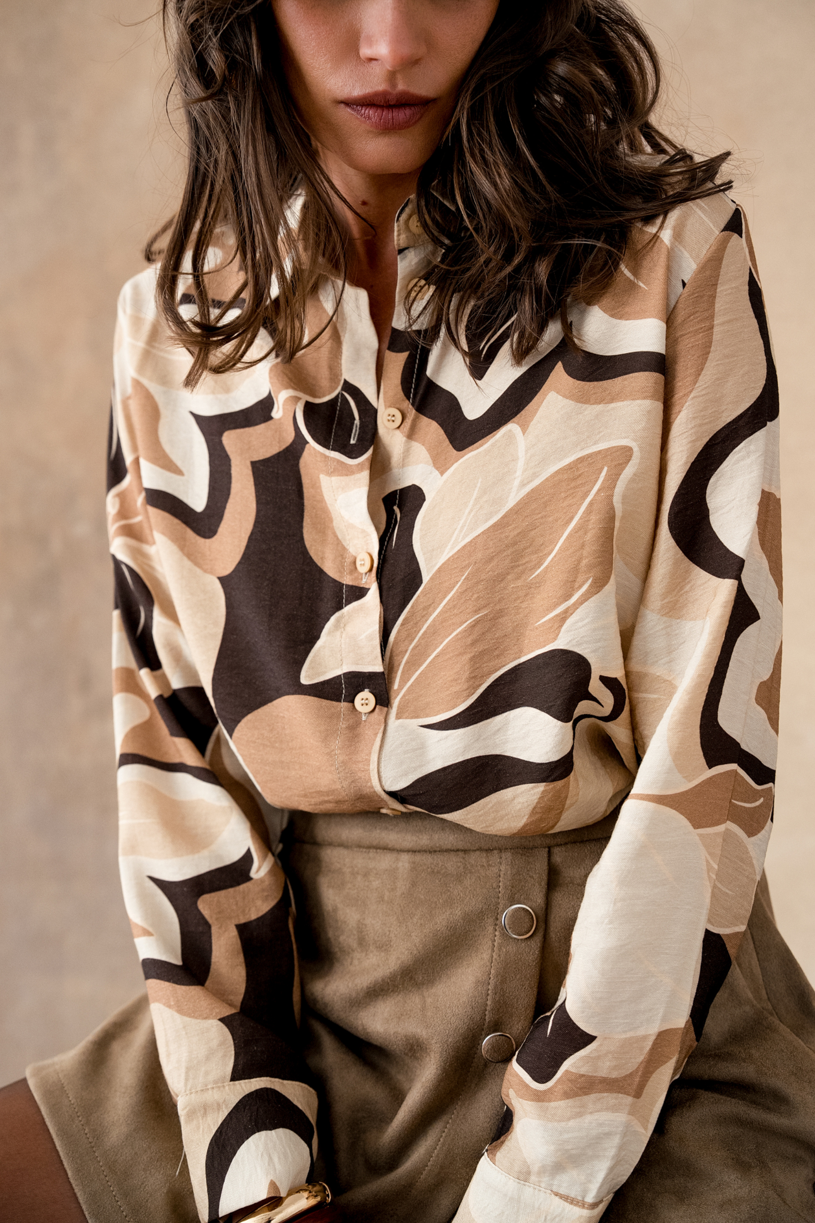 Its print in shades of brown and camel brings a graphic touch that catches the eye, while its flowing cut naturally enhances movement. We love its soft and lightweight material that caresses the skin, ideal for navigating the season with style.