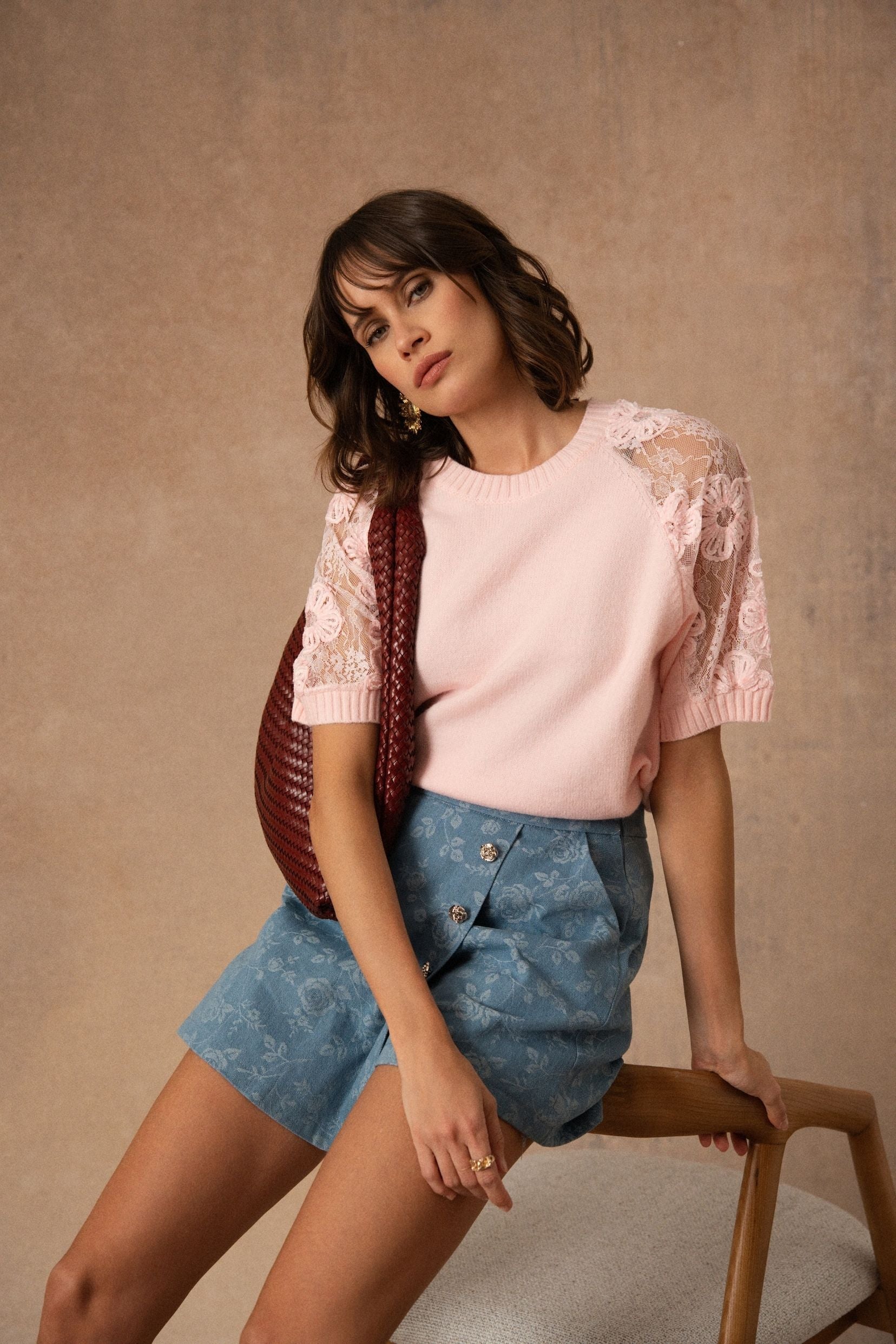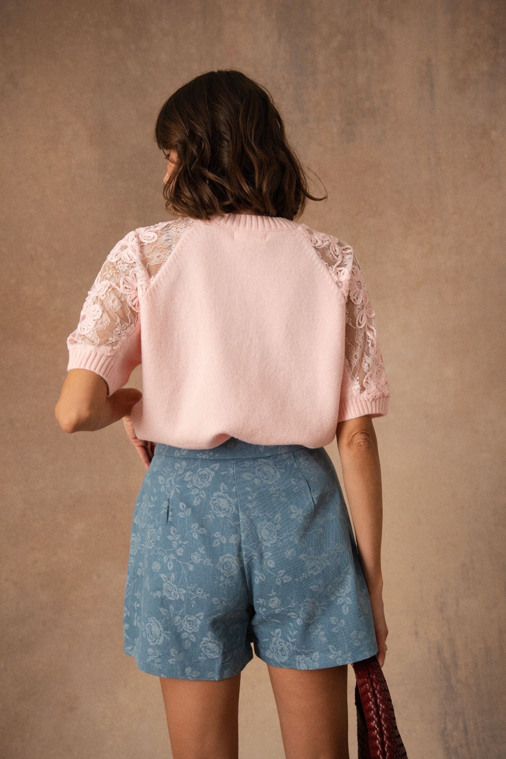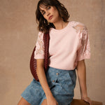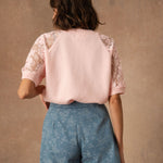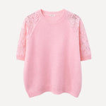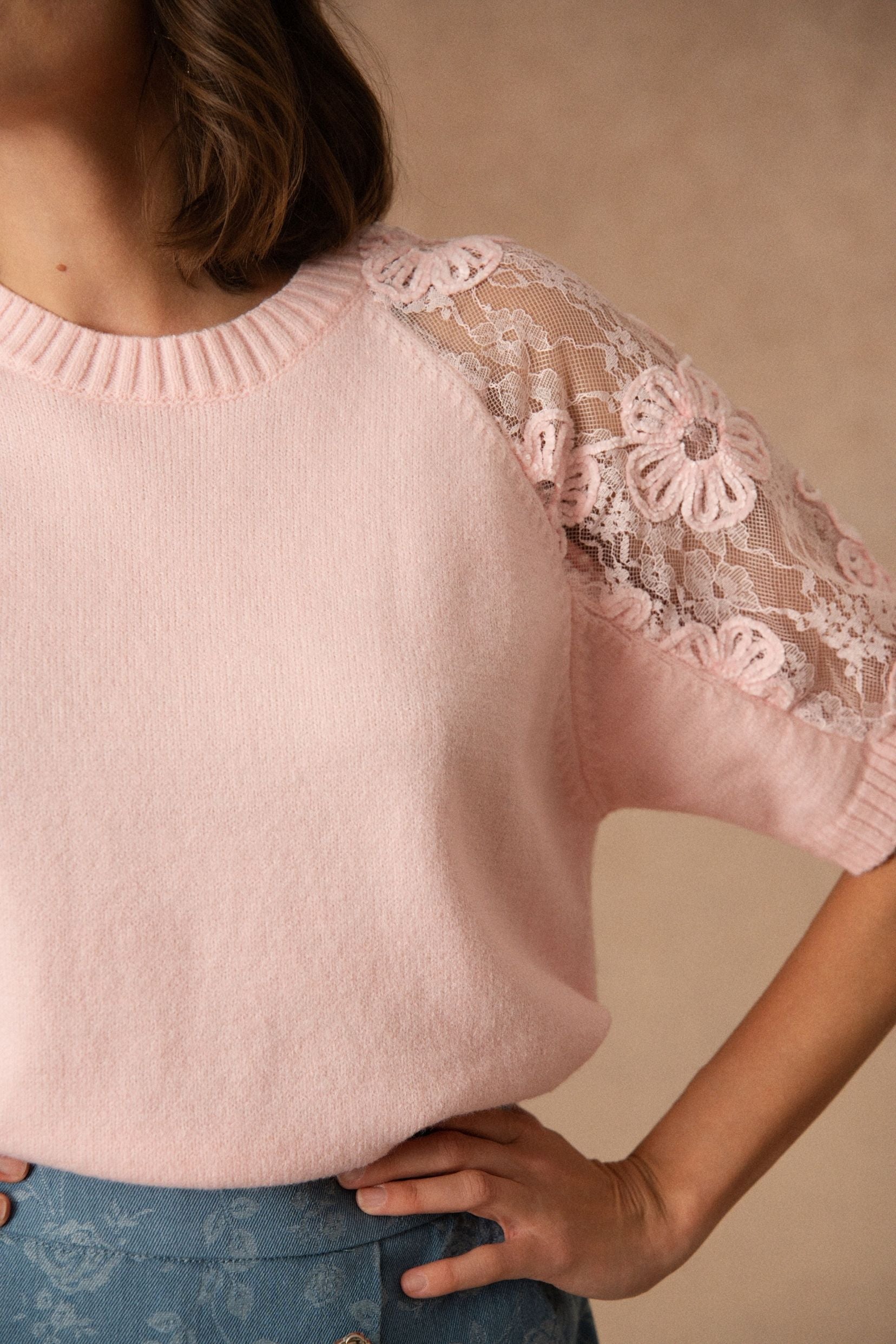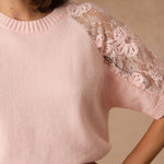 Les empiècements en dentelle florale sur les épaules et les manches viennent délicatement contraster avec la maille douce. La transparence laisse deviner la peau avec subtilité et apporte ce relief léger qui attire le regard.