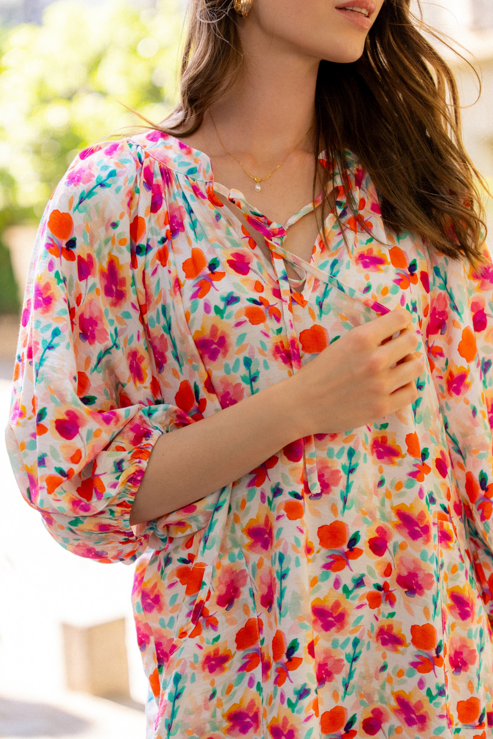 The Clem dress is captivating with its short, A-line cut, ideal for a feminine and comfortable silhouette. Made from a lightweight fabric with a floral print, it evokes the freshness and softness of sunny days. Its round neckline is adorned with a tie, adding a delicate and adjustable touch to the neck. The 3/4 sleeves complete the look elegantly, for a style that is both chic and easy to wear every day.