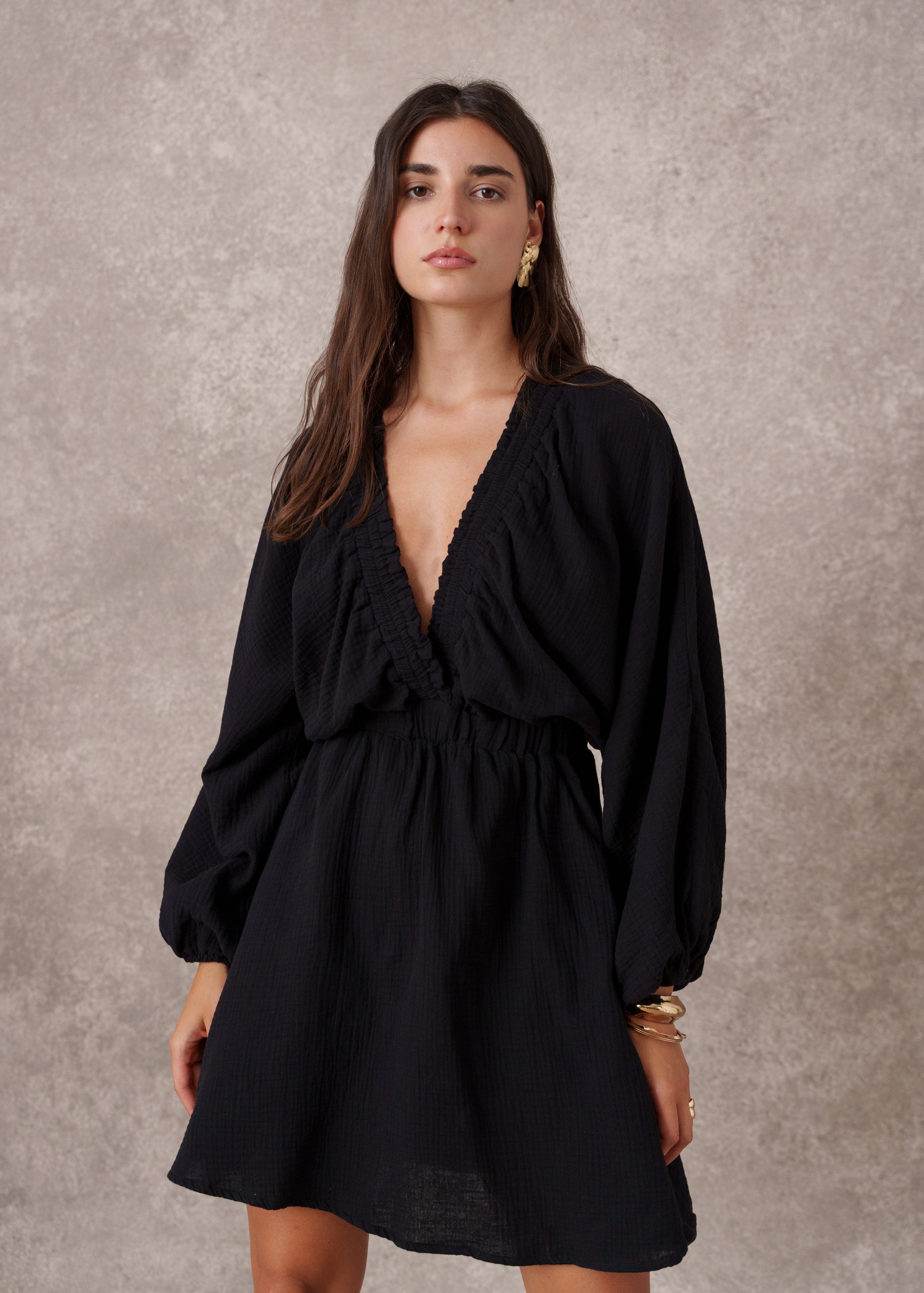 Immerse yourself in elegance with our June dress. It will undoubtedly become your favorite little black dress. Its V-neck and skater cut make it a piece that is both contemporary and elegant. The June dress can be worn both day and night, for a dinner with friends.
