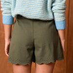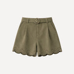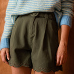 Its high-waisted cut lengthens the silhouette and emphasizes the waist thanks to its matching belt. The delicately openwork, scalloped hem adds a feminine and refined touch, which is the charm of this piece.