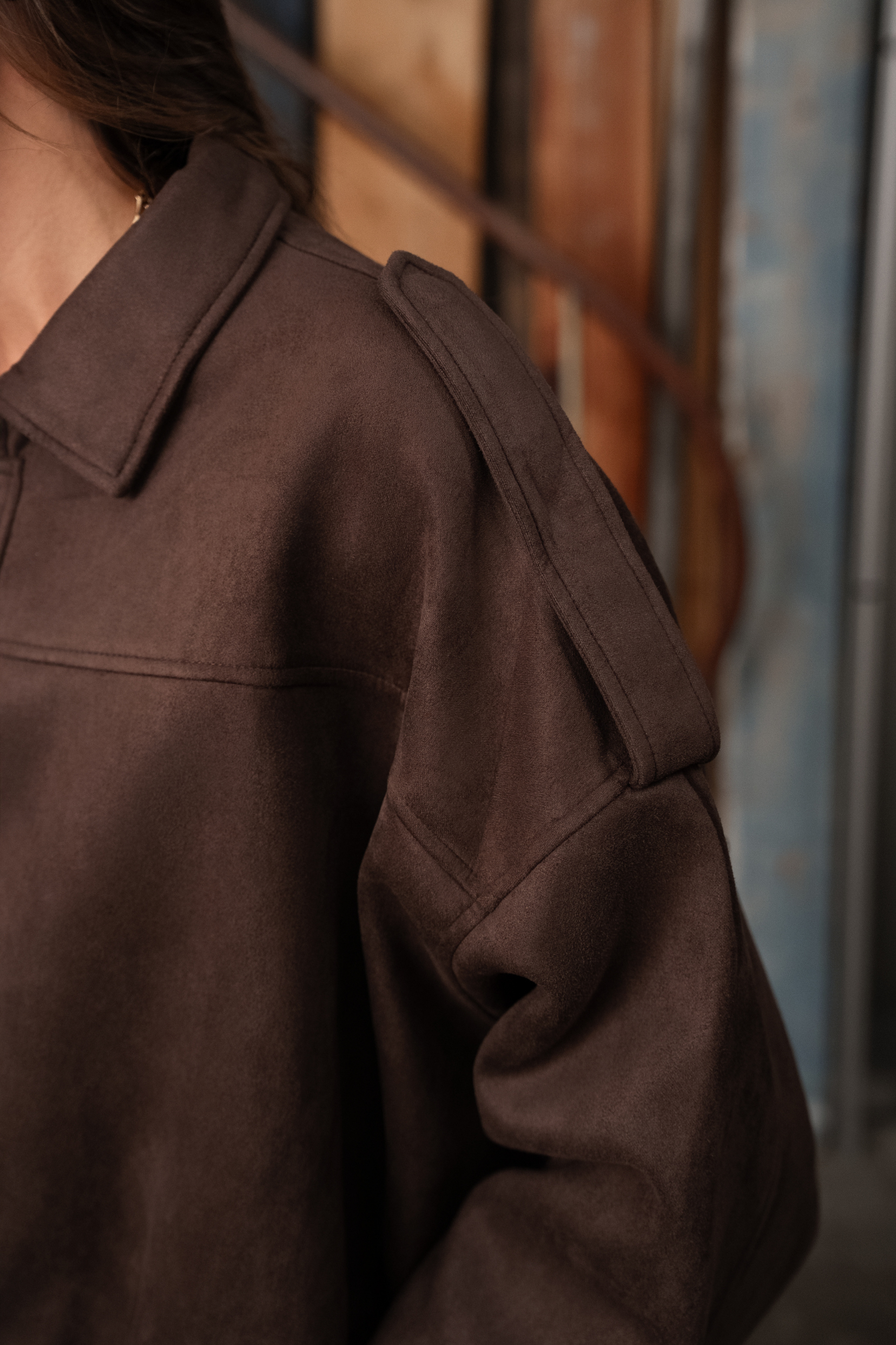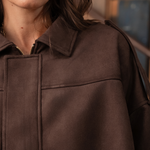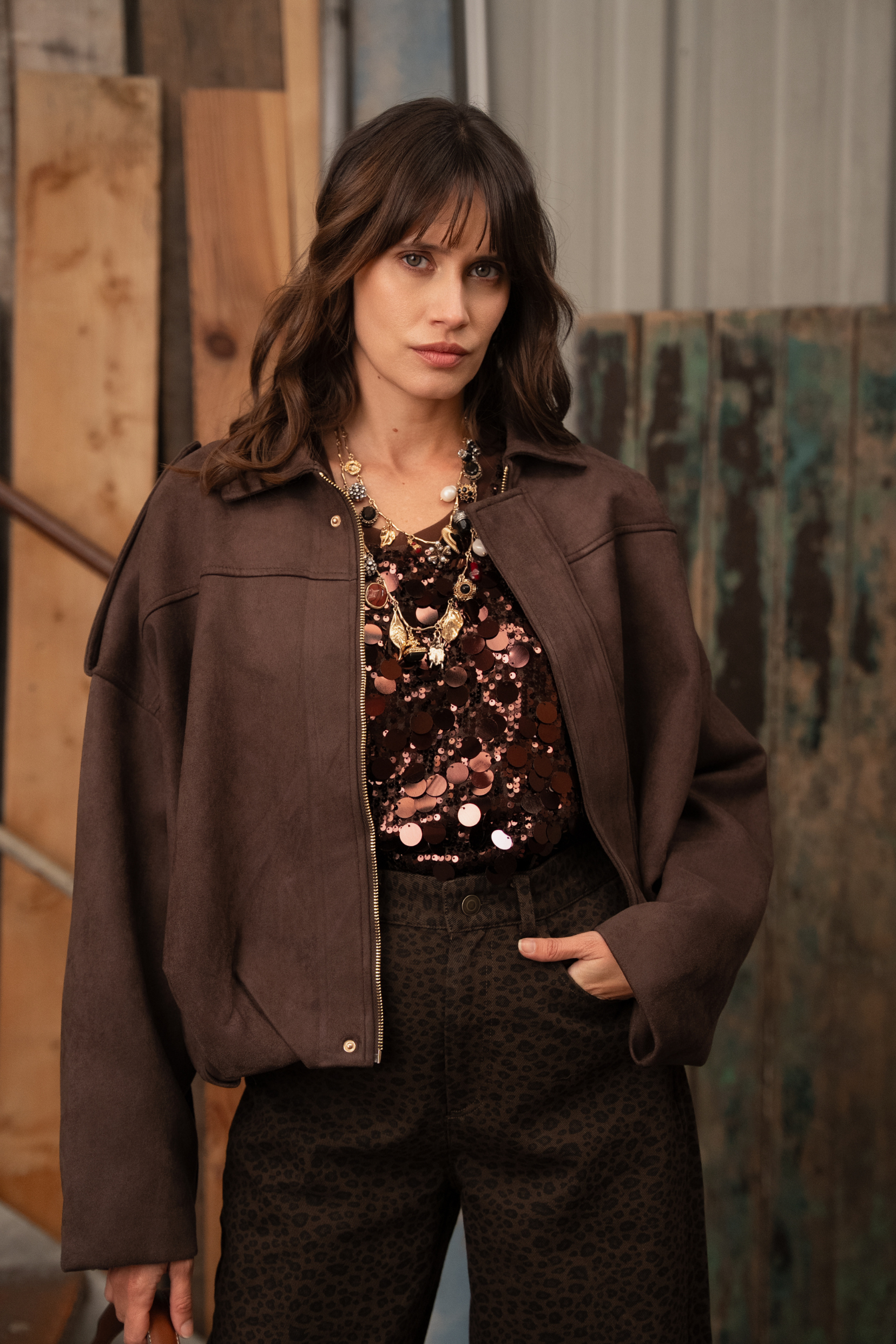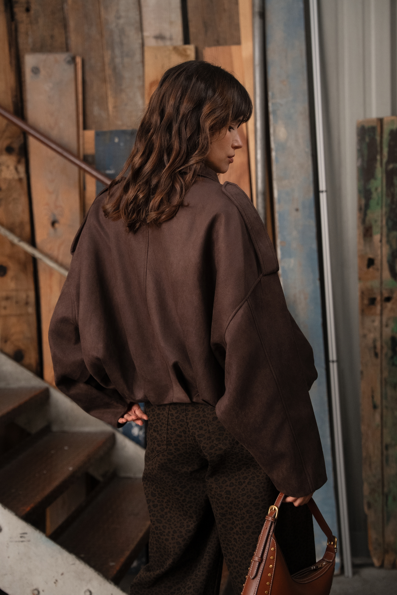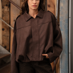Inspired by the denim jacket, its slightly oversized cut and large patch pockets give it a casual and modern look. In its deep brown color, it becomes the ideal piece to layer: over a flowing dress to break the codes, or with printed trousers for a confident look.