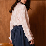 Son rose poudré illumine la silhouette avec subtilité, tandis que son jeu de transparence et de reliefs apporte une dimension aérienne à la pièce. C’est une blouse pensée pour celles qui aiment les détails délicats, sans jamais renoncer au confort.