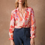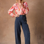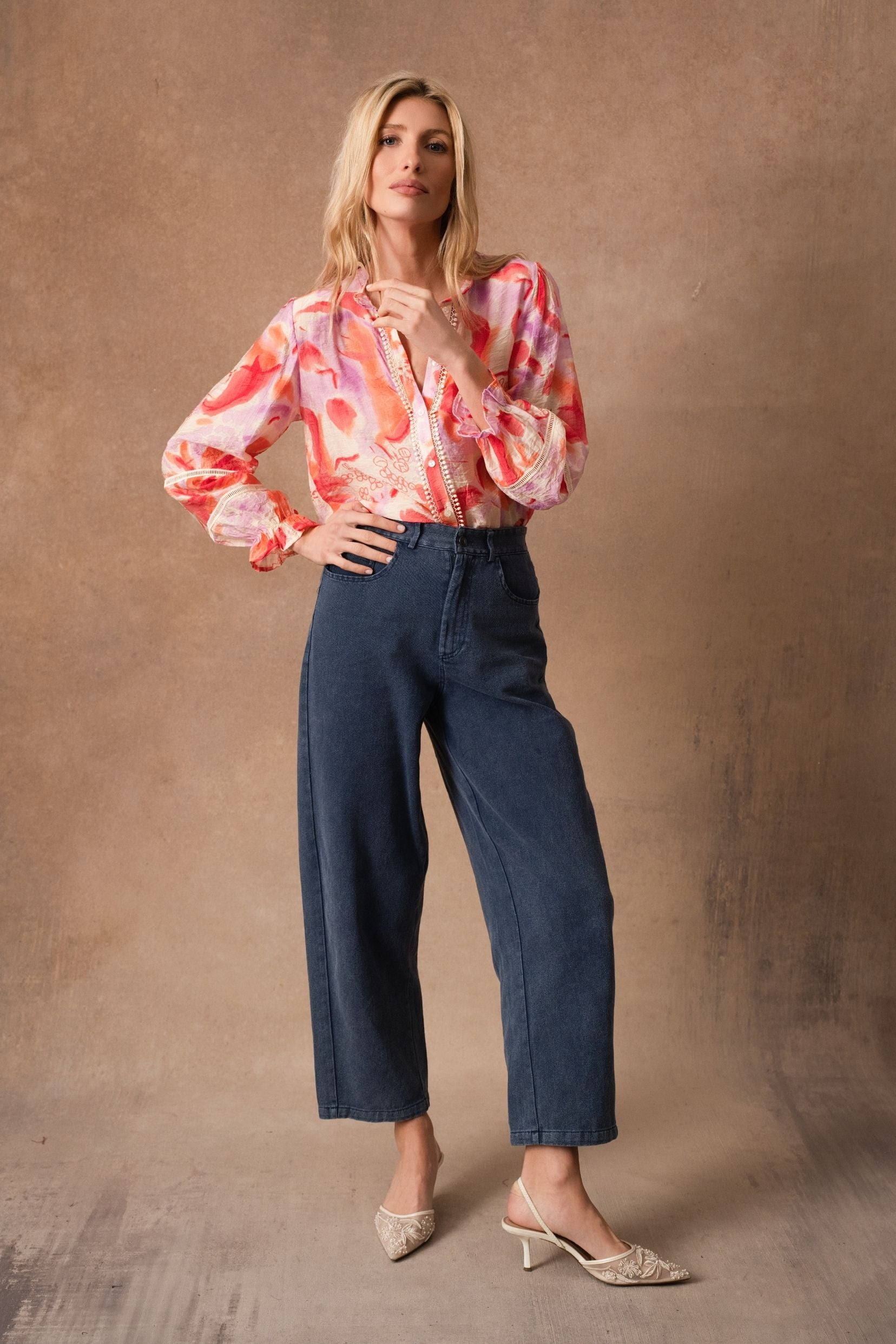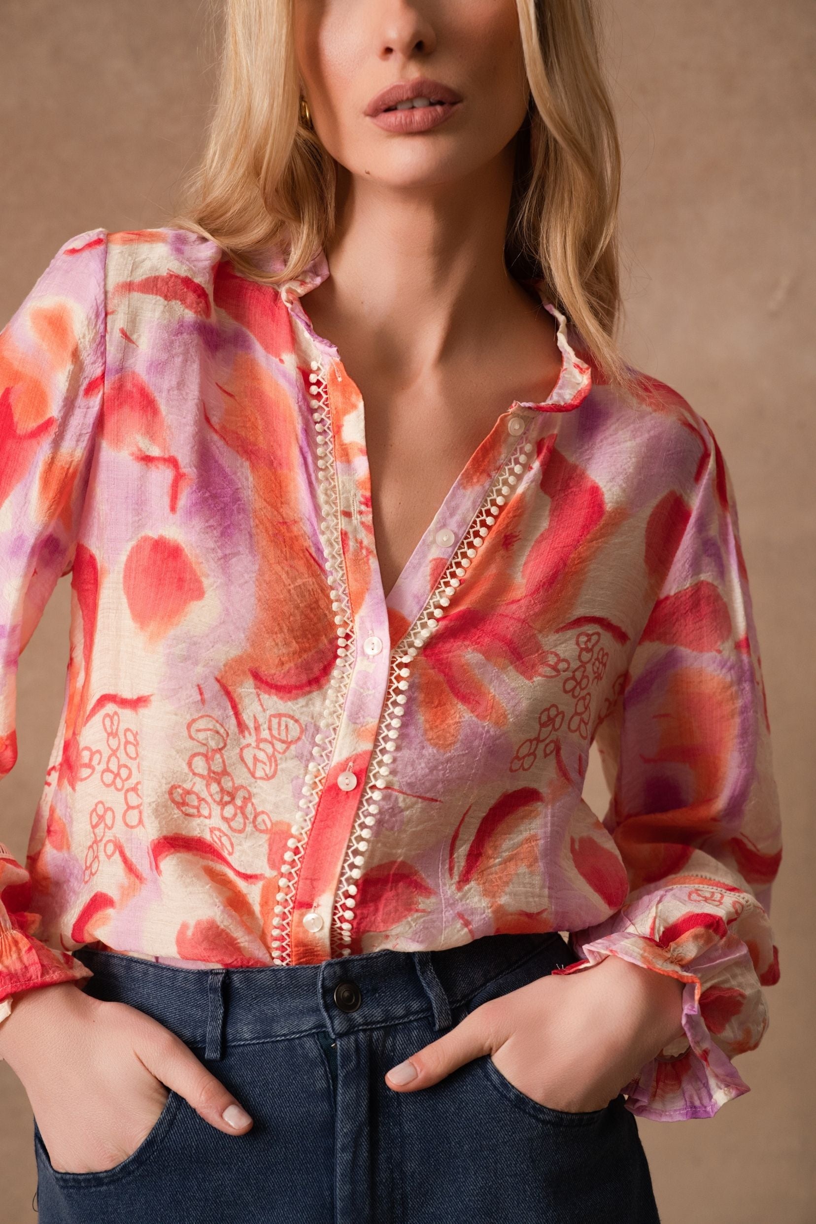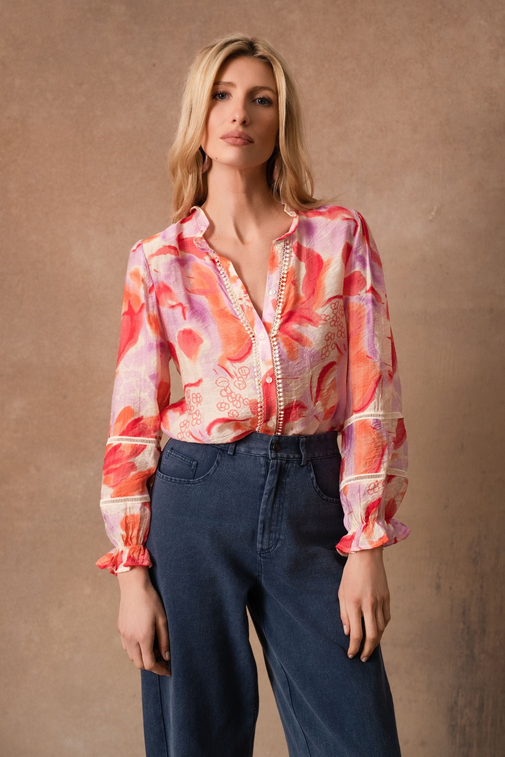 La blouse Roberte s’invite naturellement dans le vestiaire comme une pièce forte et délicate à la fois. Ses broderies symétriques dessinent la silhouette avec finesse, tandis que le col subtilement volanté et les manches à froufrous insufflent une touche de légèreté et de mouvement.