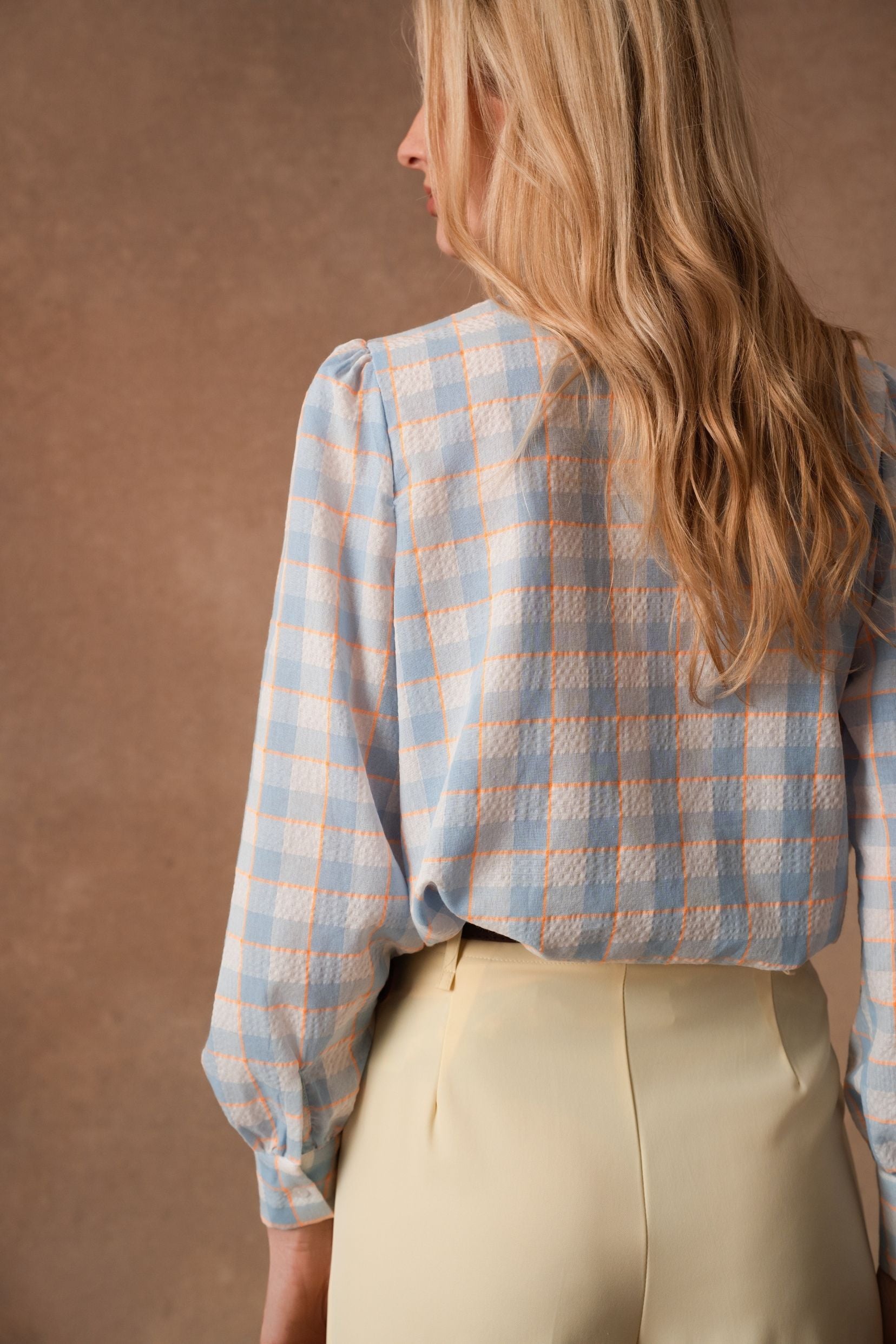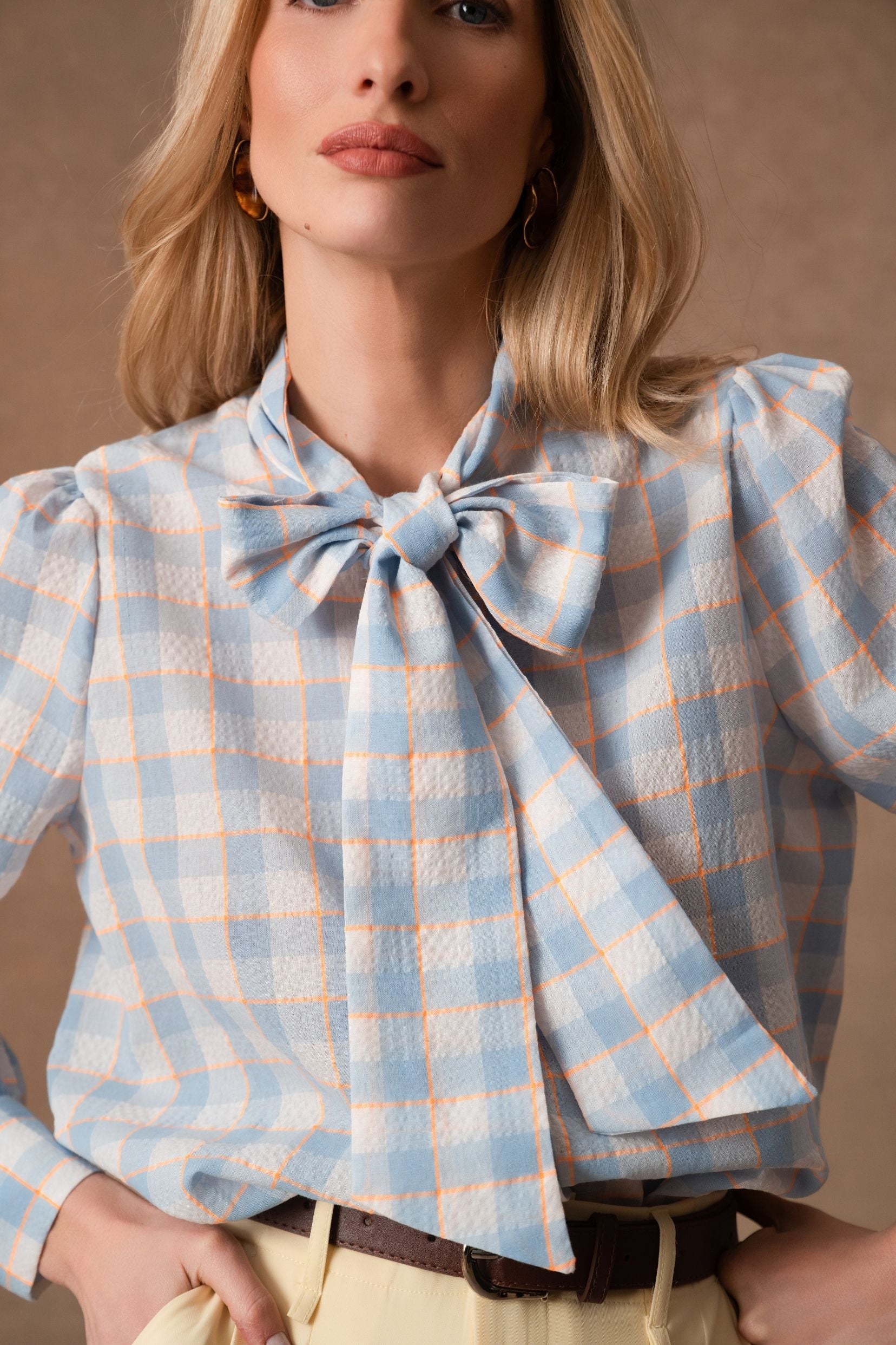 La chemise à carreaux Sybille revisite un grand classique du vestiaire avec modernité et délicatesse. Son col à lien à nouer et ses manches légèrement bouffantes, ponctuées de poignets boutonnés, insufflent une féminité subtile à la silhouette. La patte de boutonnage sur le devant structure l’ensemble avec justesse, tandis que sa matière mêlant coton, polyester et viscose offre confort et fluidité au quotidien.
