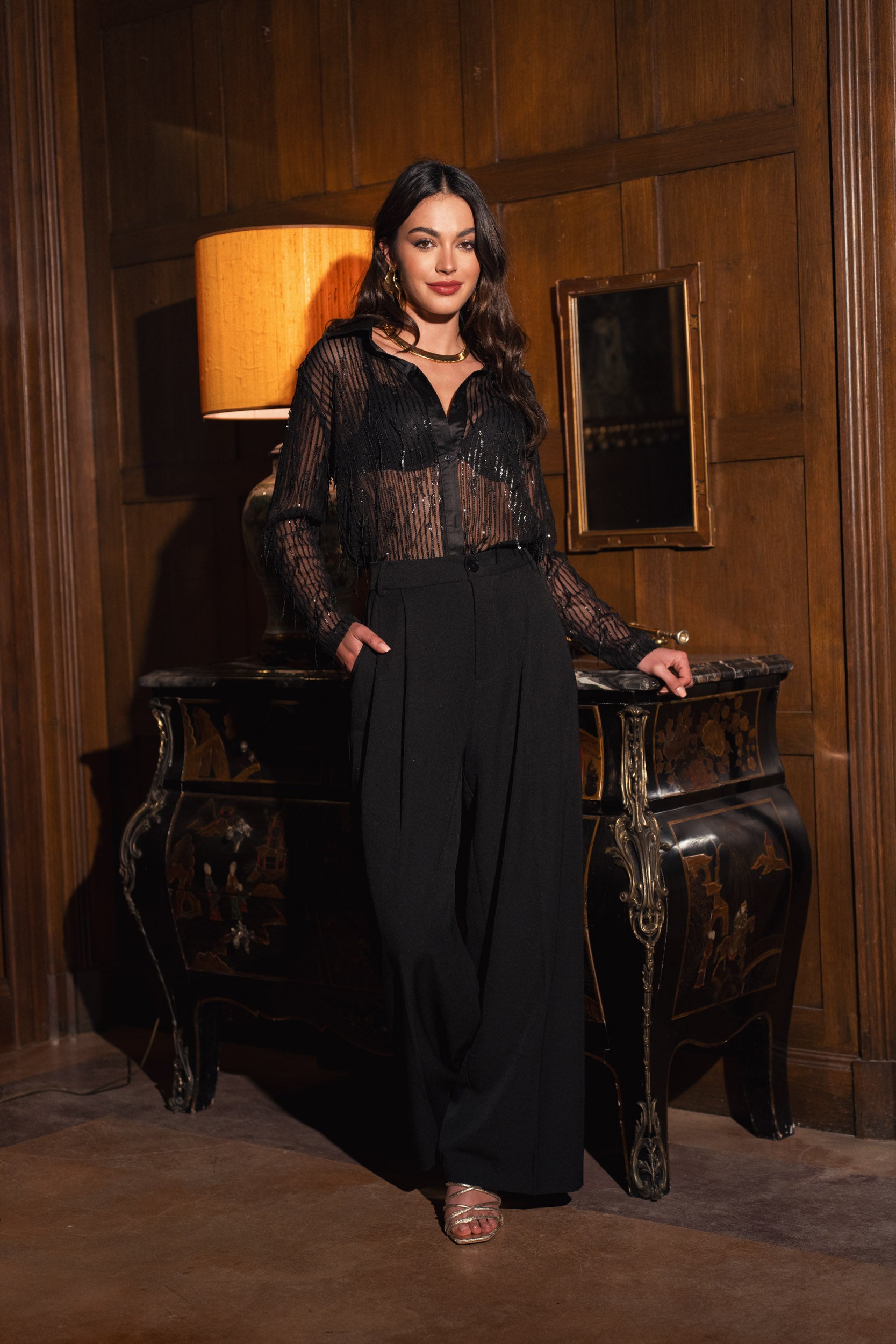 Pour un look élégant, associez-la à un pantalon taille haute et des escarpins pour souligner la silhouette. Pour un style plus audacieux, optez pour une jupe en cuir ou un pantalon en vinyle. Complétez avec des accessoires métalliques et des boucles d'oreilles délicates pour une touche glamour.