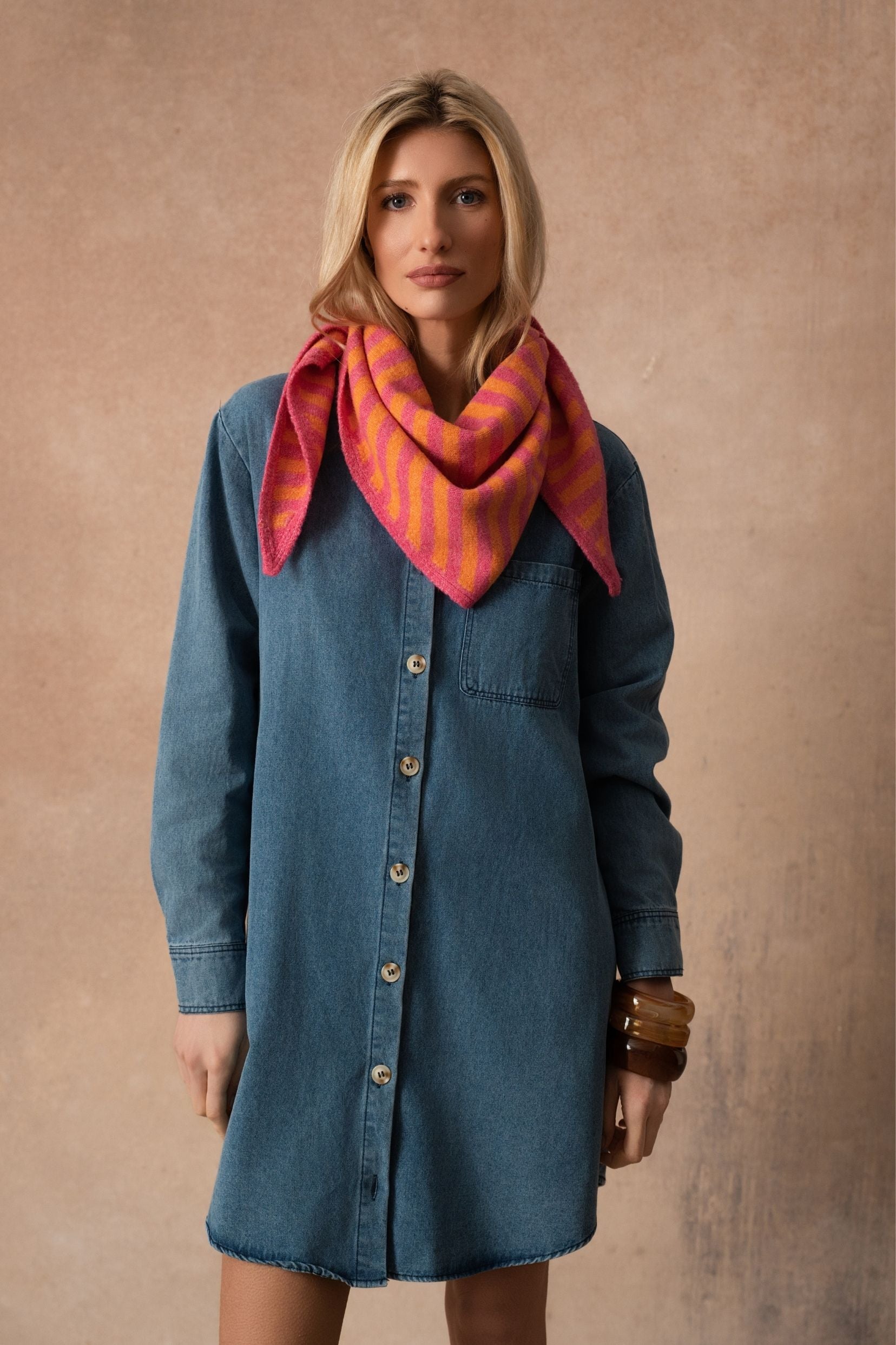 Sa maille enveloppante invite au confort, tandis que son format triangle permet de jouer avec les volumes et les nouages. Porté près du cou ou posé sur les épaules, Élio rose accompagne les journées avec douceur et légèreté. Une pièce réconfortante, pensée comme un petit geste de style au quotidien.