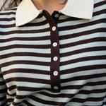 Alma, le pull rayé qui insuffle une touche rétro-chic à vos looks d’automne. Confectionné dans une maille douce, il se distingue par son col polo en contraste et sa patte de boutonnage qui structure la silhouette.