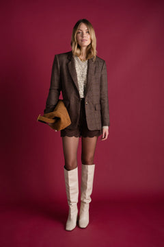 Avec ses manches légèrement bouffantes et sa coupe raccourcie, Ophélie dessine une silhouette féminine, moderne et résolument festive.