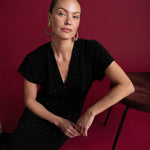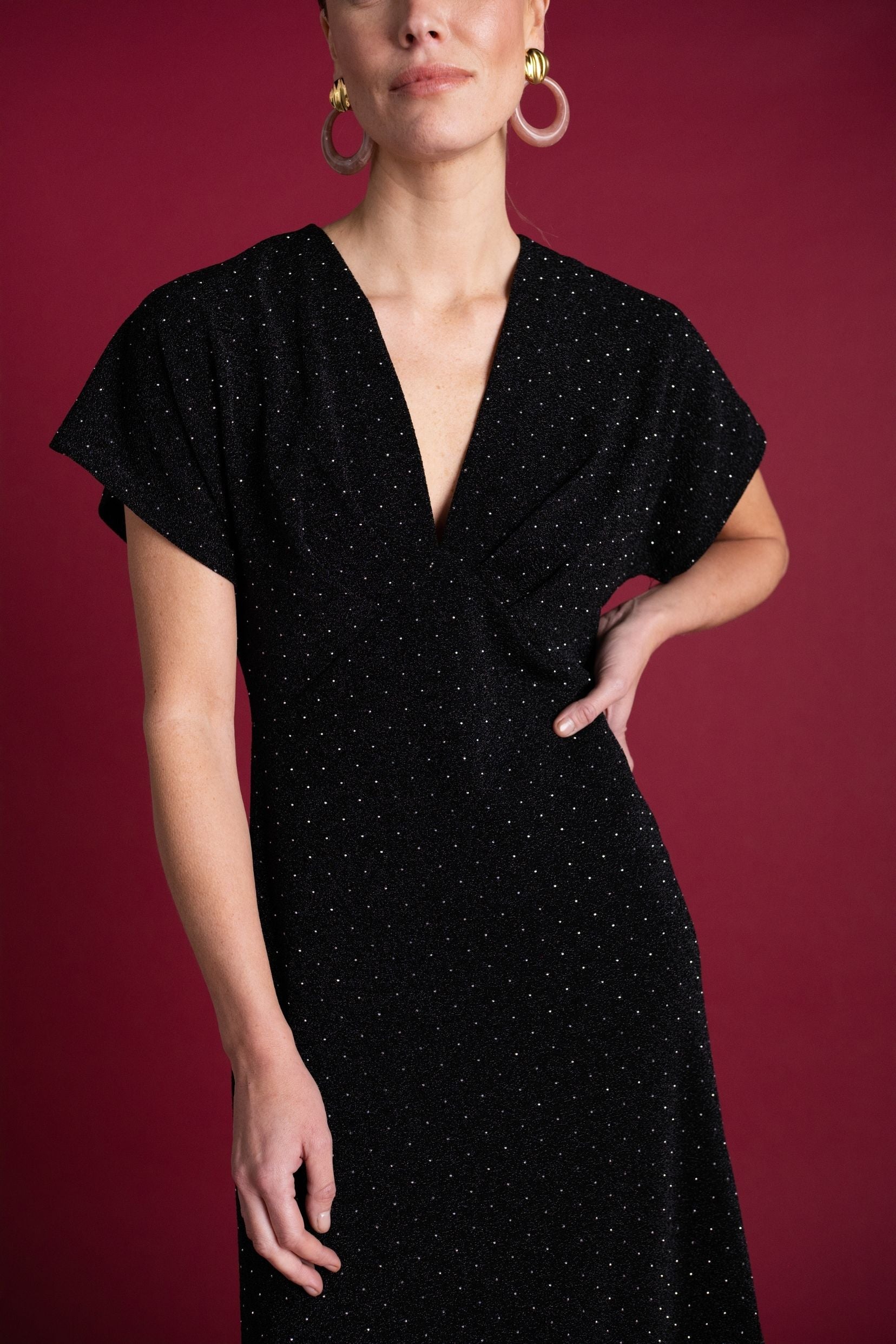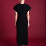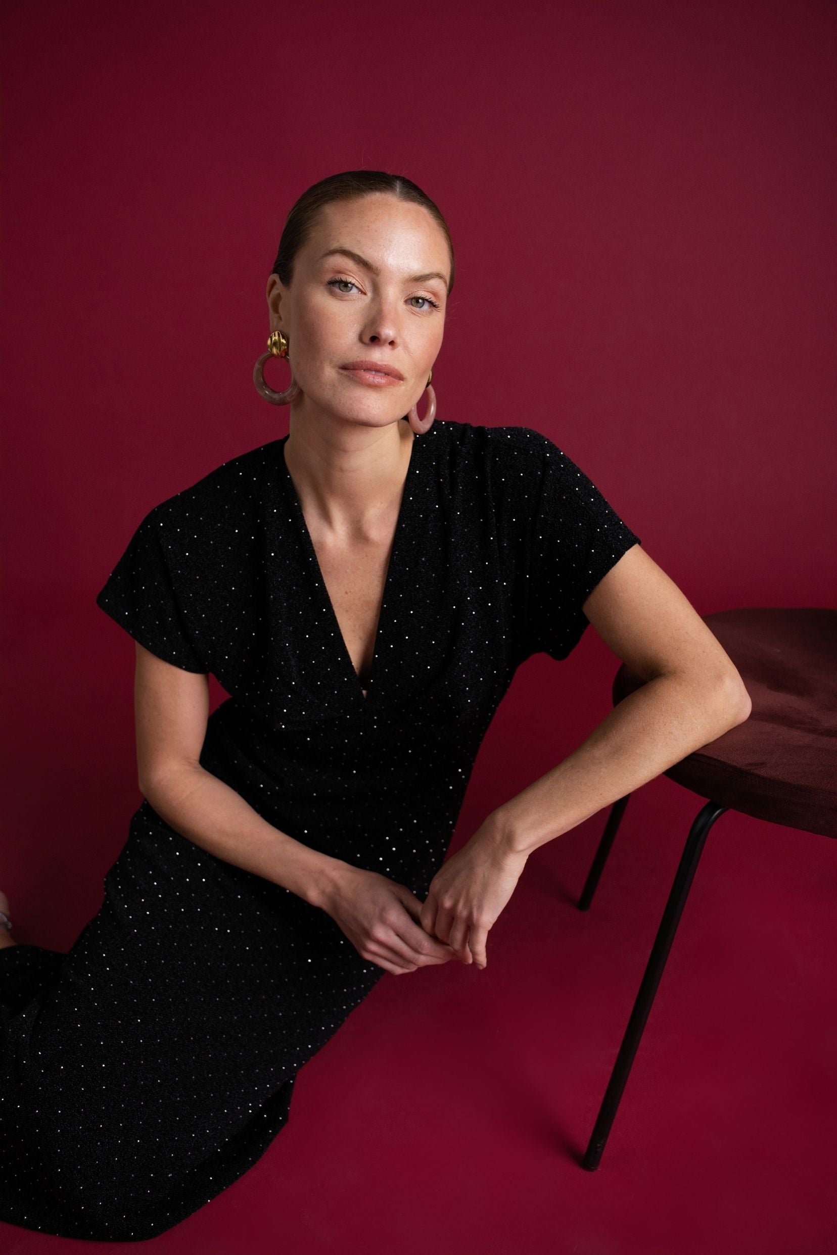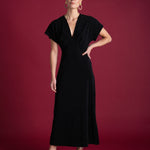Sa coupe longue structure l’allure, tandis que son décolleté en V vient sublimer la féminité avec justesse. Les manches papillon apportent une fluidité aérienne, donnant à la robe cet esprit élégant et moderne qui signe l’ADN de Kilky Paris.
