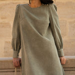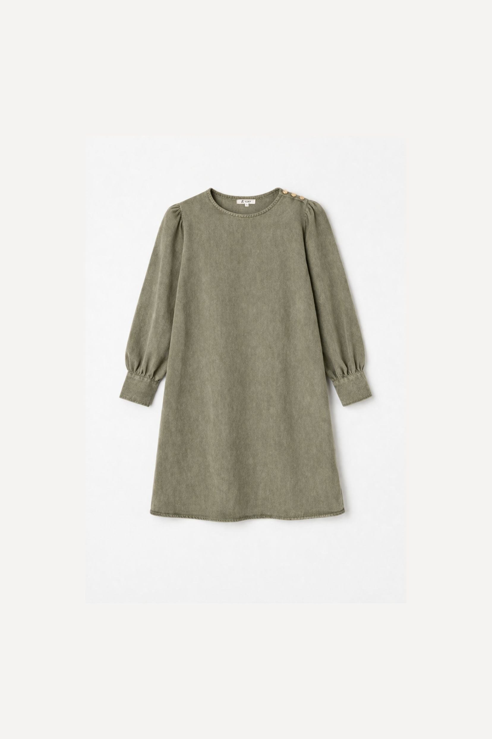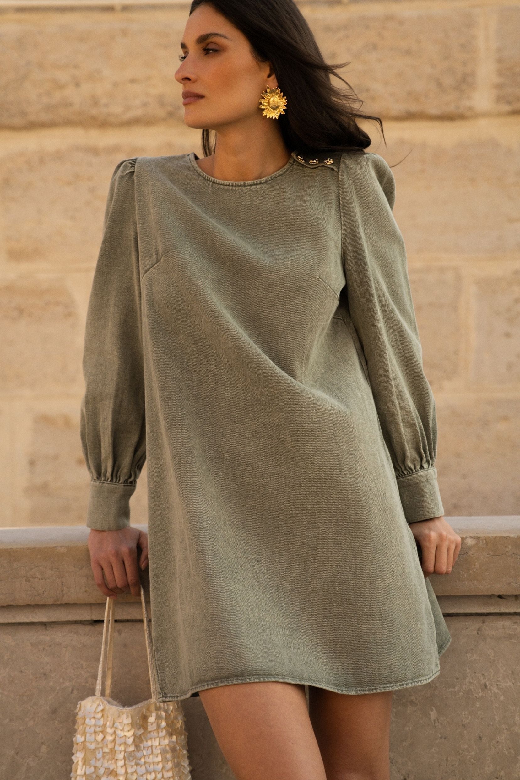 Cette robe courte en denim revisite l’essentiel dans une teinte kaki douce et naturelle. Une couleur subtile, inspirée du vestiaire utilitaire, qui apporte du caractère tout en restant facile à porter au quotidien.