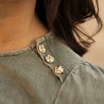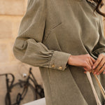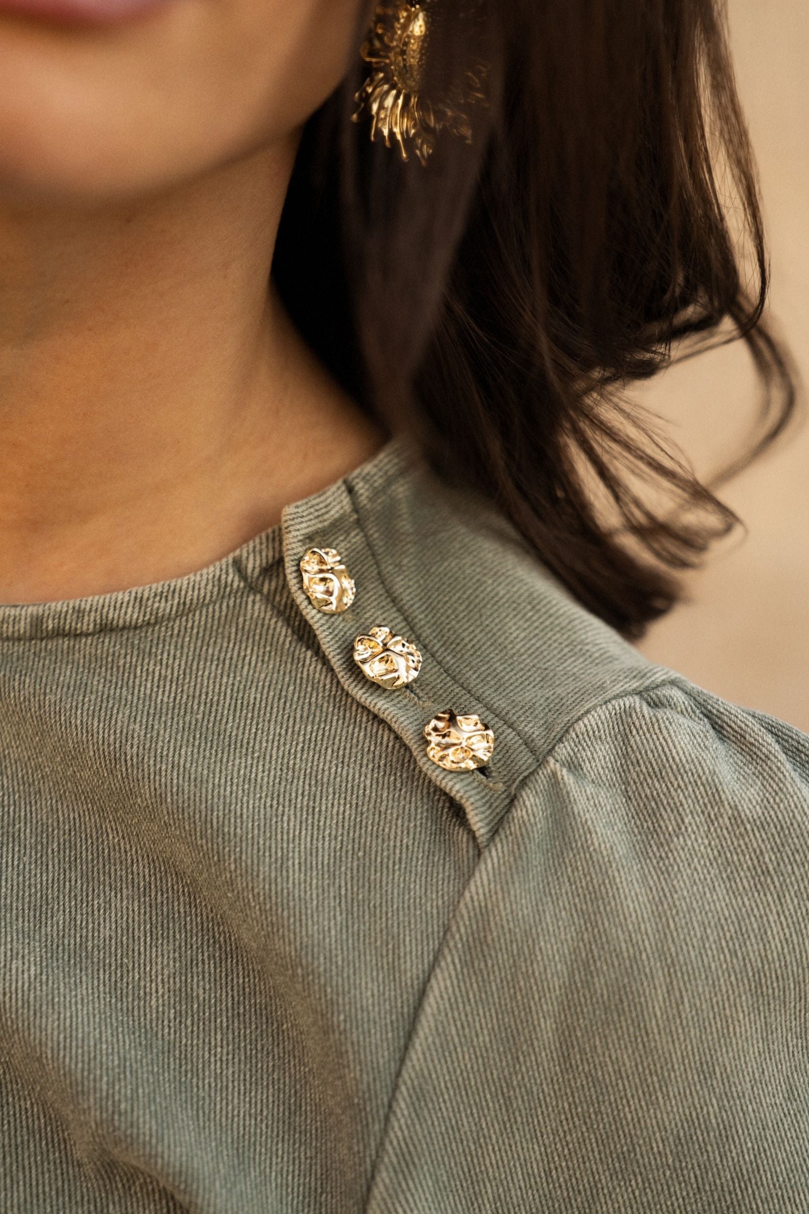 Son col rond dessine une ligne épurée, tandis que les boutons dorés sur l’épaule ajoutent ce détail délicat qui signe la pièce. Entre simplicité et élégance, elle trouve le juste équilibre.